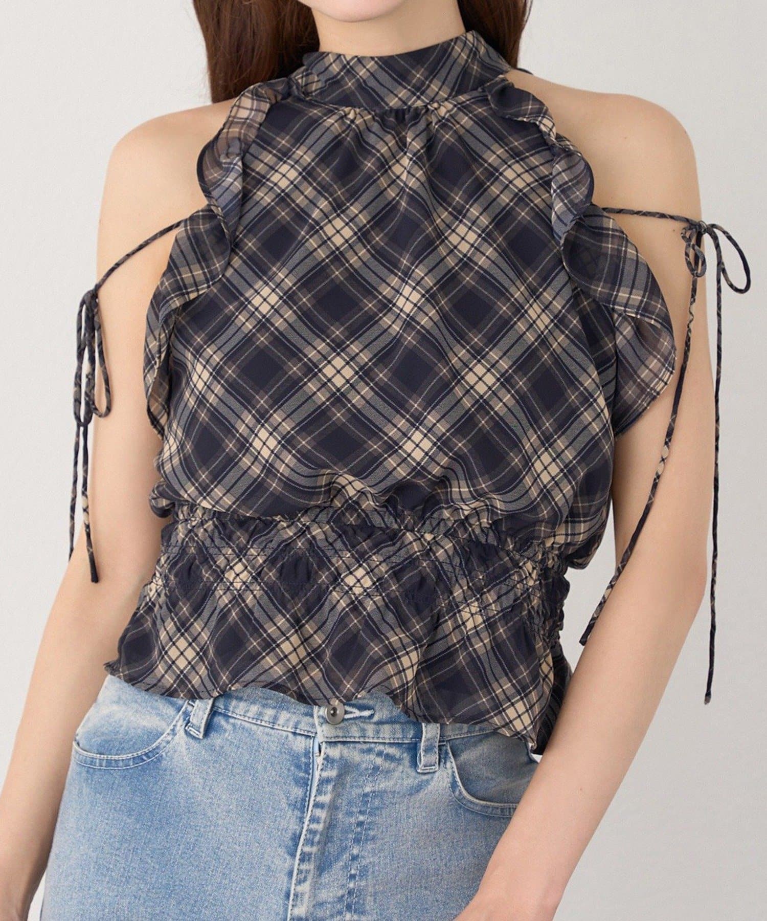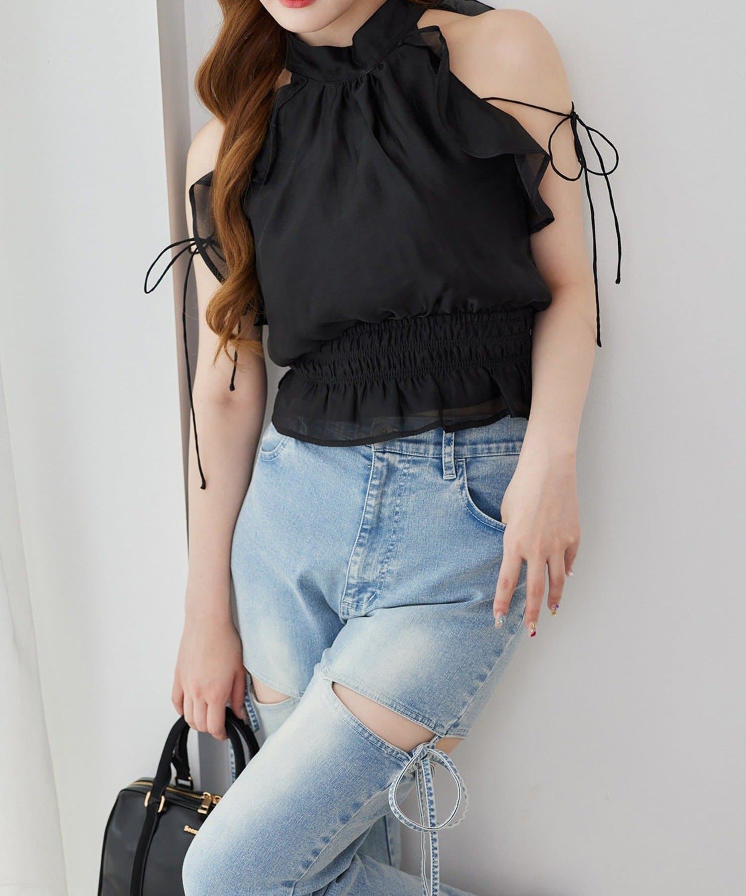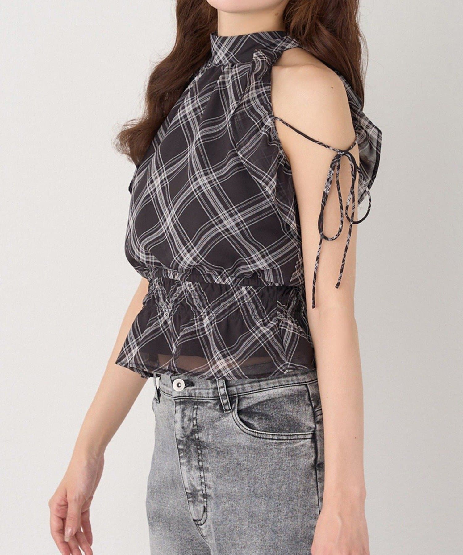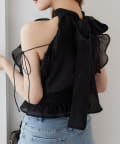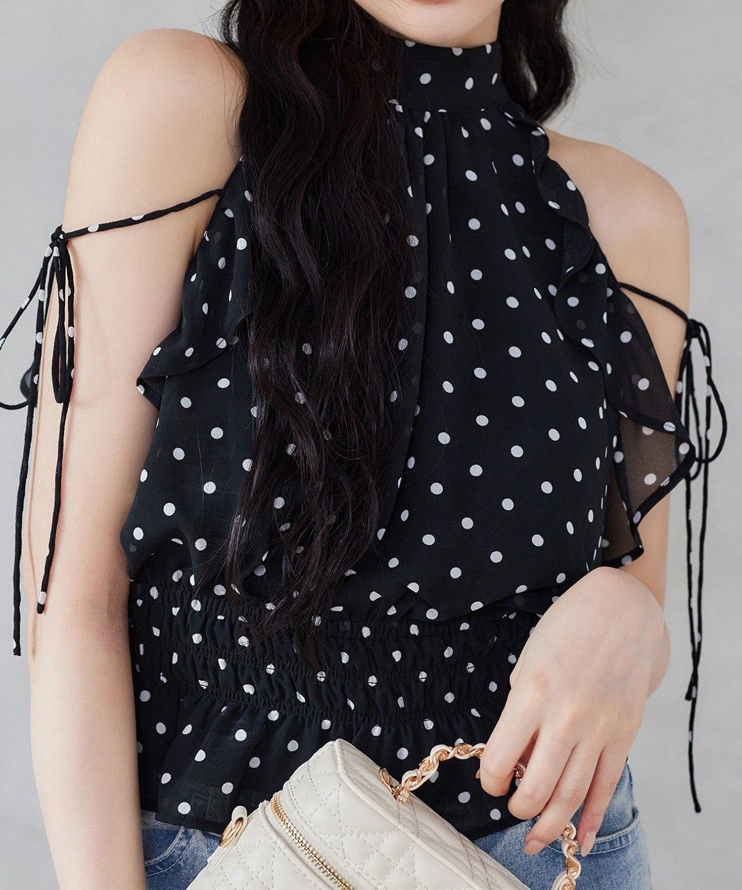可愛らしさとフェミニンな印象を与えるノースリーブブラウス。