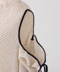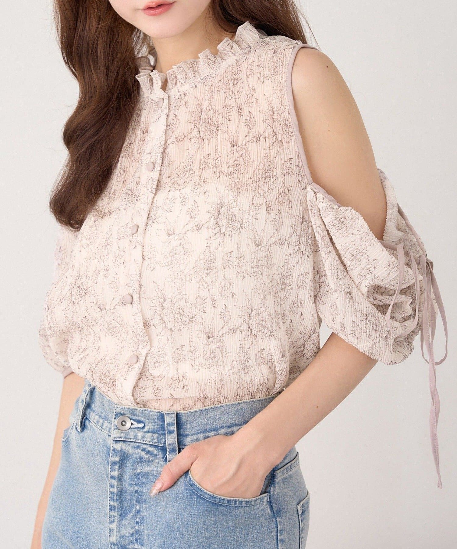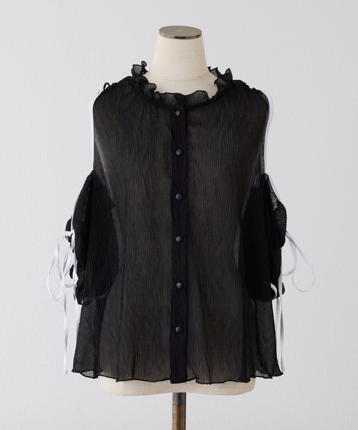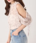 袖に紐は通しているので、肩リボンを絞って結ぶことで、肩の開き具合を調節可能。