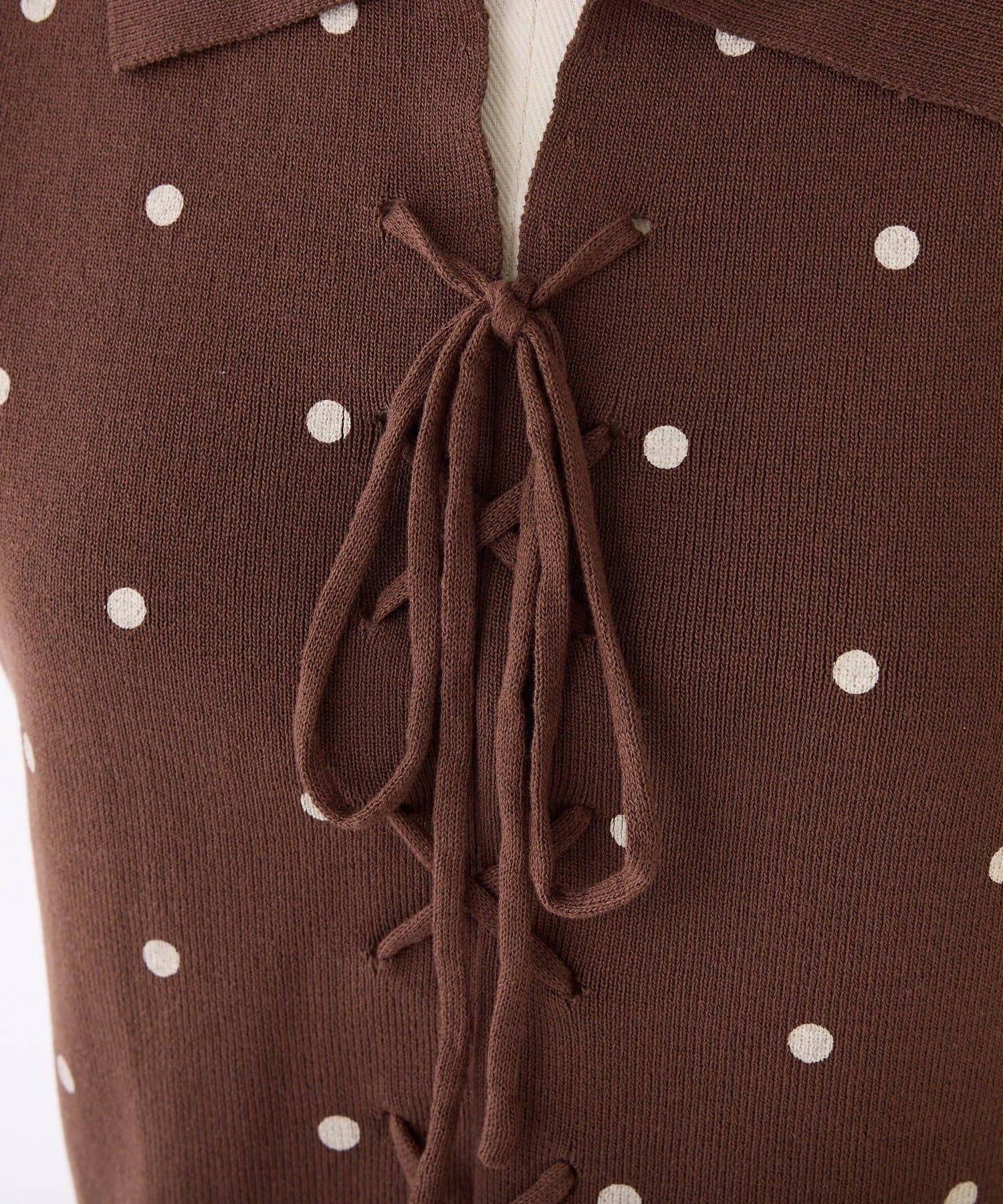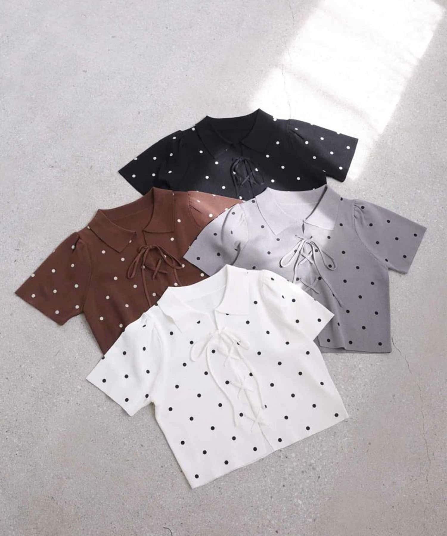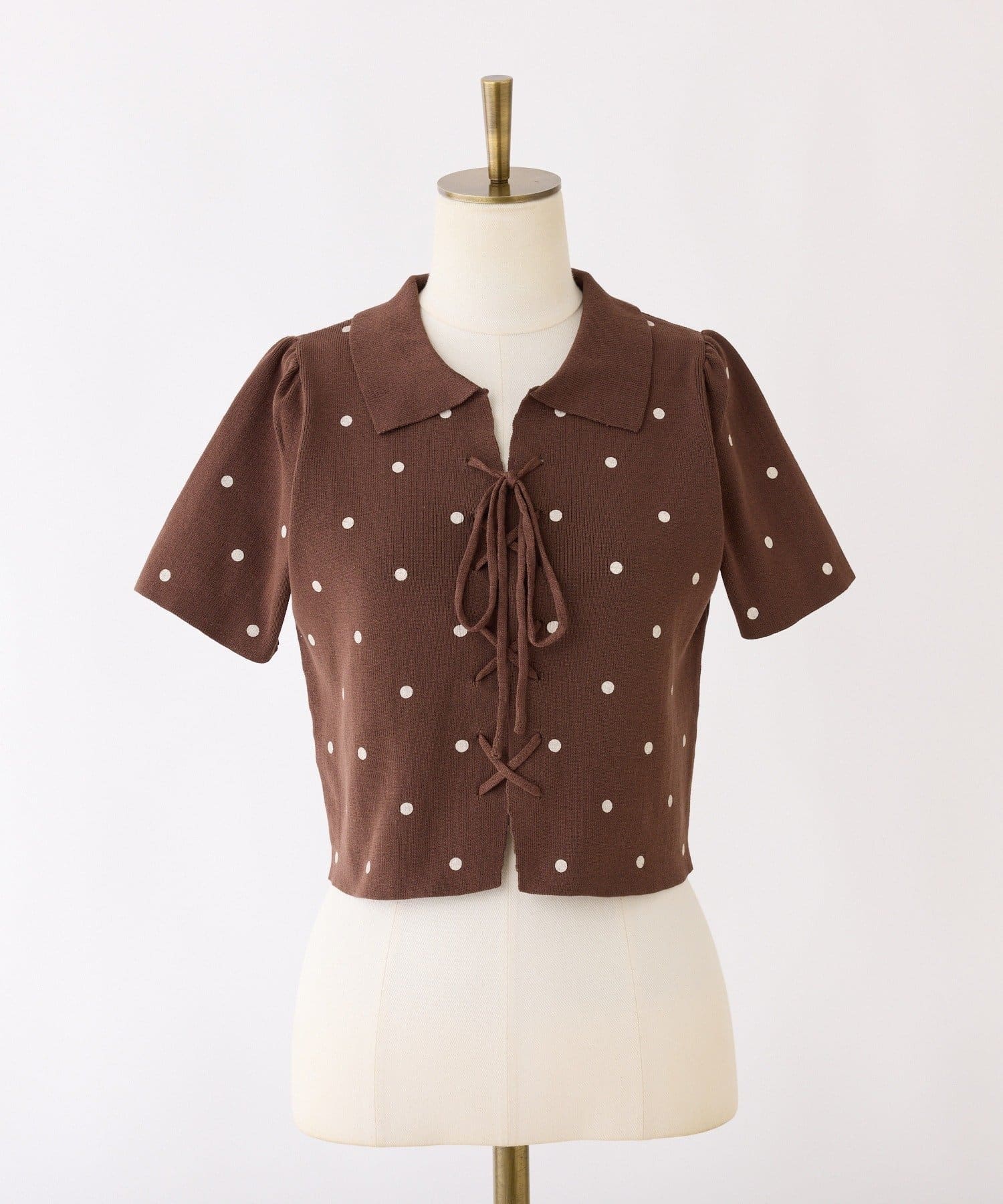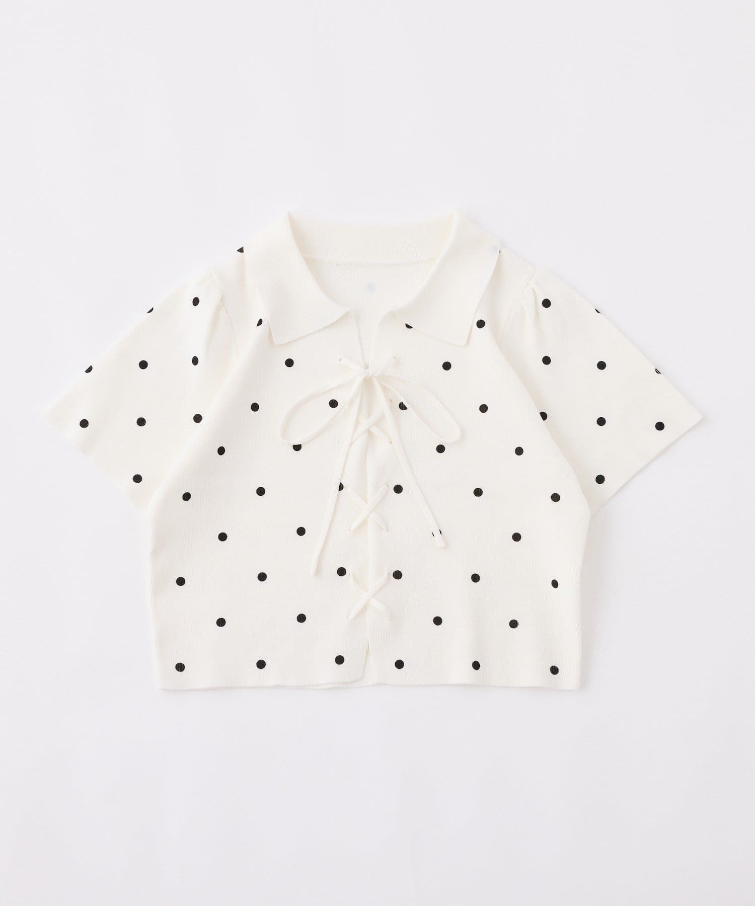 クラシカルなドット柄のニットに襟を合わせた甘さたっぷりの一枚。