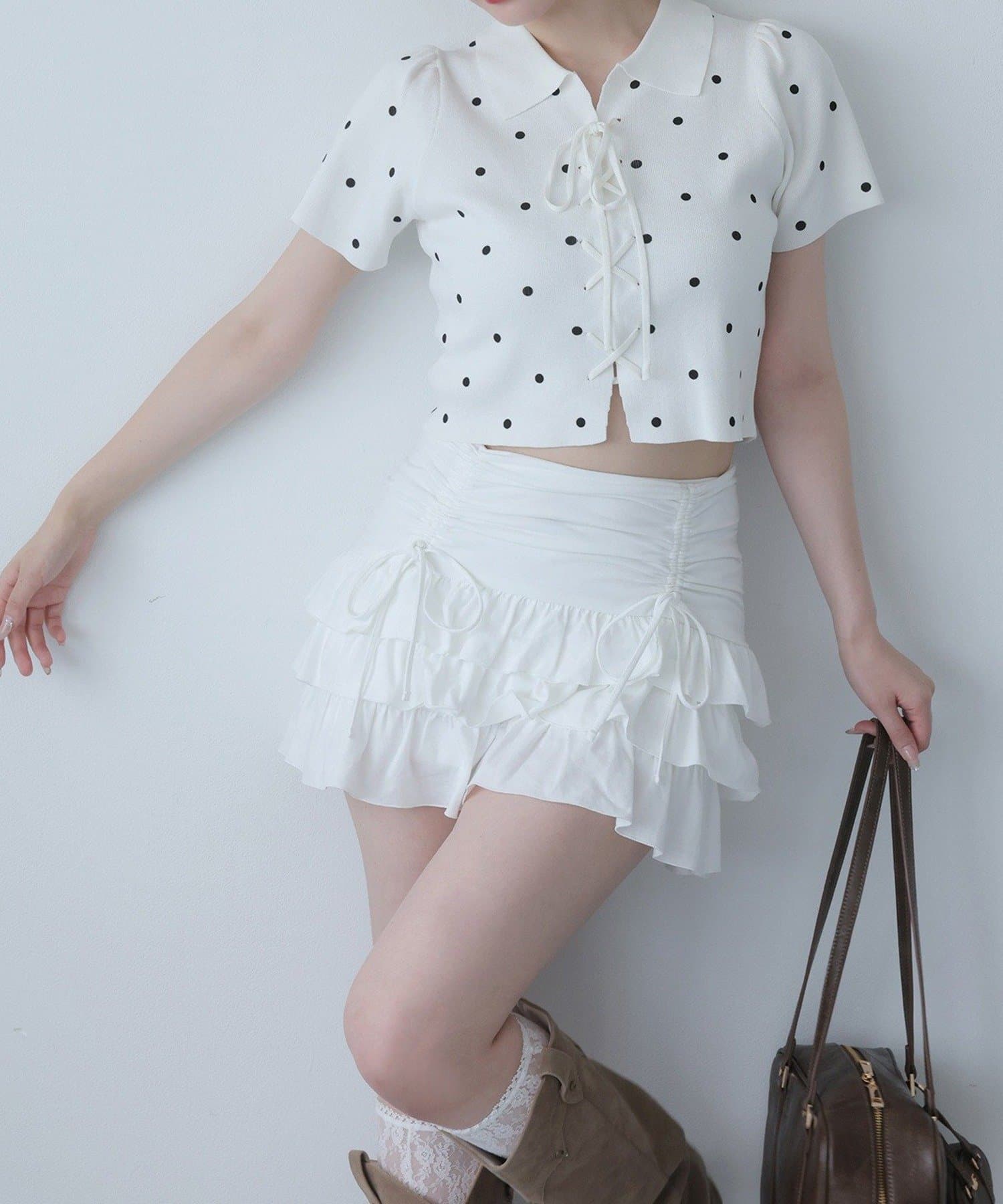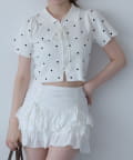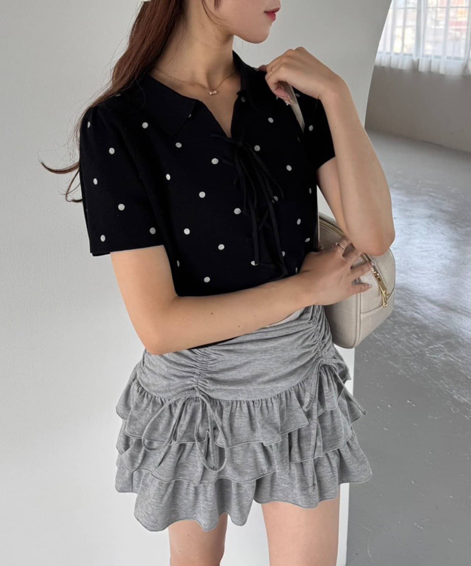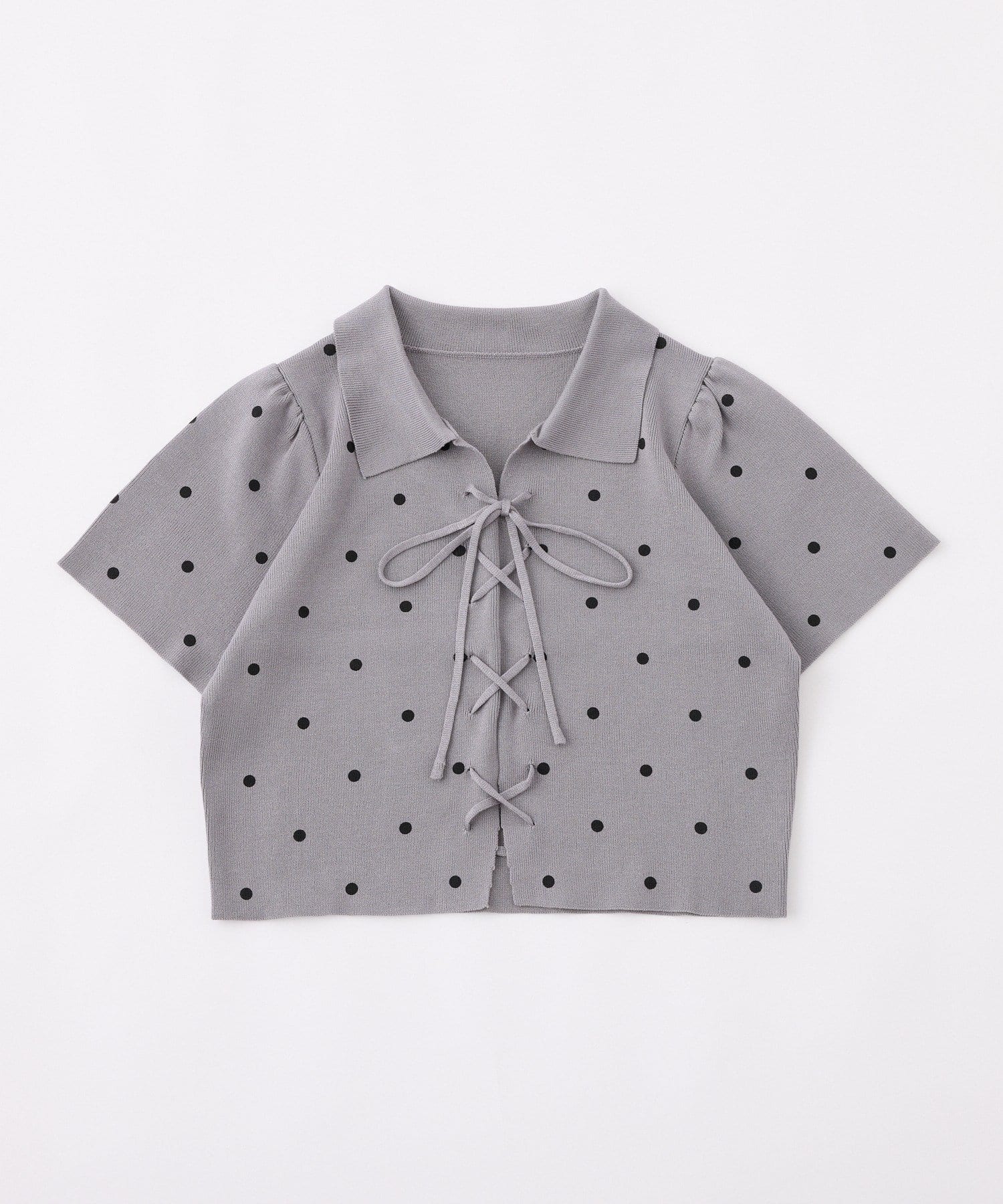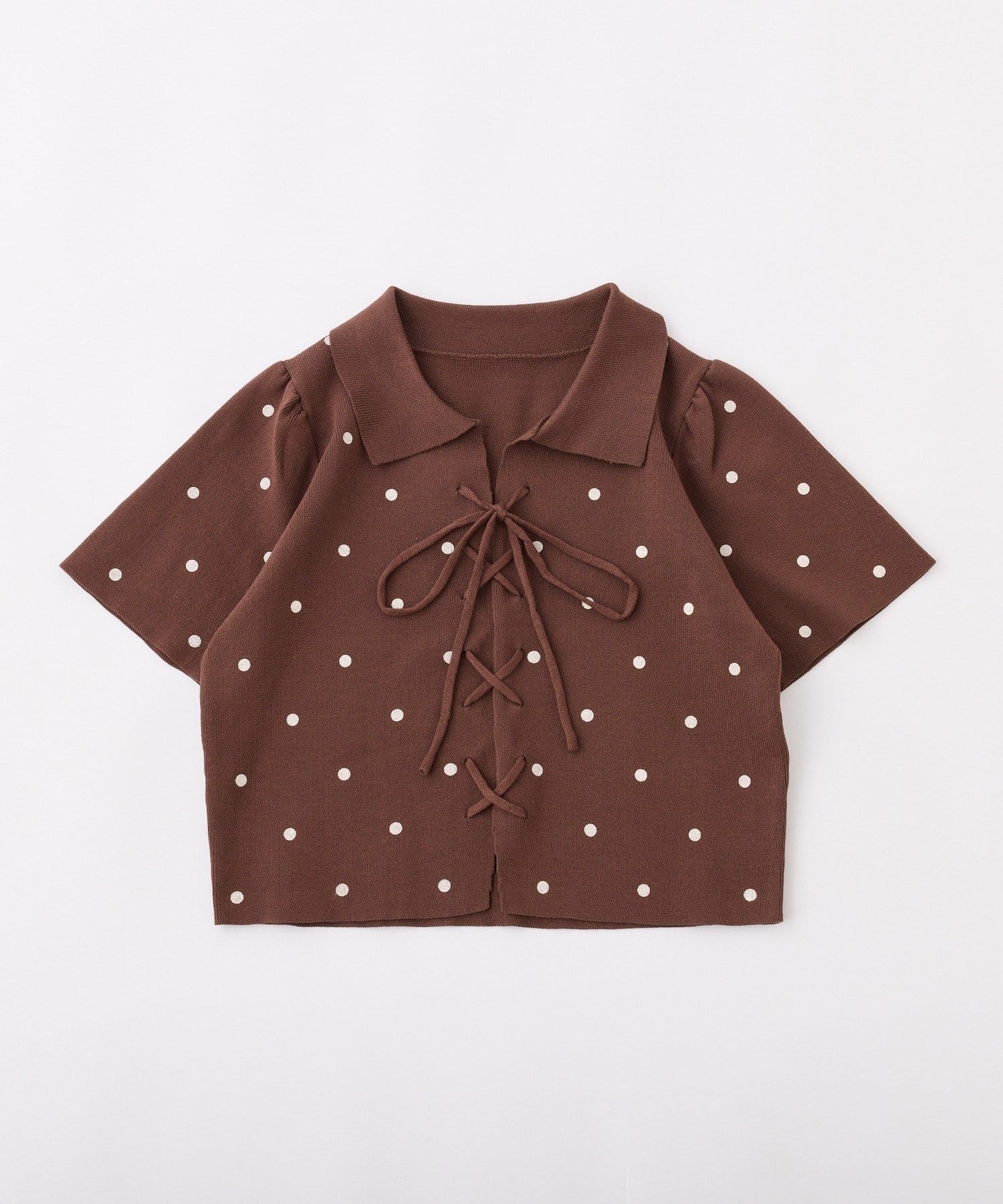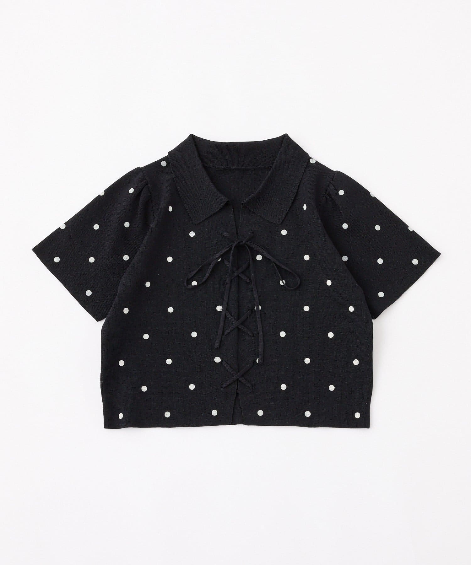 クラシカルなドット柄のニットに襟を合わせた甘さたっぷりの一枚。