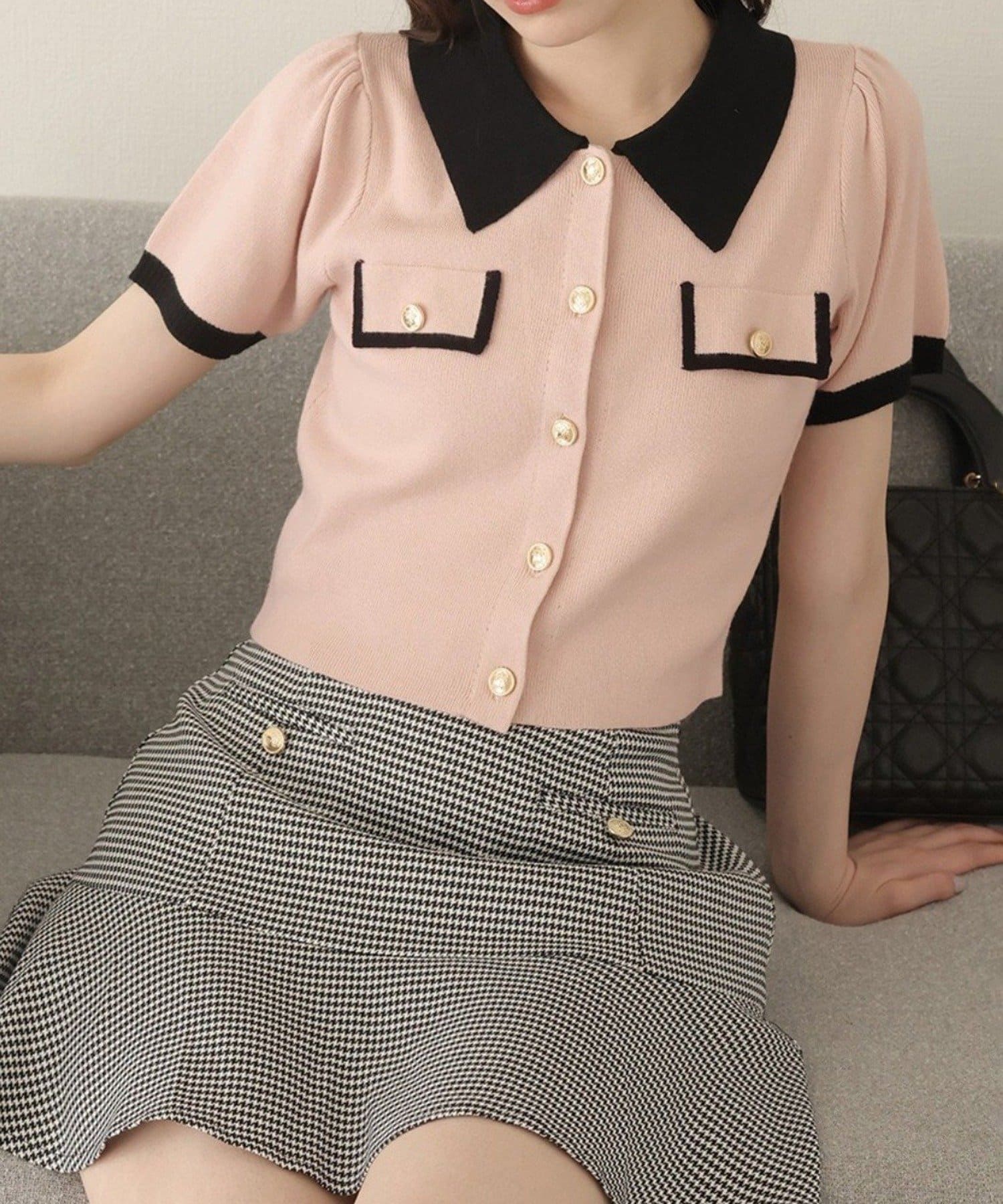 襟付きのデザインと配色が目を惹く、クラシカルムード漂う半袖ニットトップス。