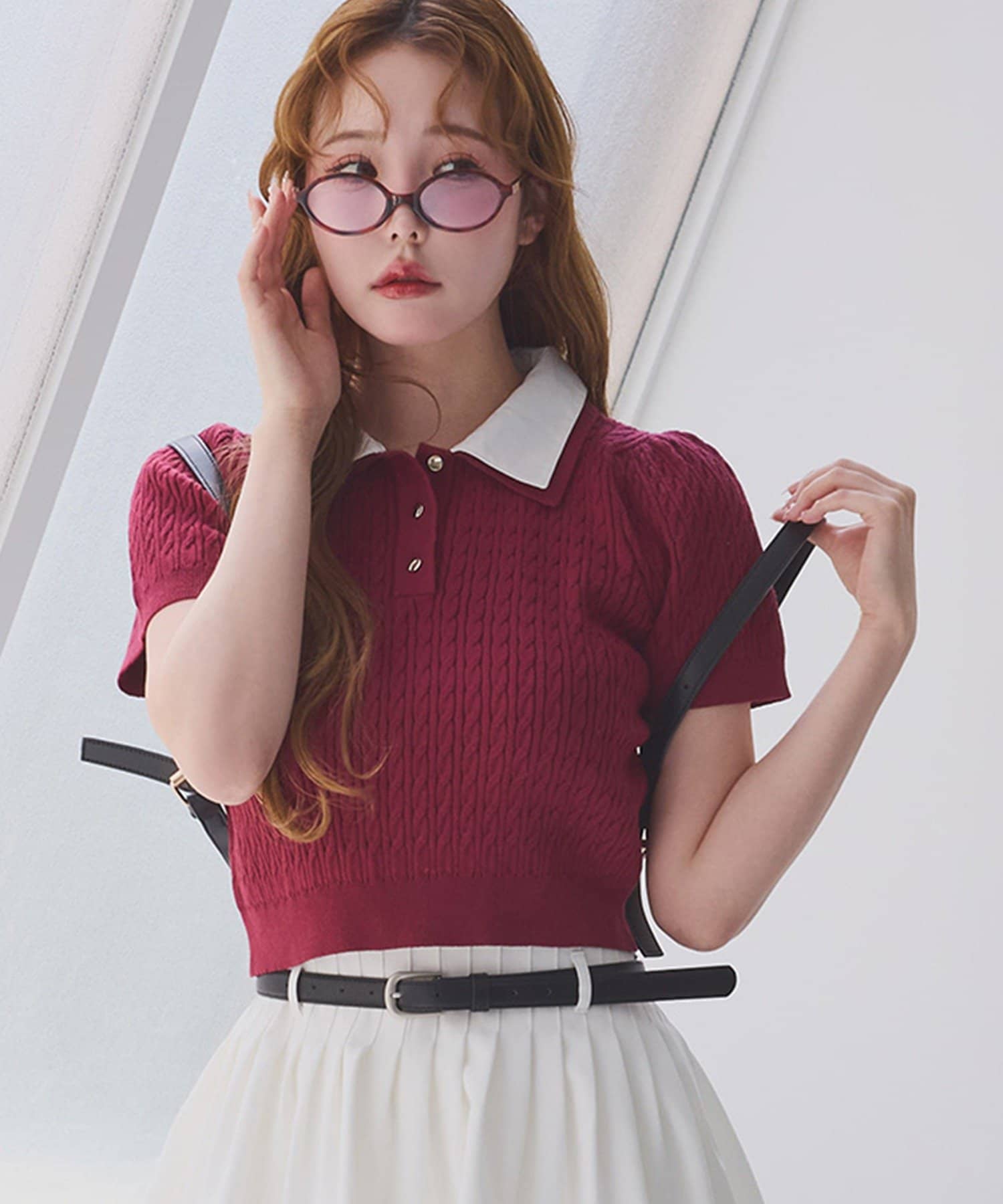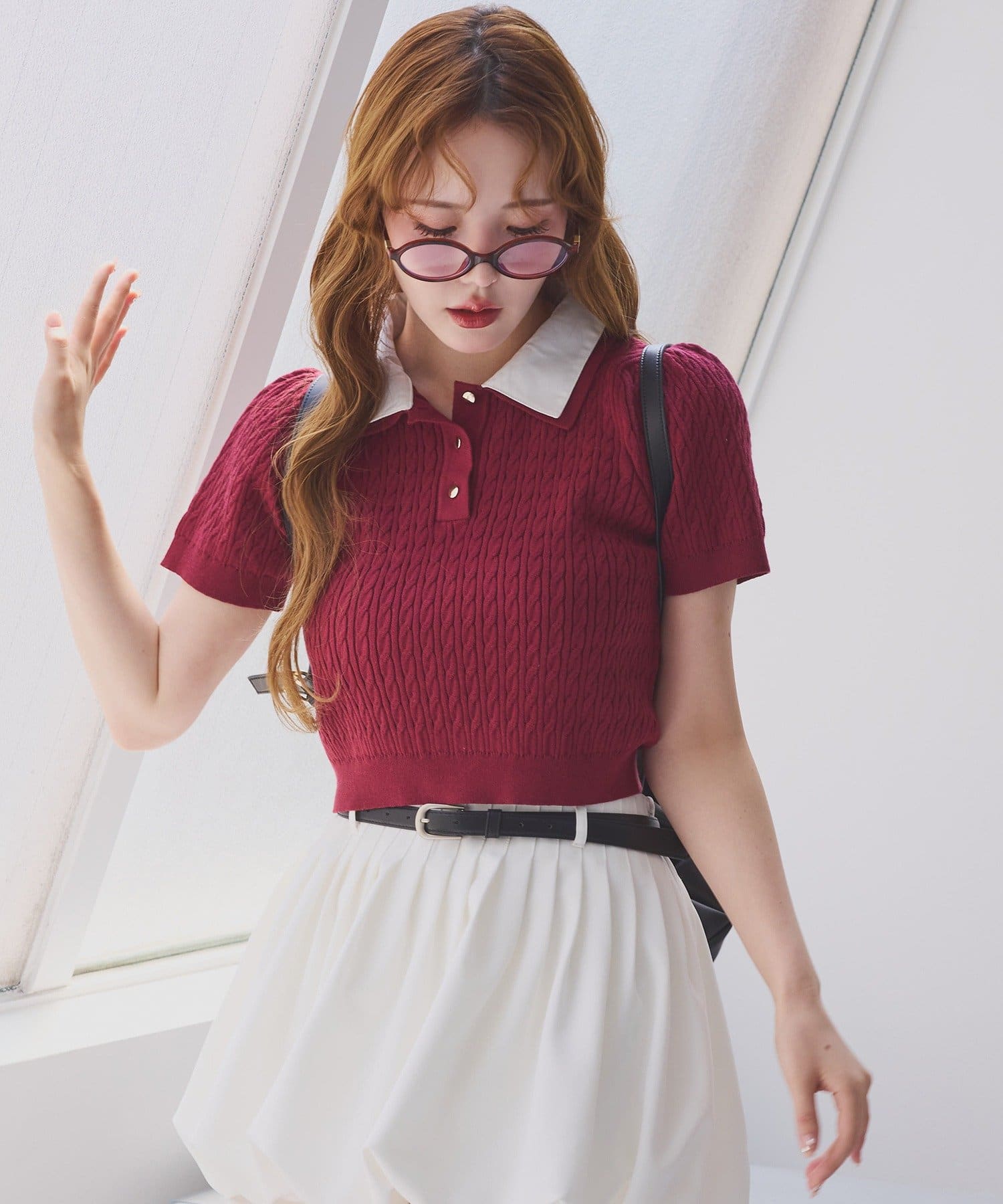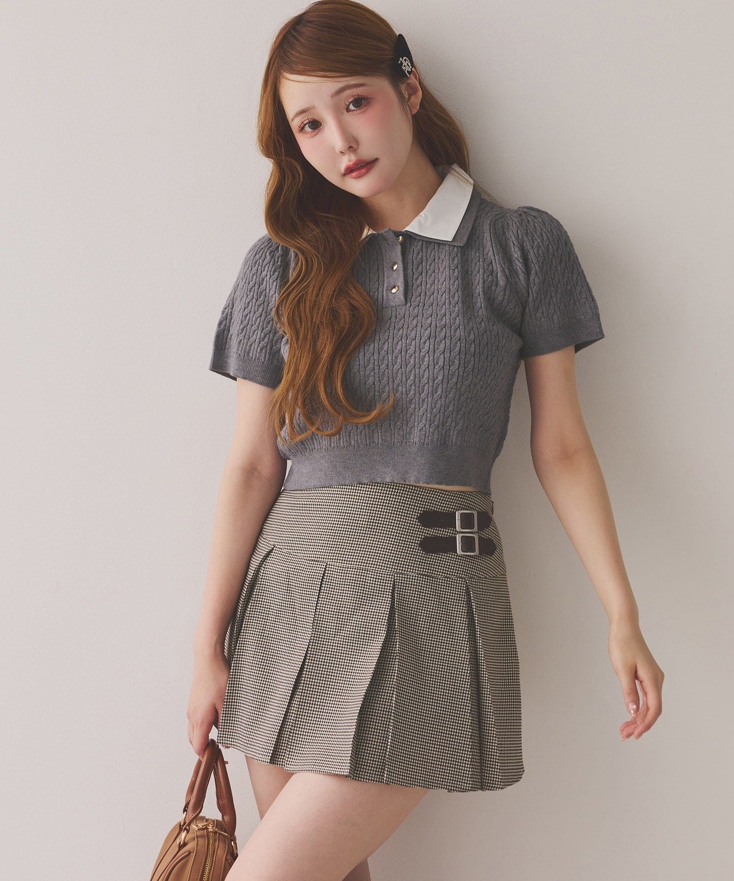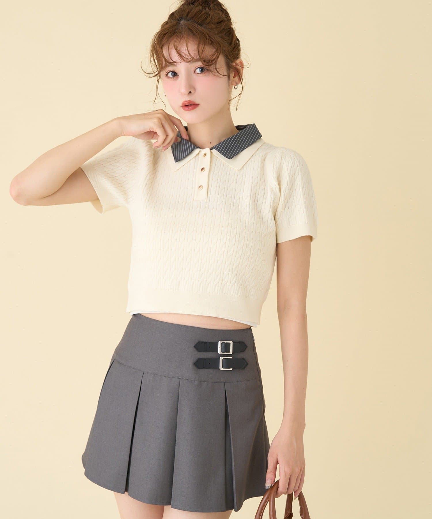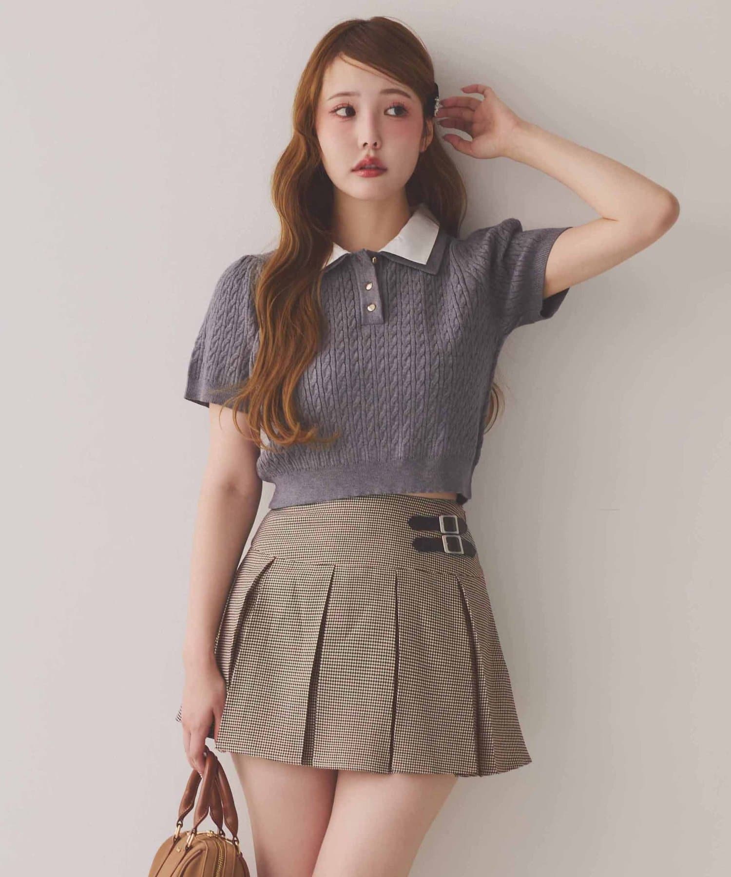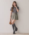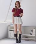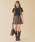 プリーツスカートなどのミニボトムでの合わせがオススメ。