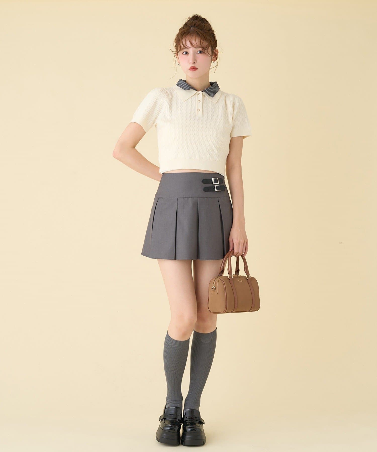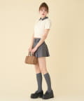 プリーツスカートなどのミニボトムでの合わせがオススメ。