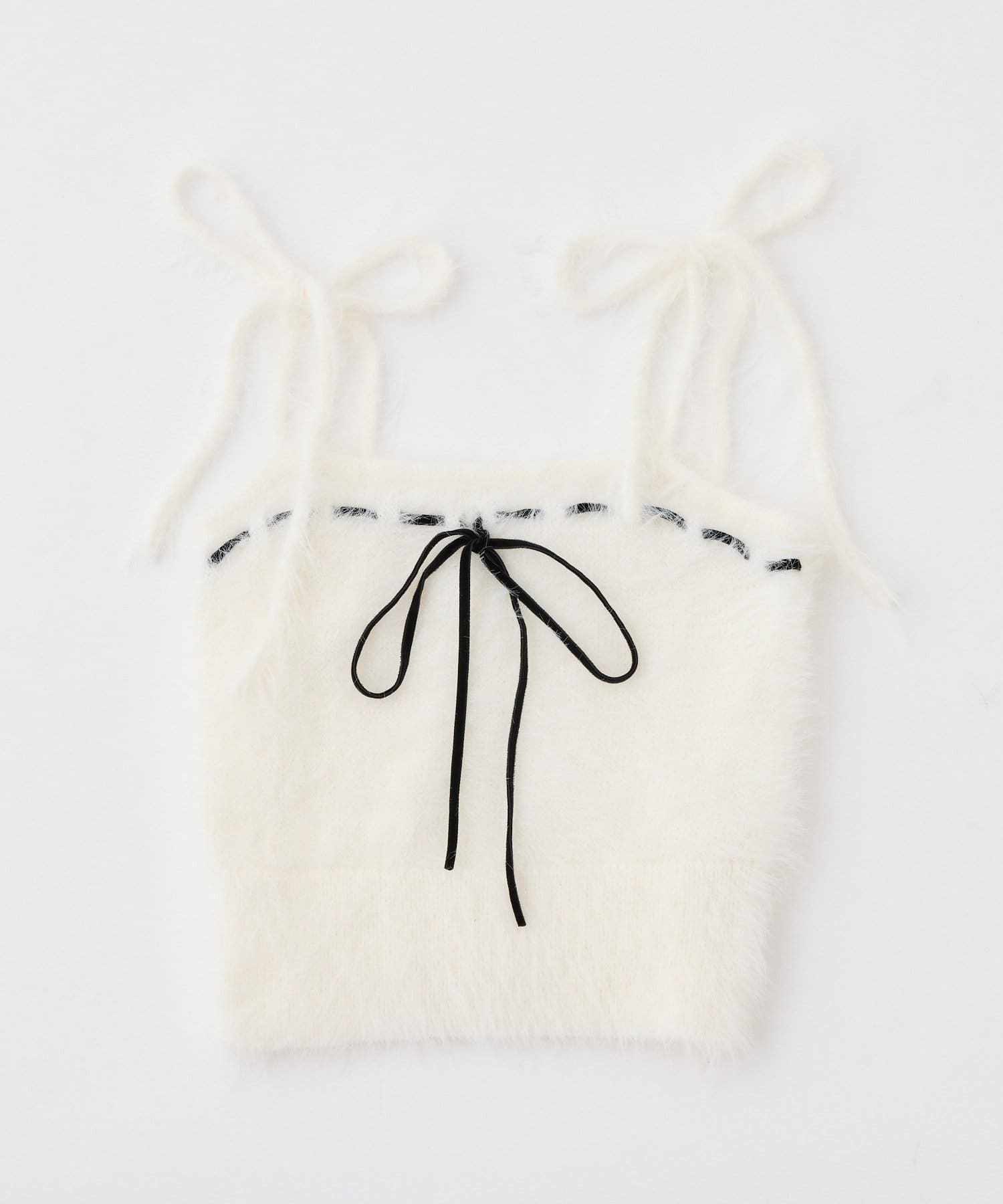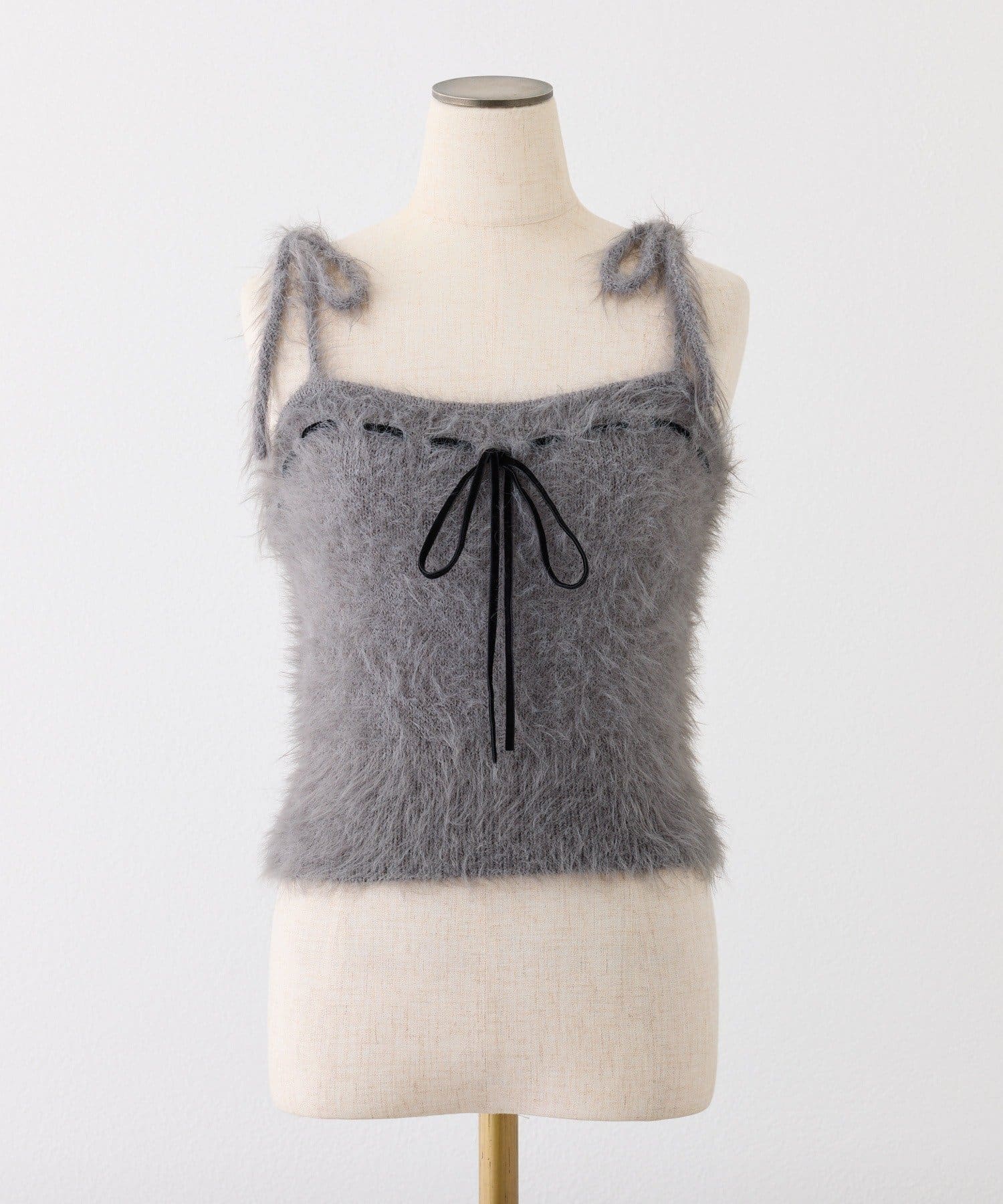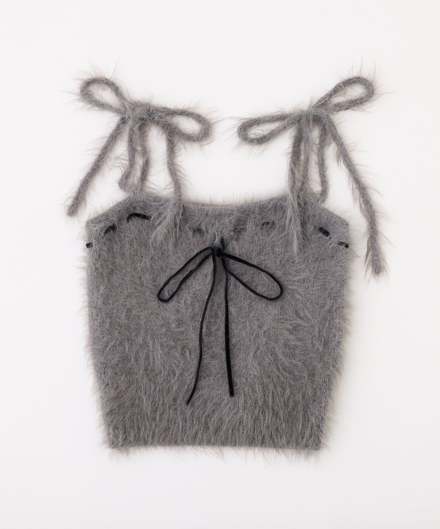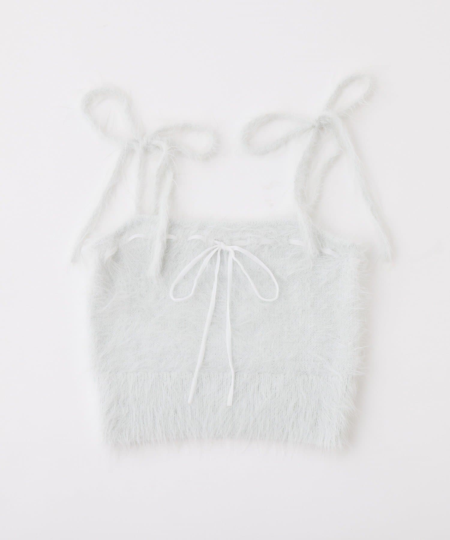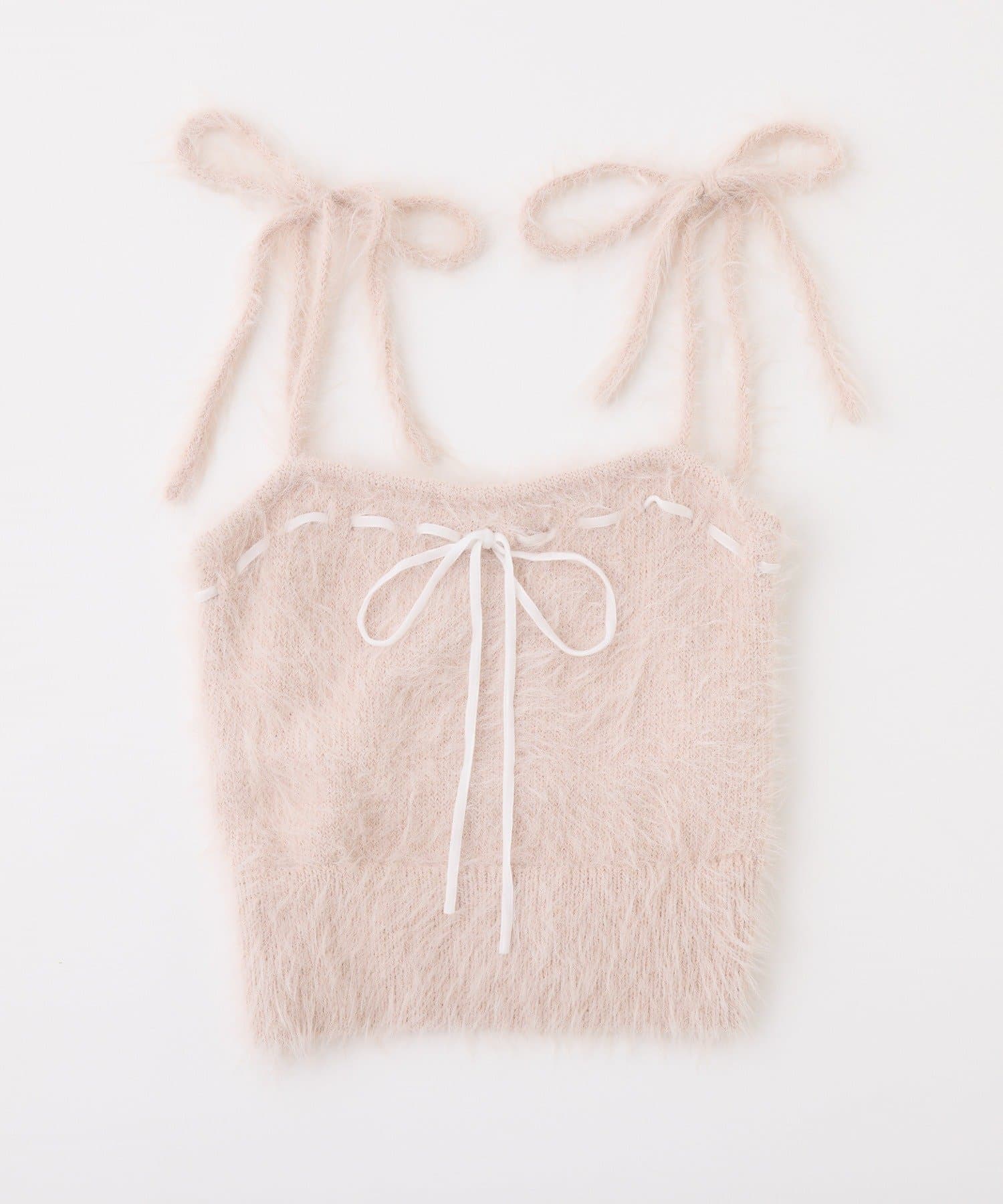 ふわふわなフェザーニット素材と、フロントのリボンが目を引くキャミトップス。