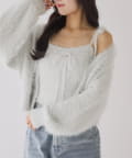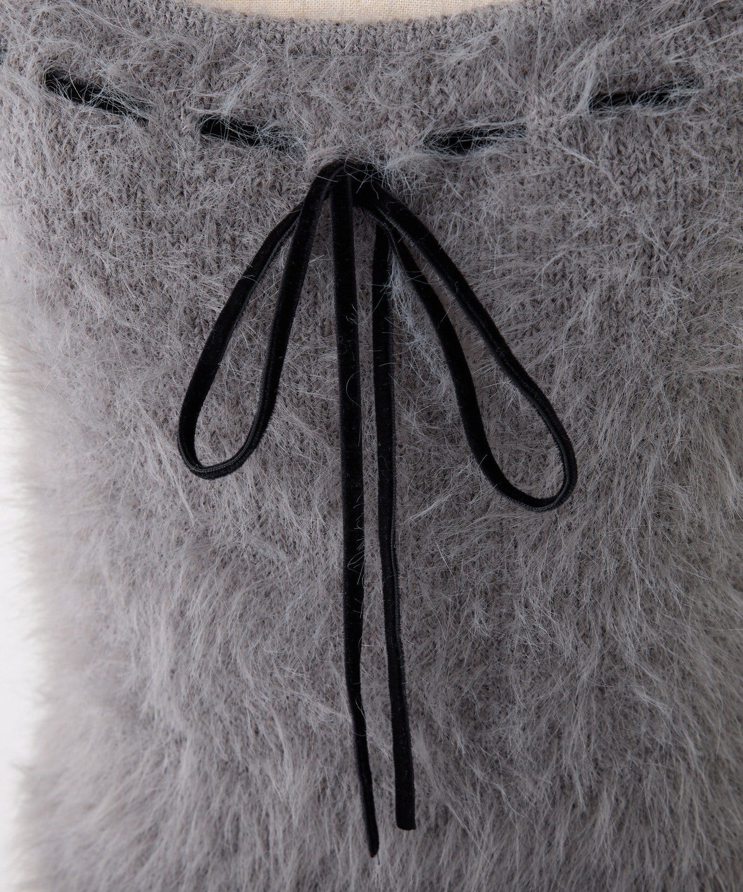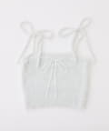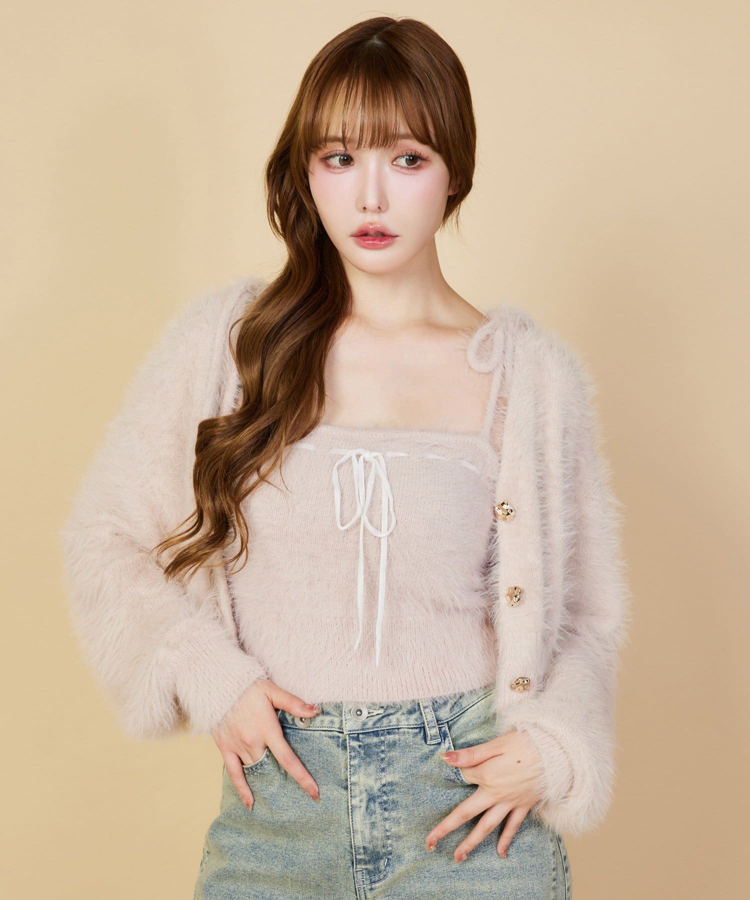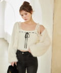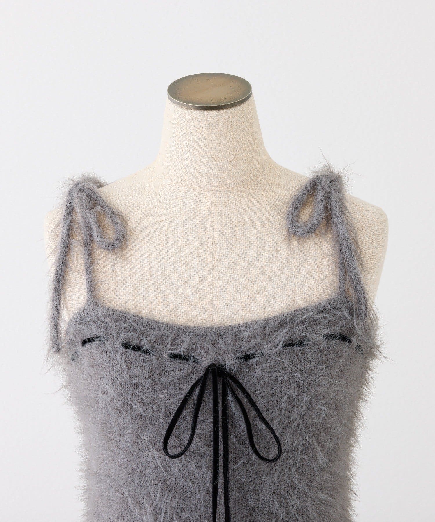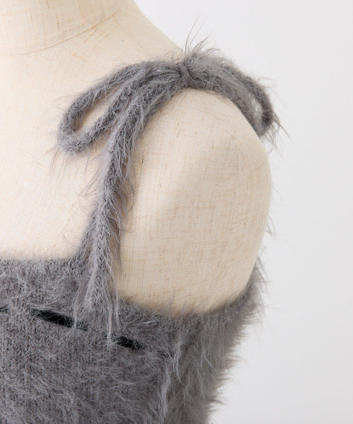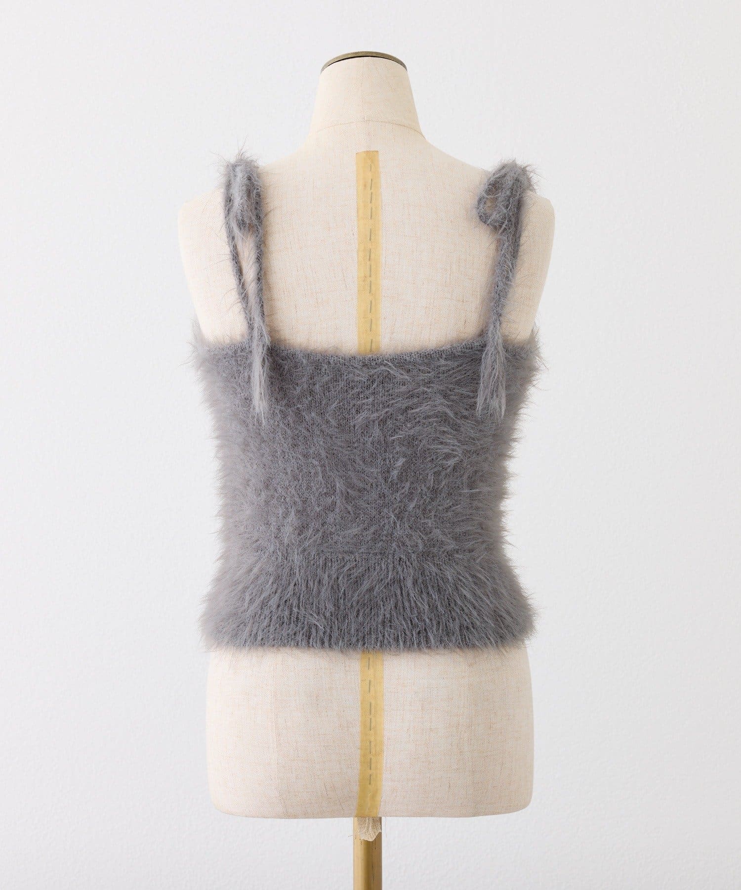 ふわふわなフェザーニット素材と、フロントのリボンが目を引くキャミトップス。