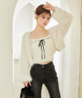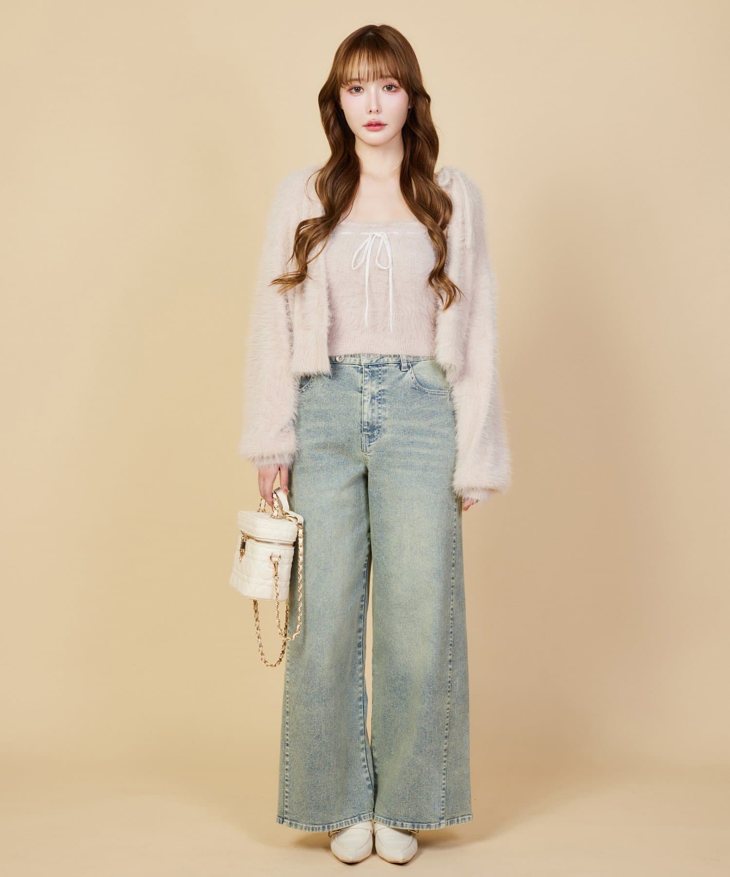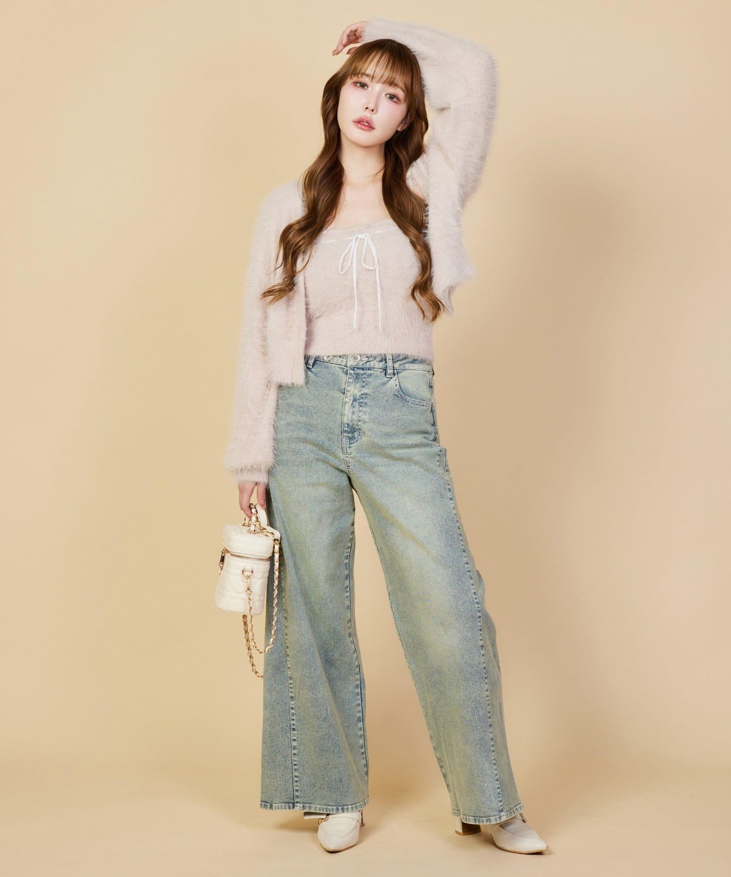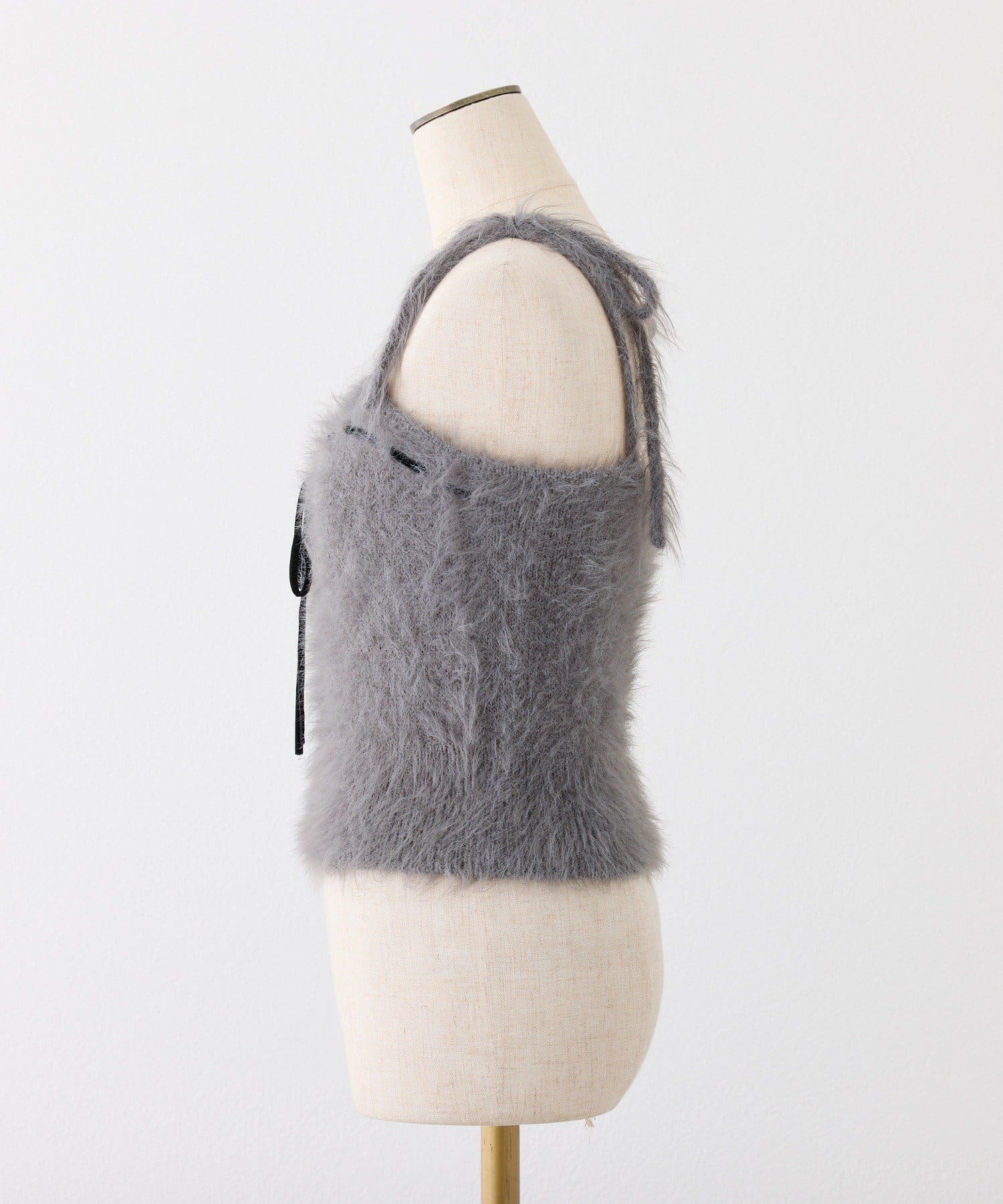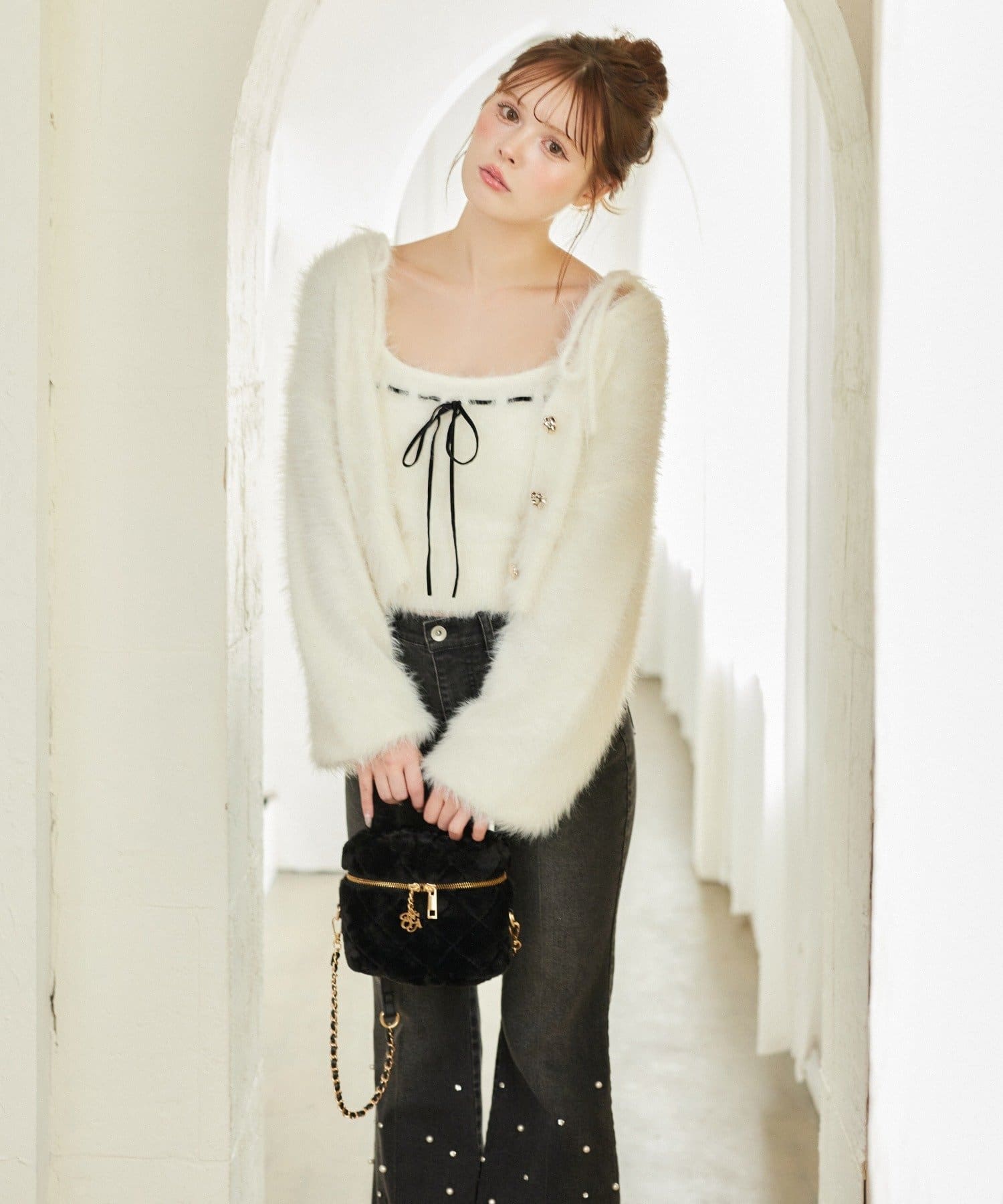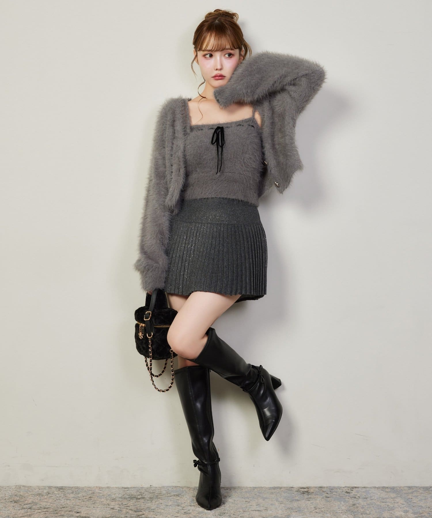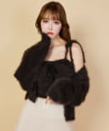 ふわふわなフェザーニット素材と、フロントのリボンが目を引くキャミトップス。