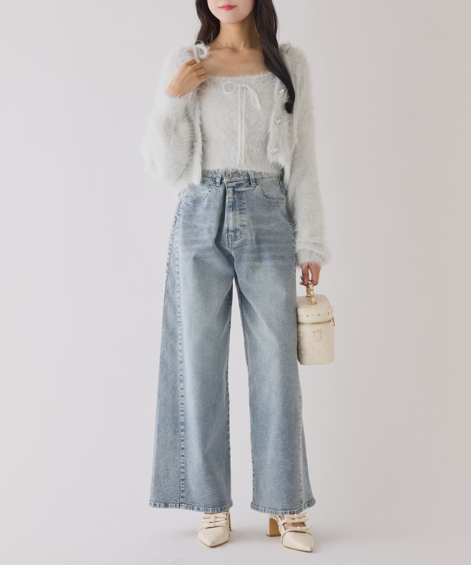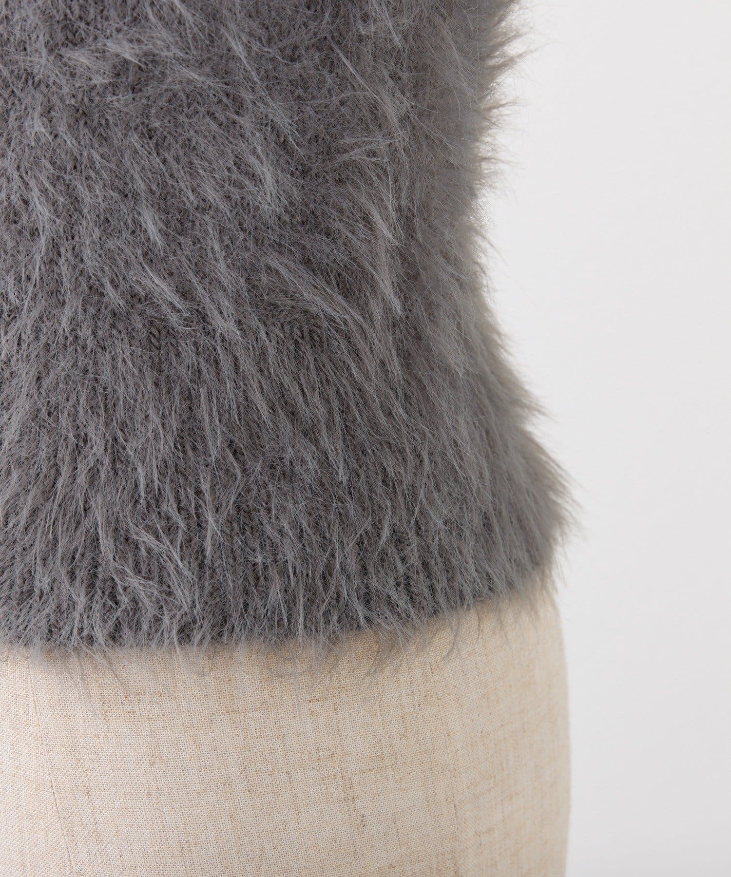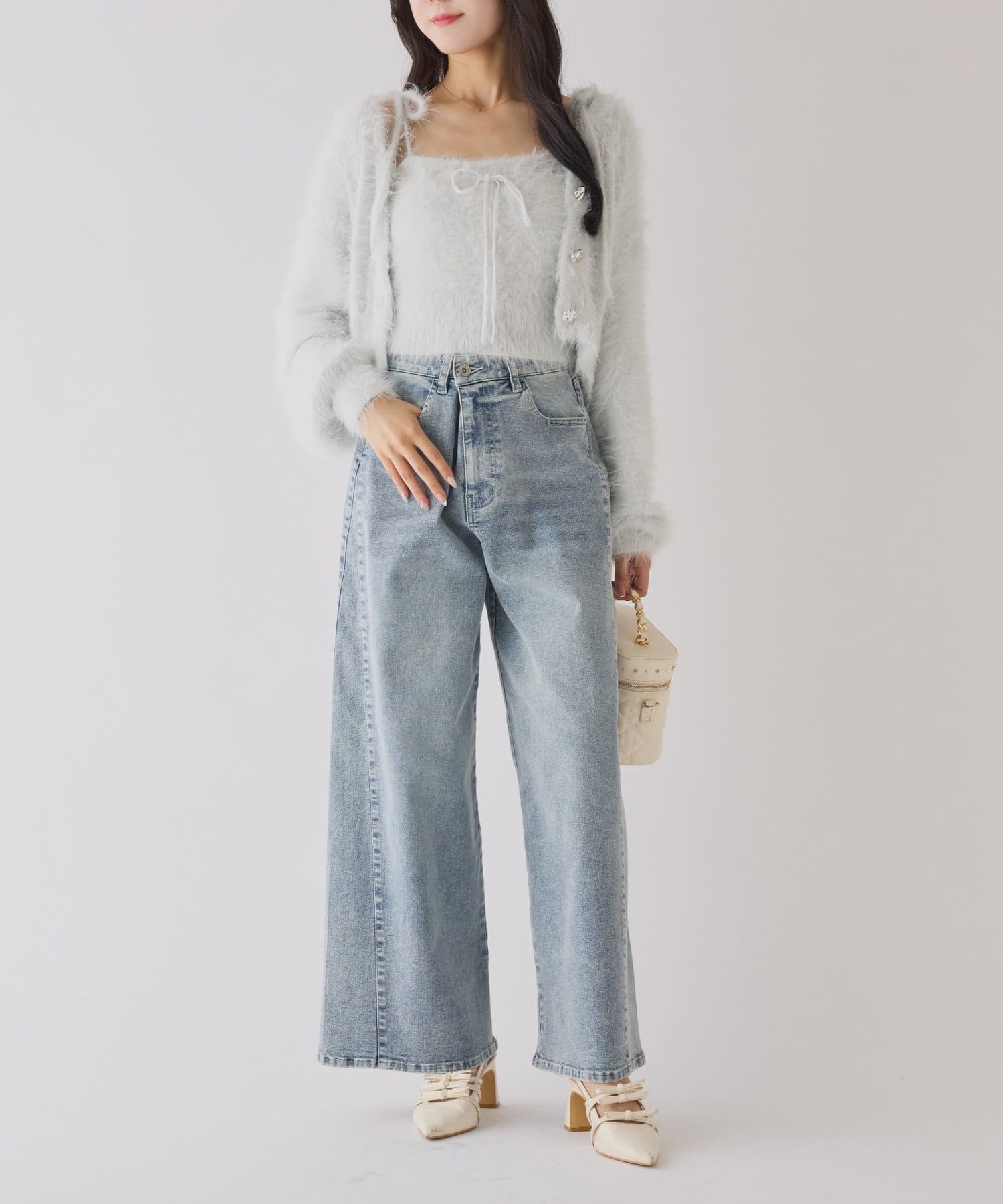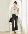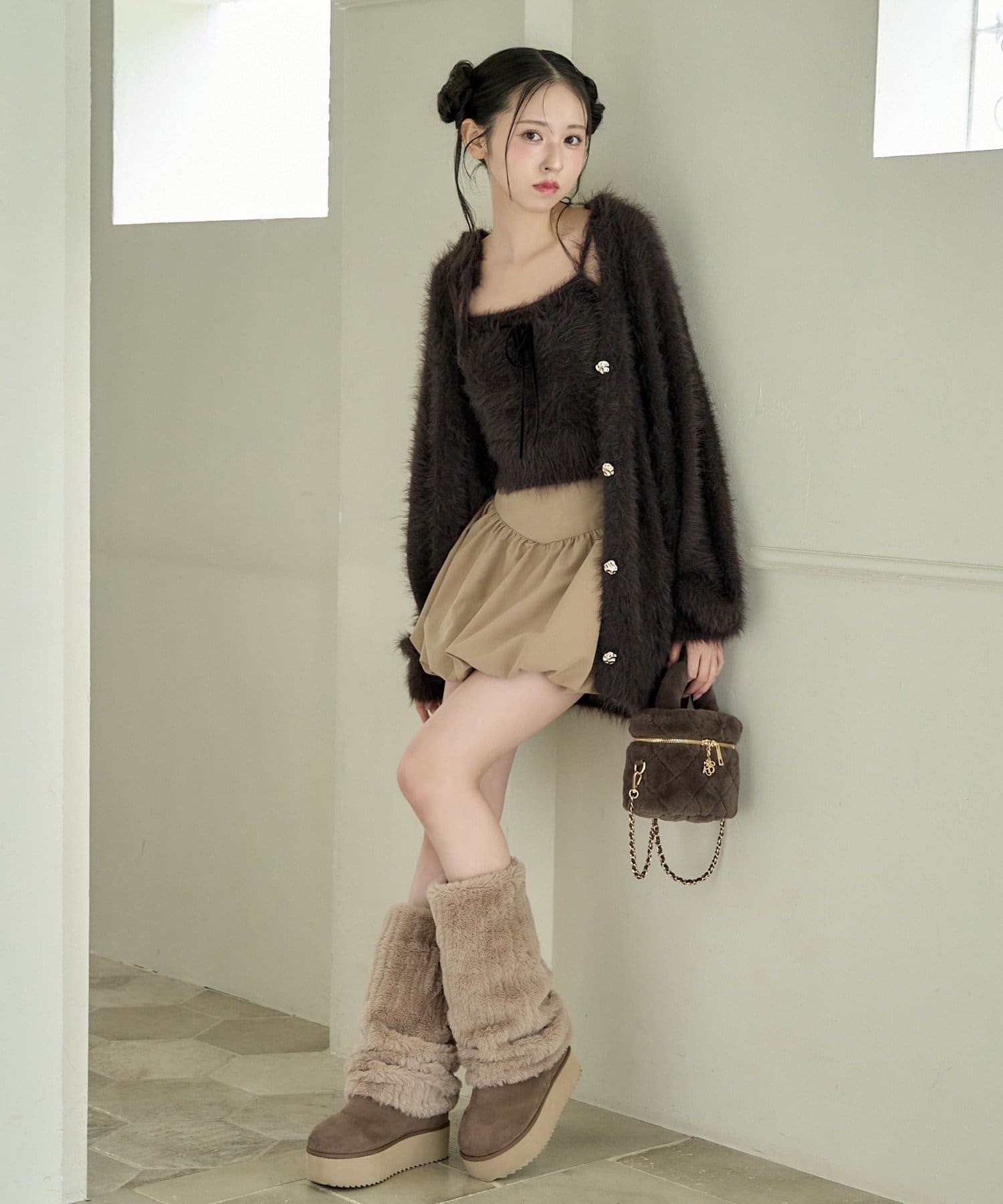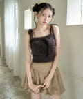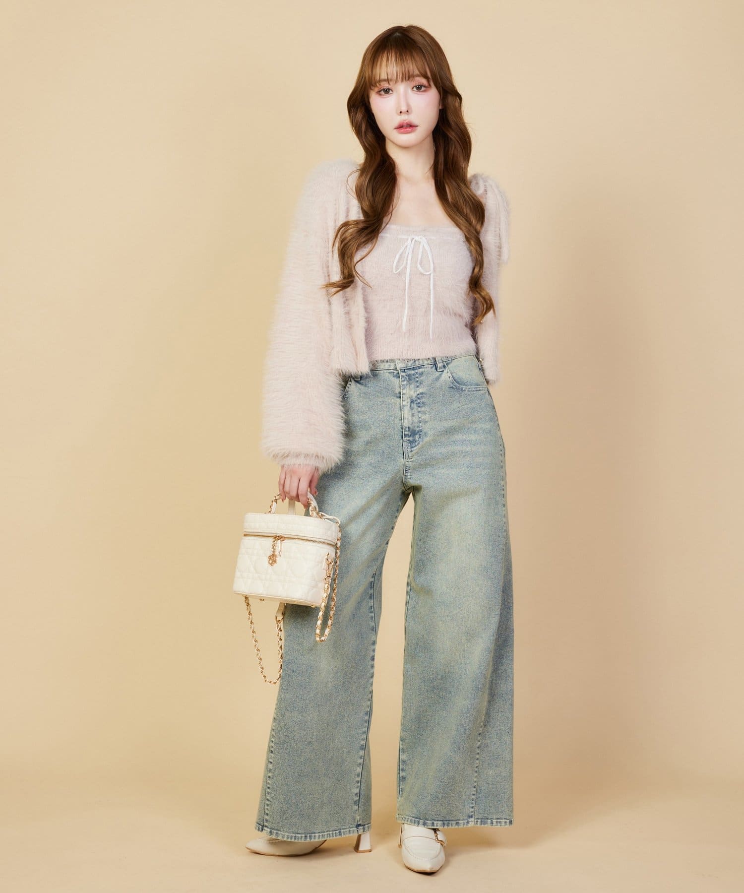 ふわふわなフェザーニット素材と、フロントのリボンが目を引くキャミトップス。