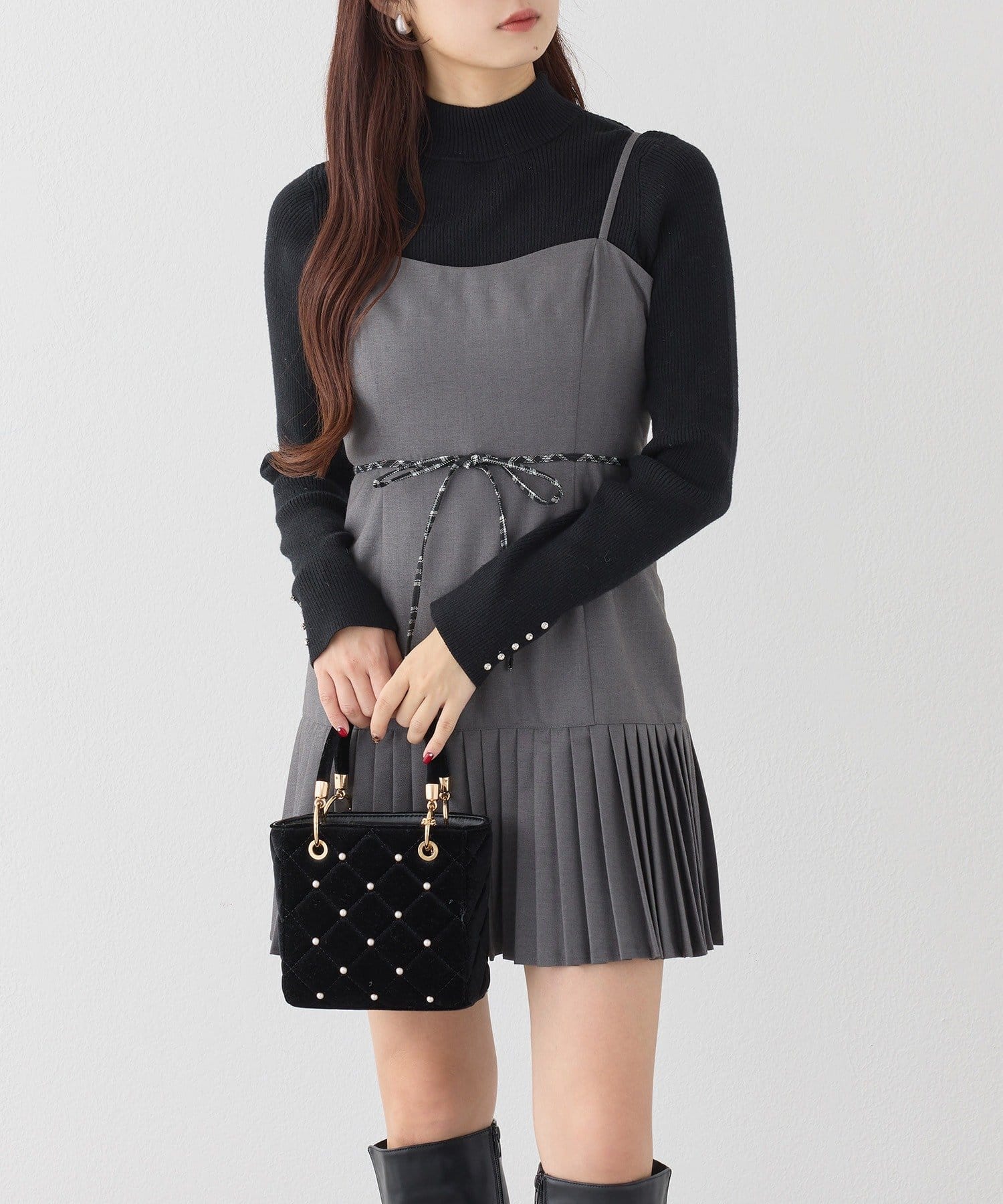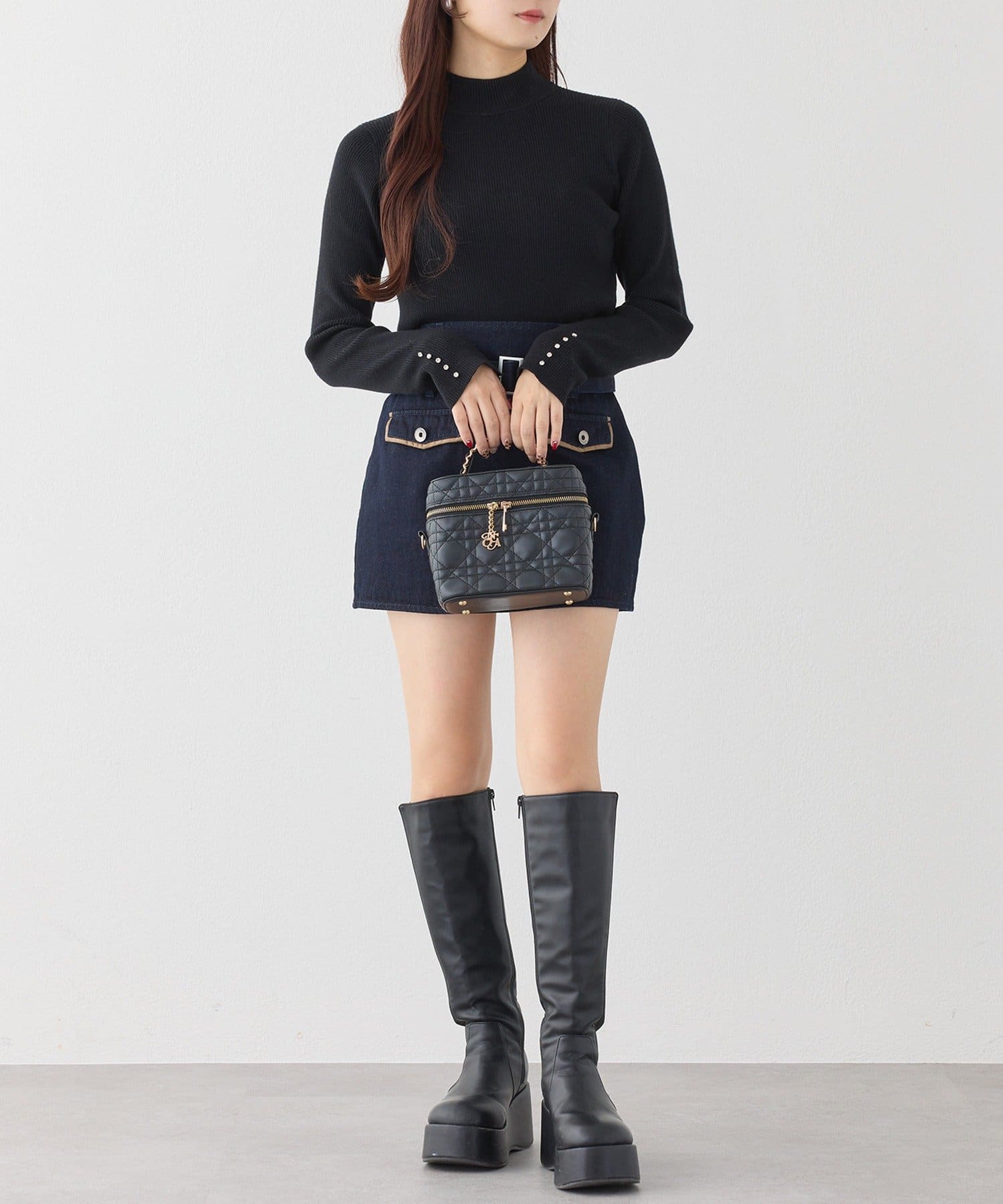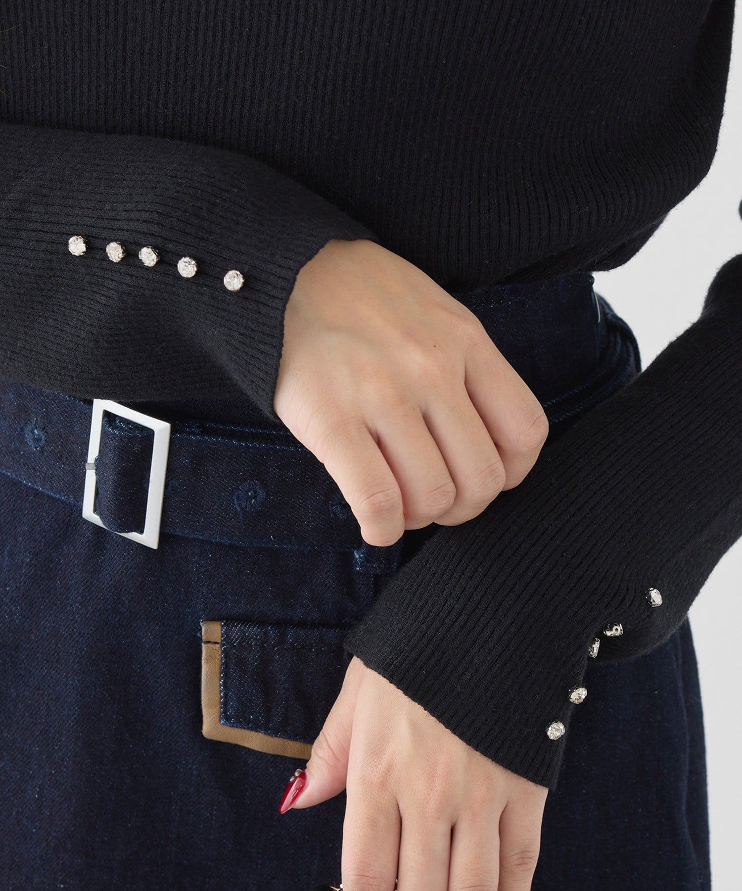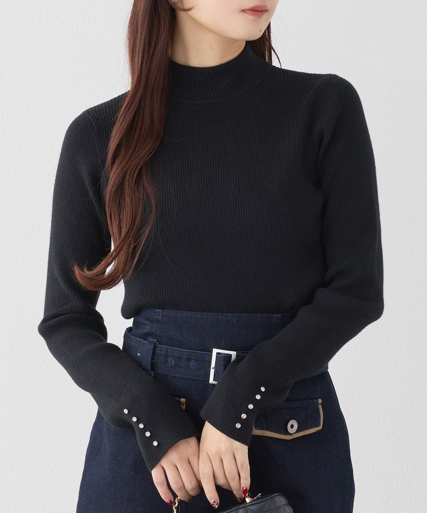 袖口のキラキラボタンがポイントになったハイネックニット。