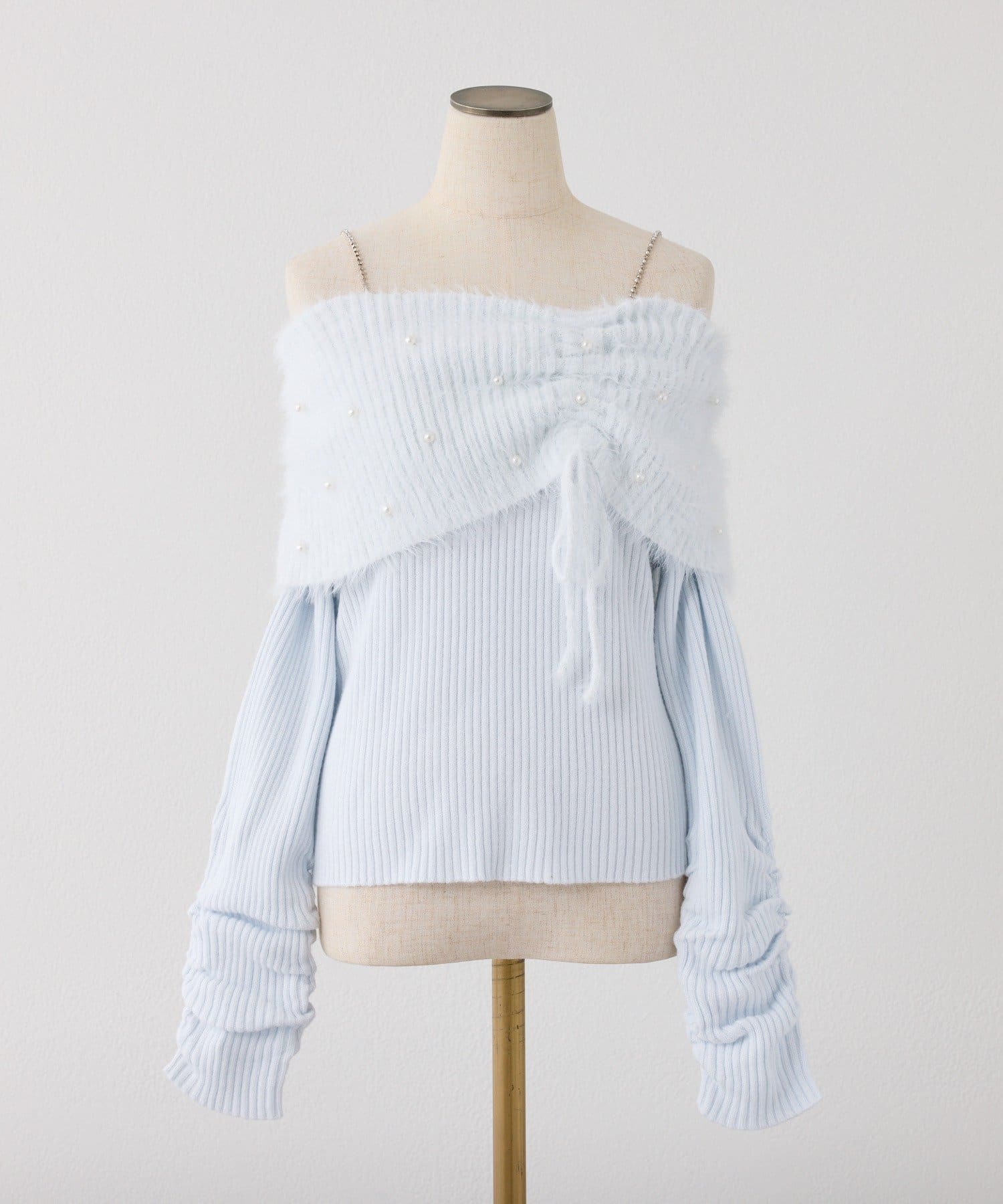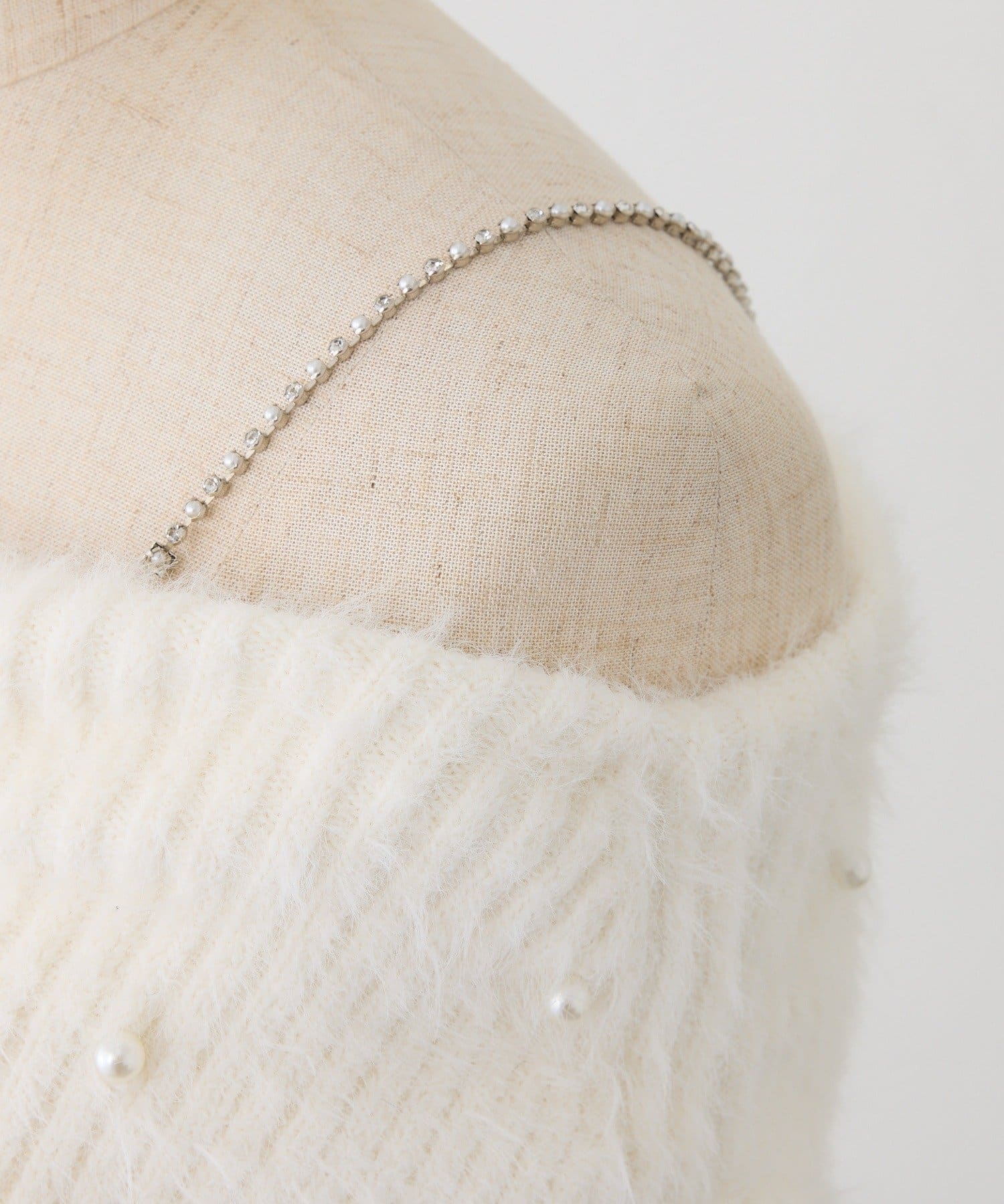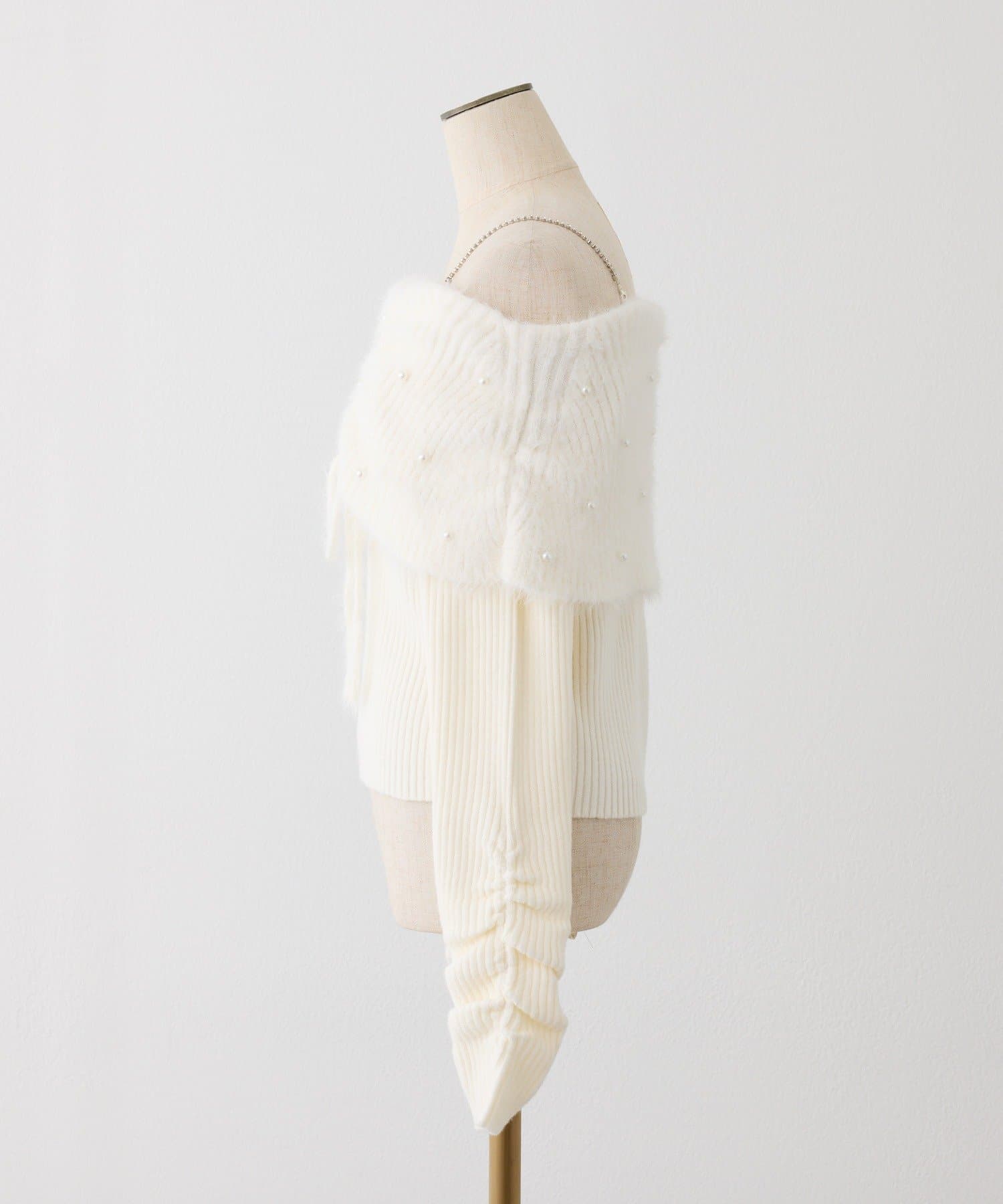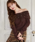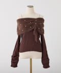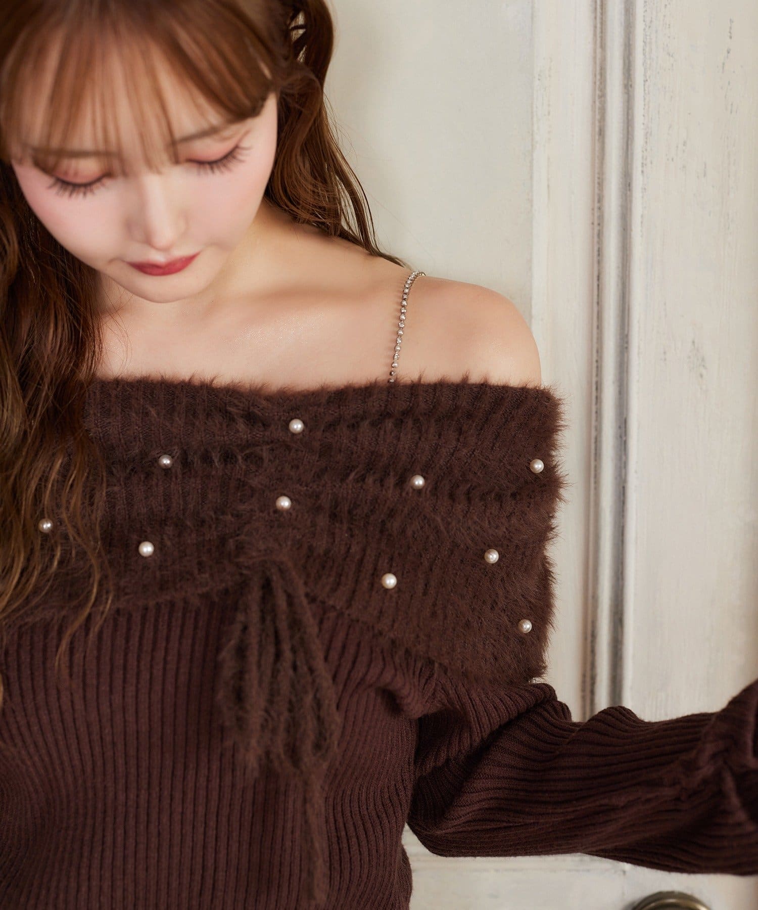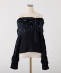 オフショル部分はドロスト仕様で、胸元にパールをあしらい上品なアクセントに。