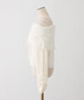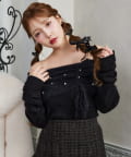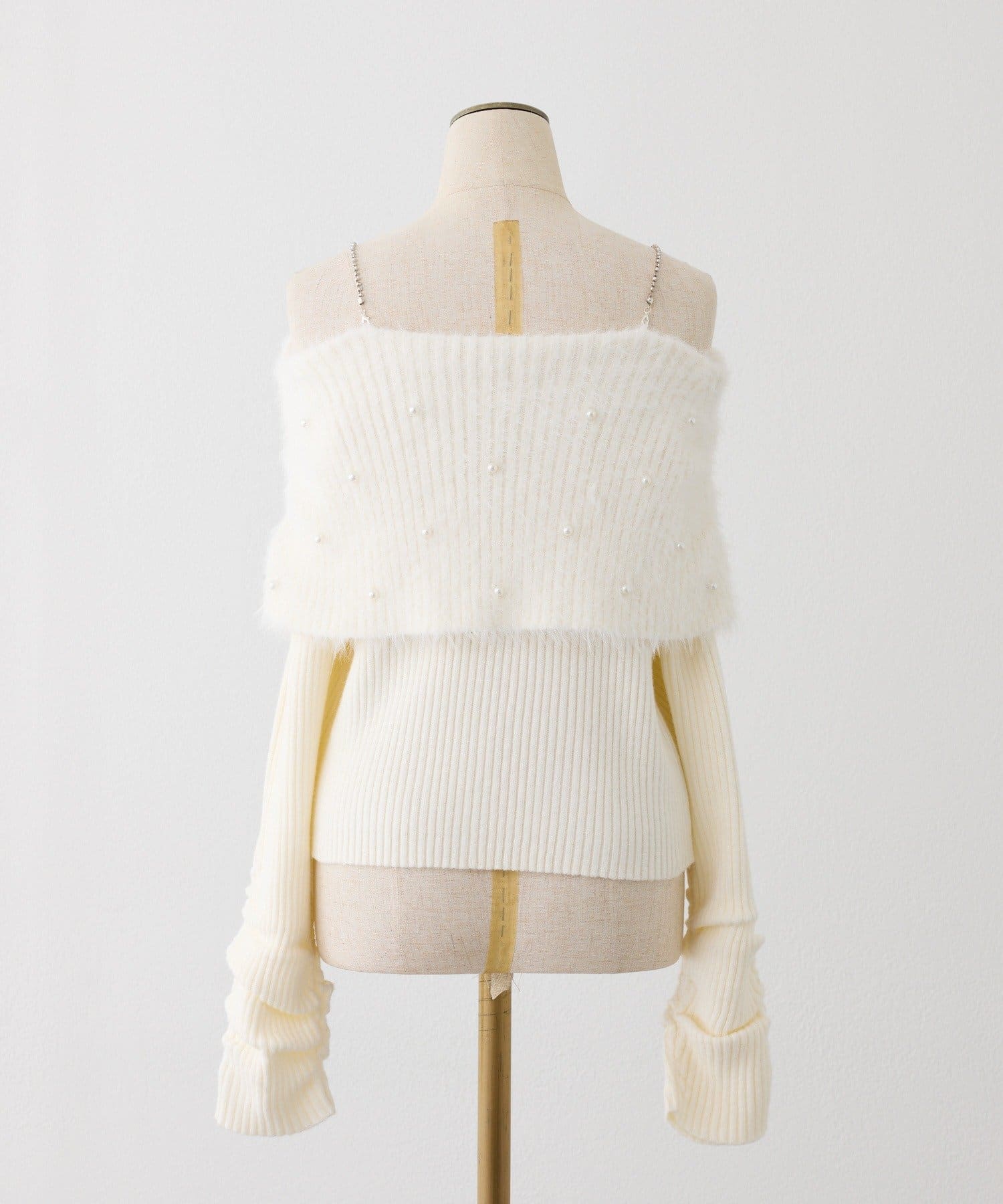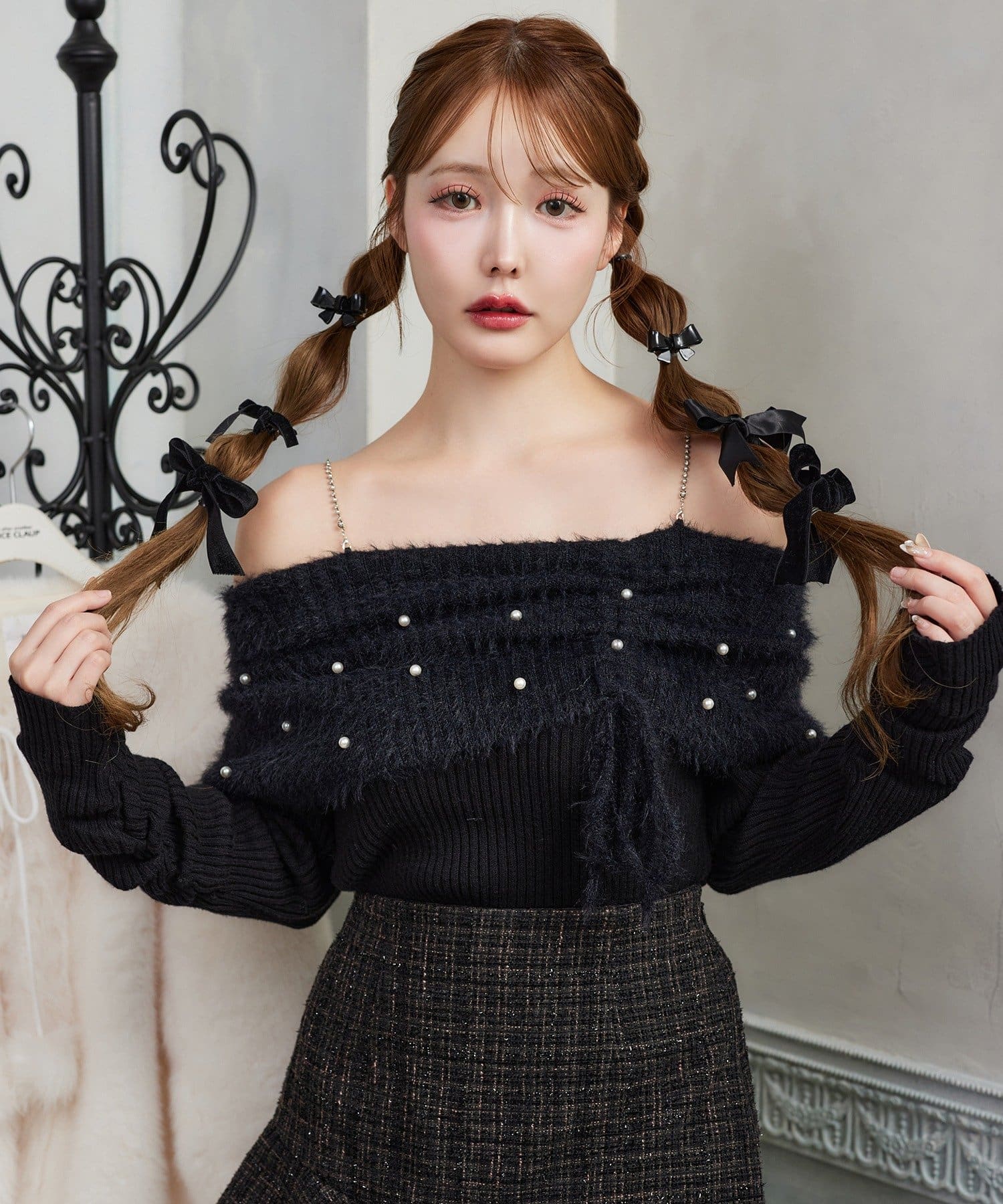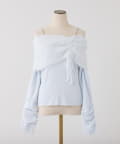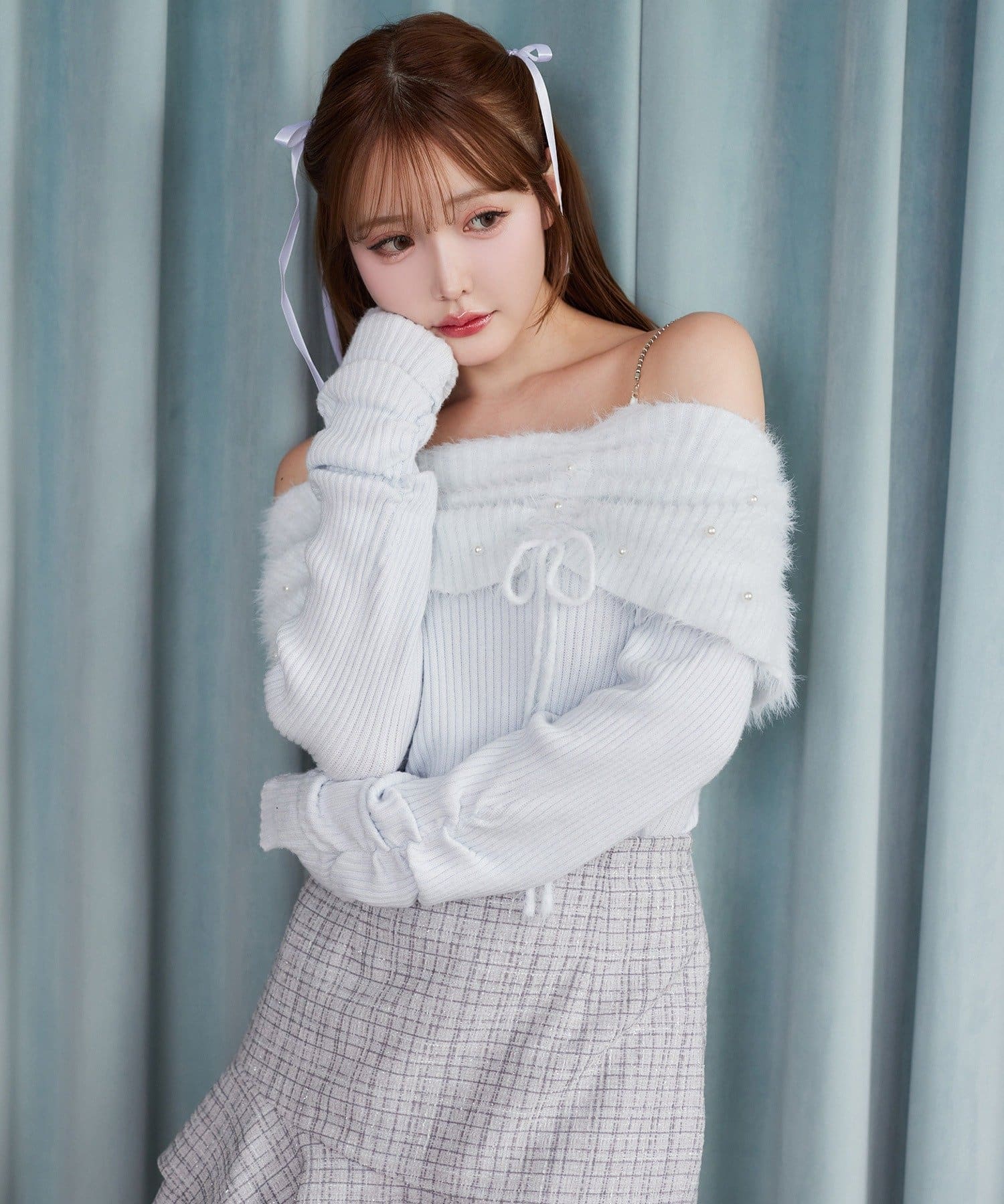 オフショル部分はドロスト仕様で、胸元にパールをあしらい上品なアクセントに。
