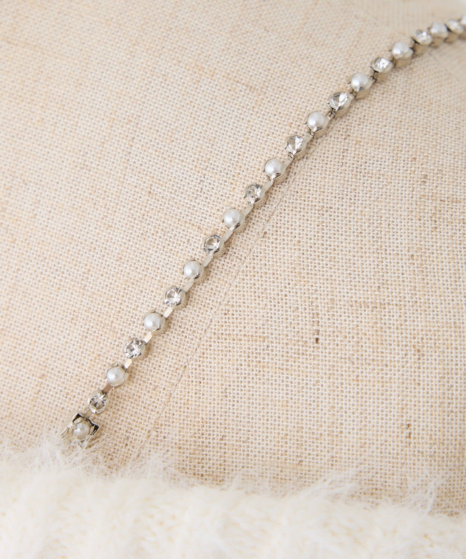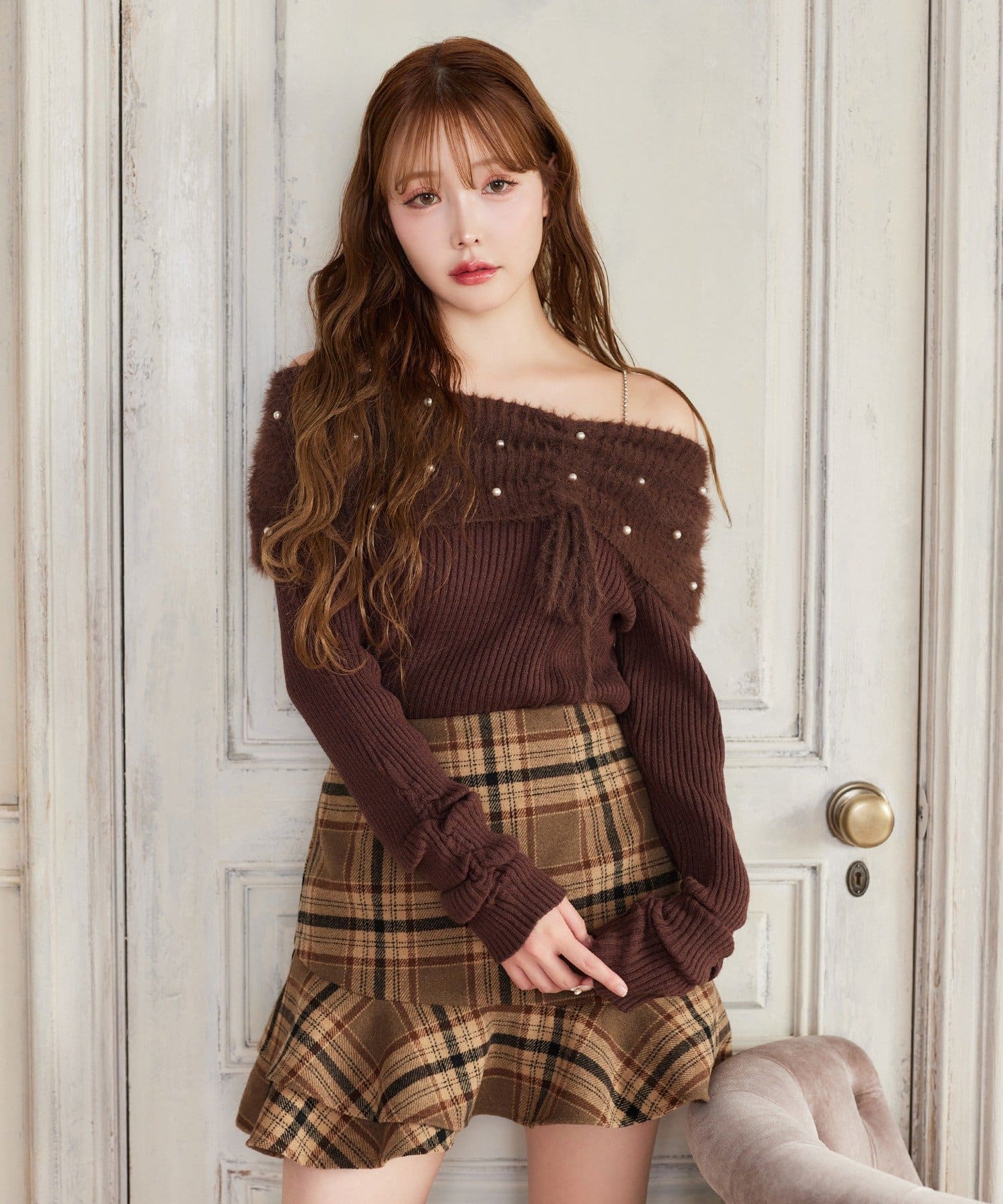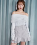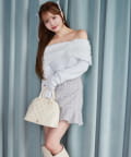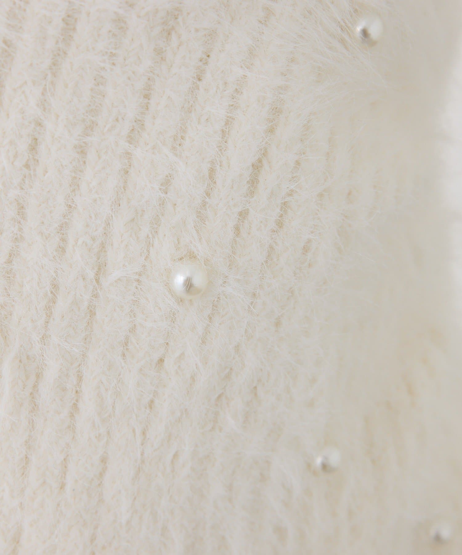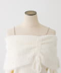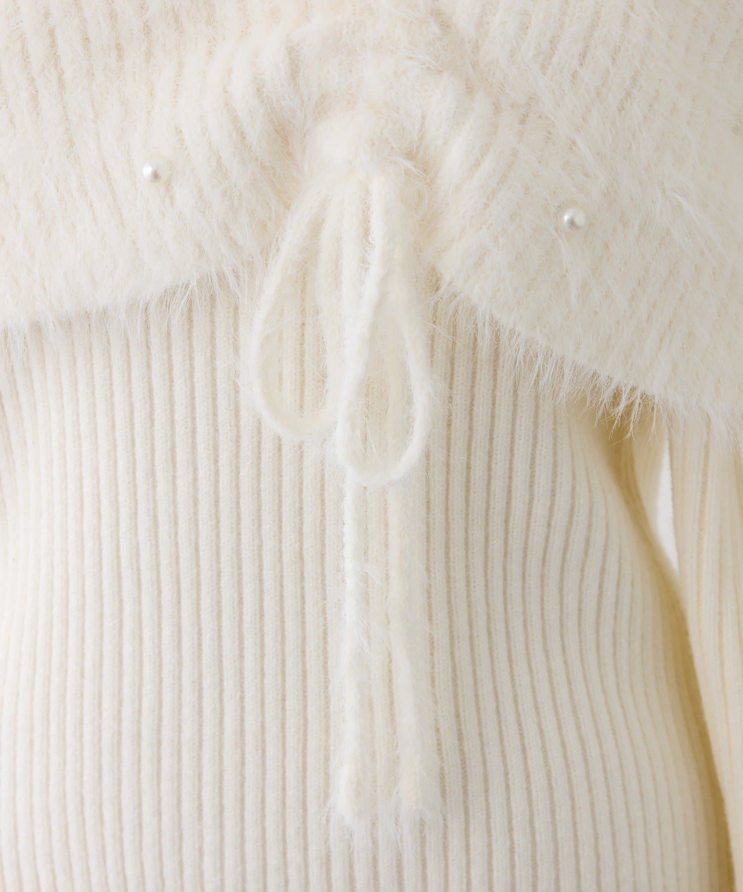 オフショル部分はドロスト仕様で、胸元にパールをあしらい上品なアクセントに。