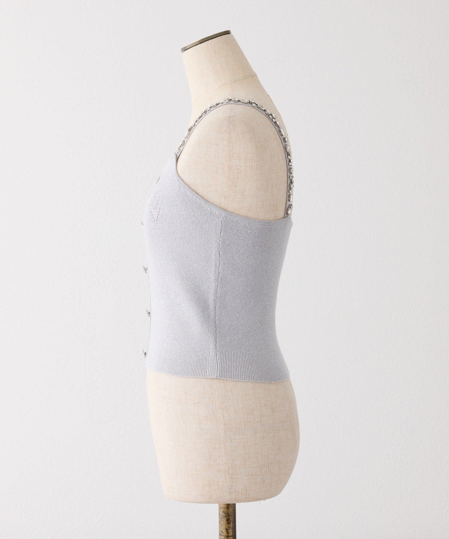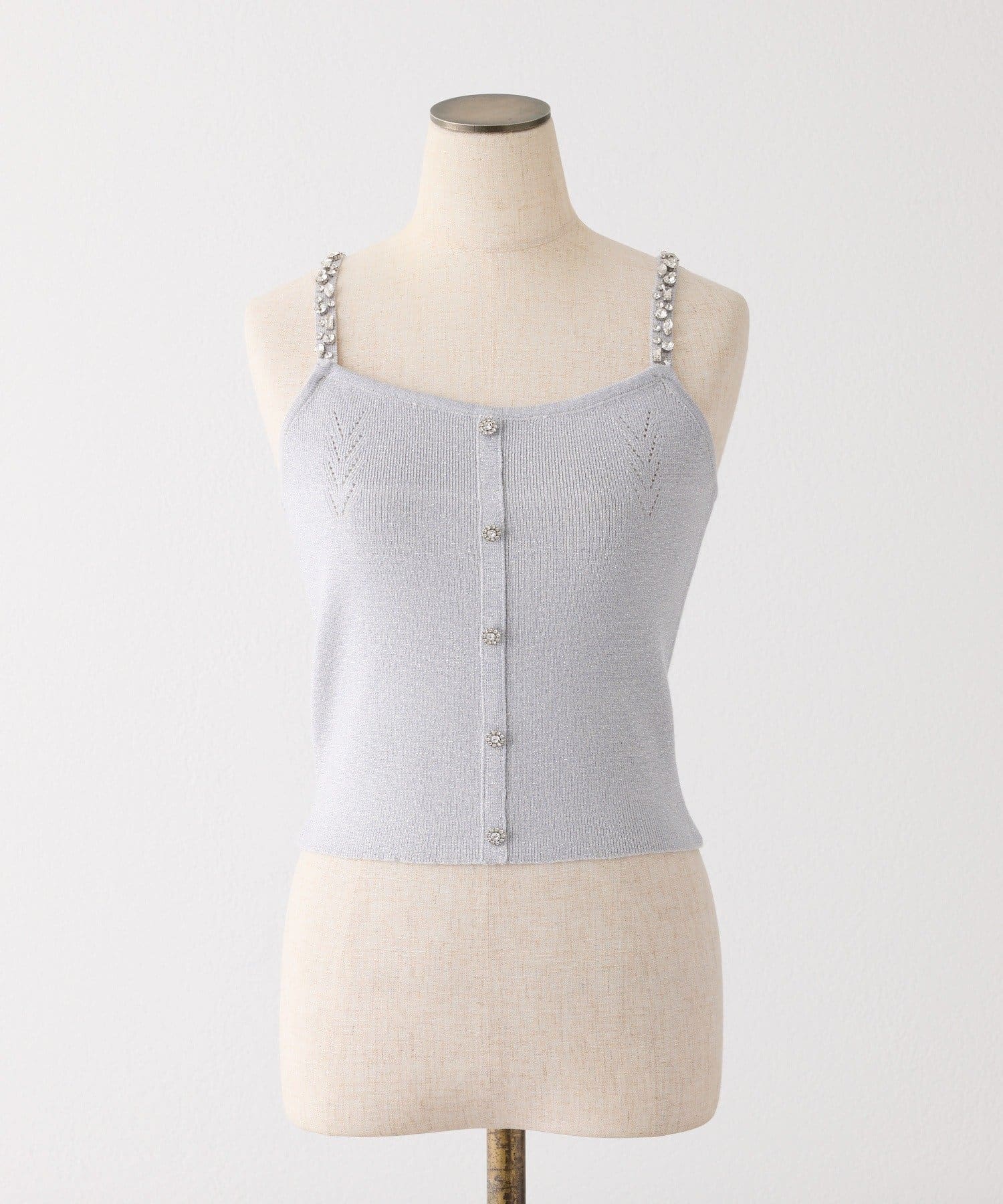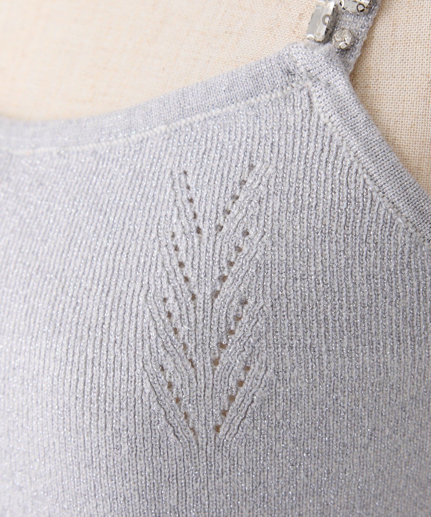 キラキラのビジューをあしらった肩デザインがポイントのニットキャミと、