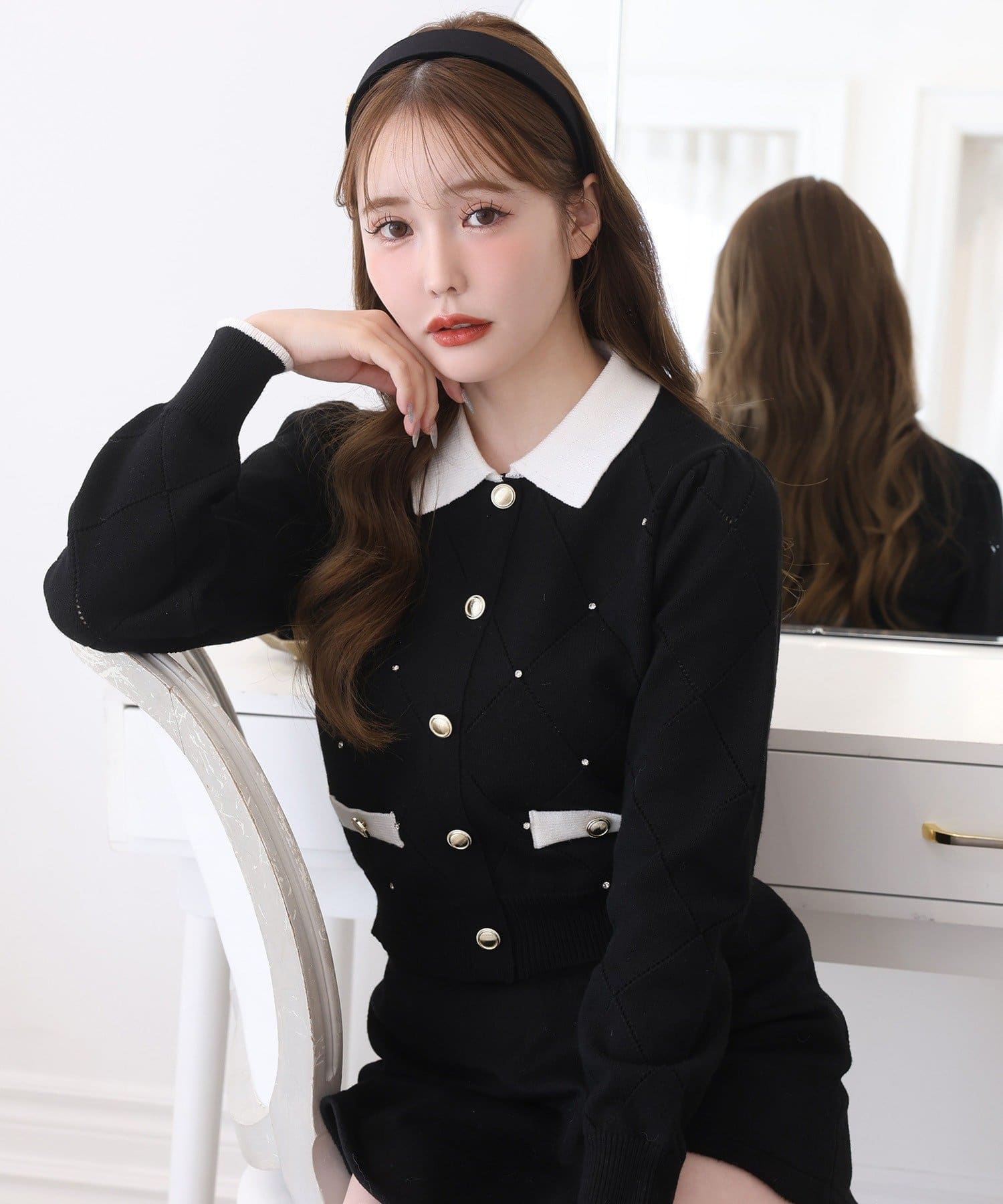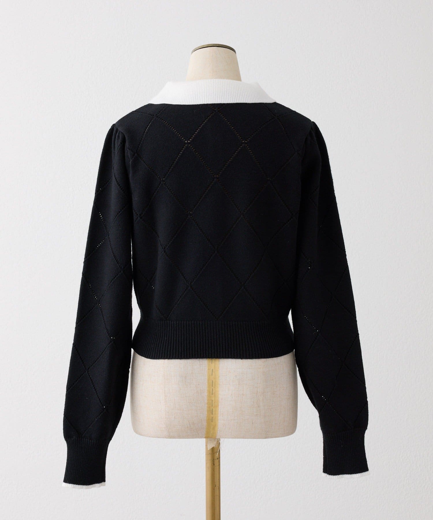 配色デザインの襟が顔まわりを華やかに見せてくれるニットトップス。