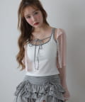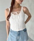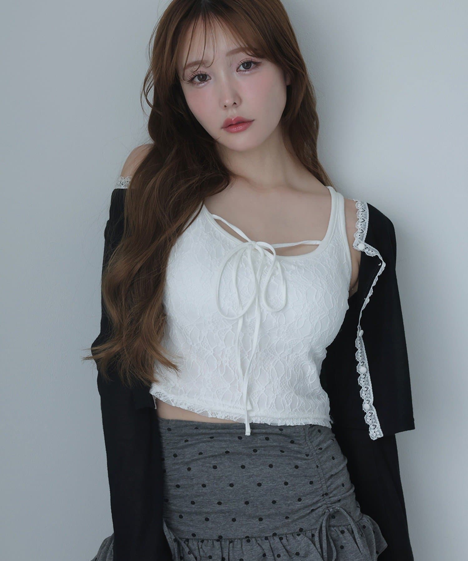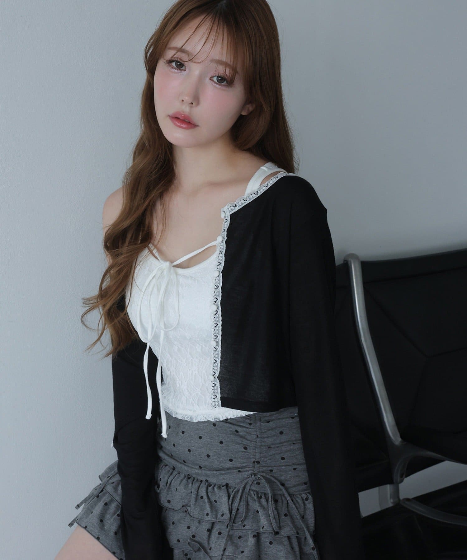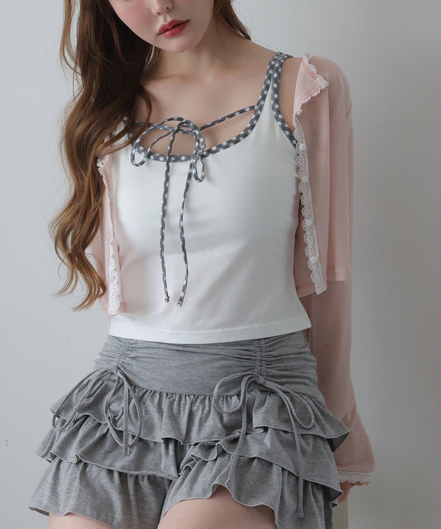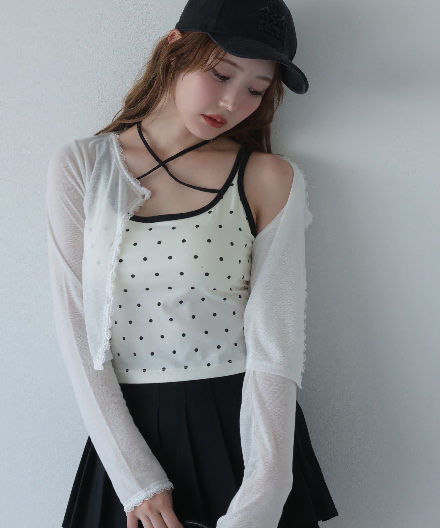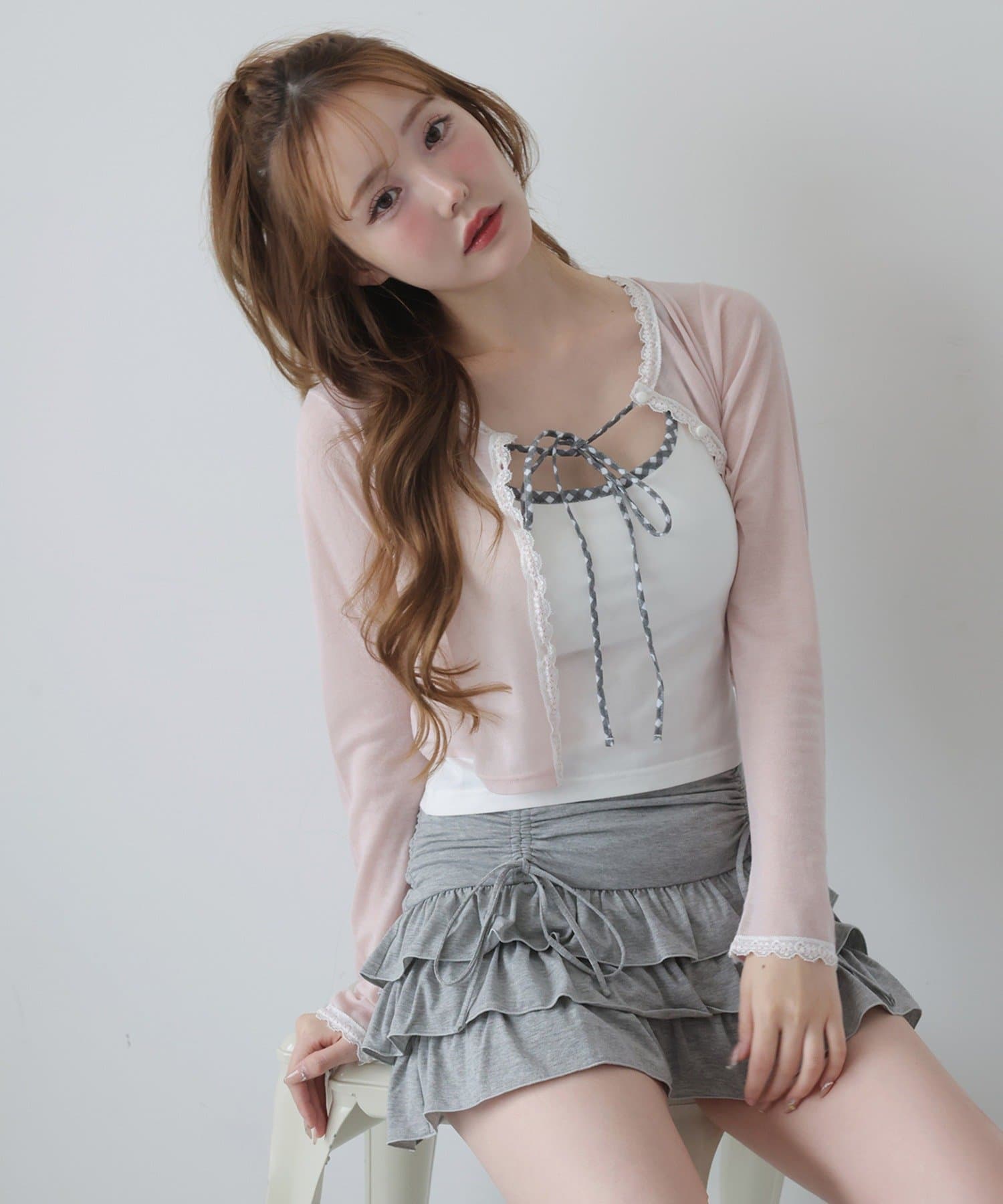 シアートップスやカーディガンのインナーとしてレイヤードすると、胸元のリボンがアクセントに。