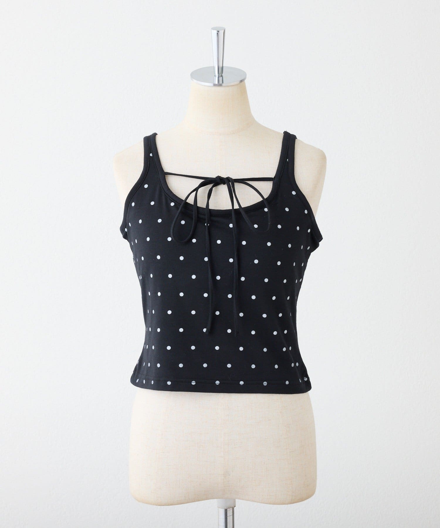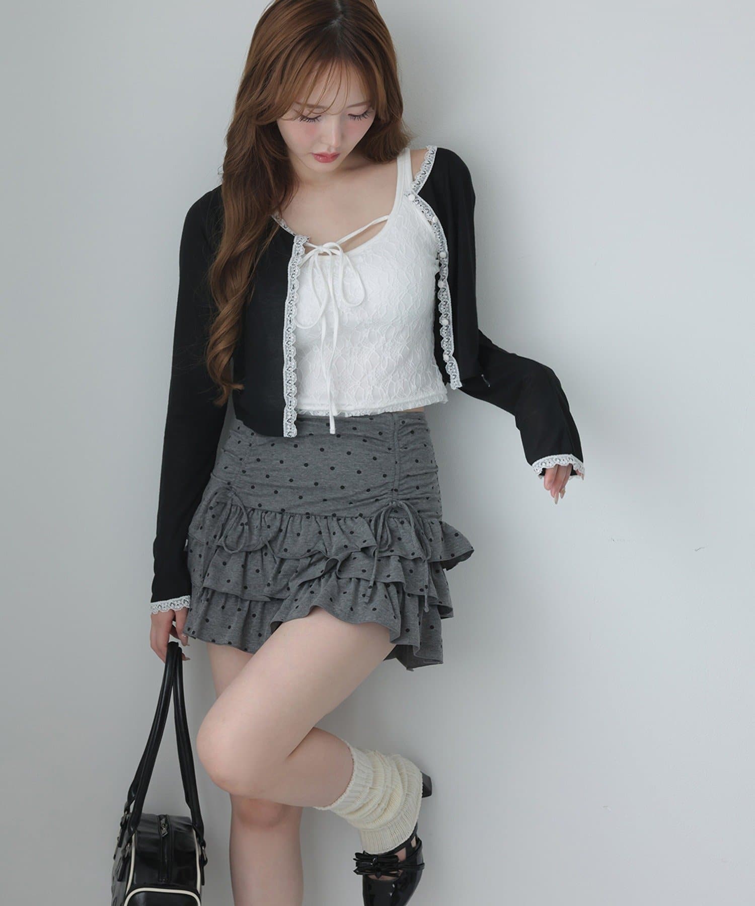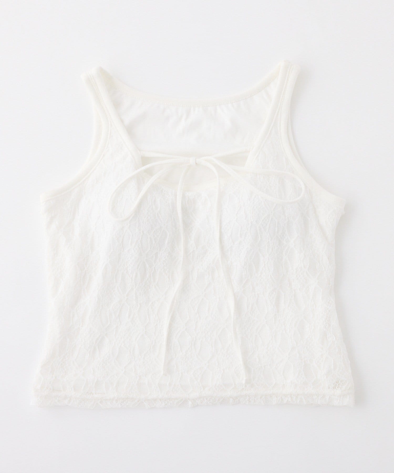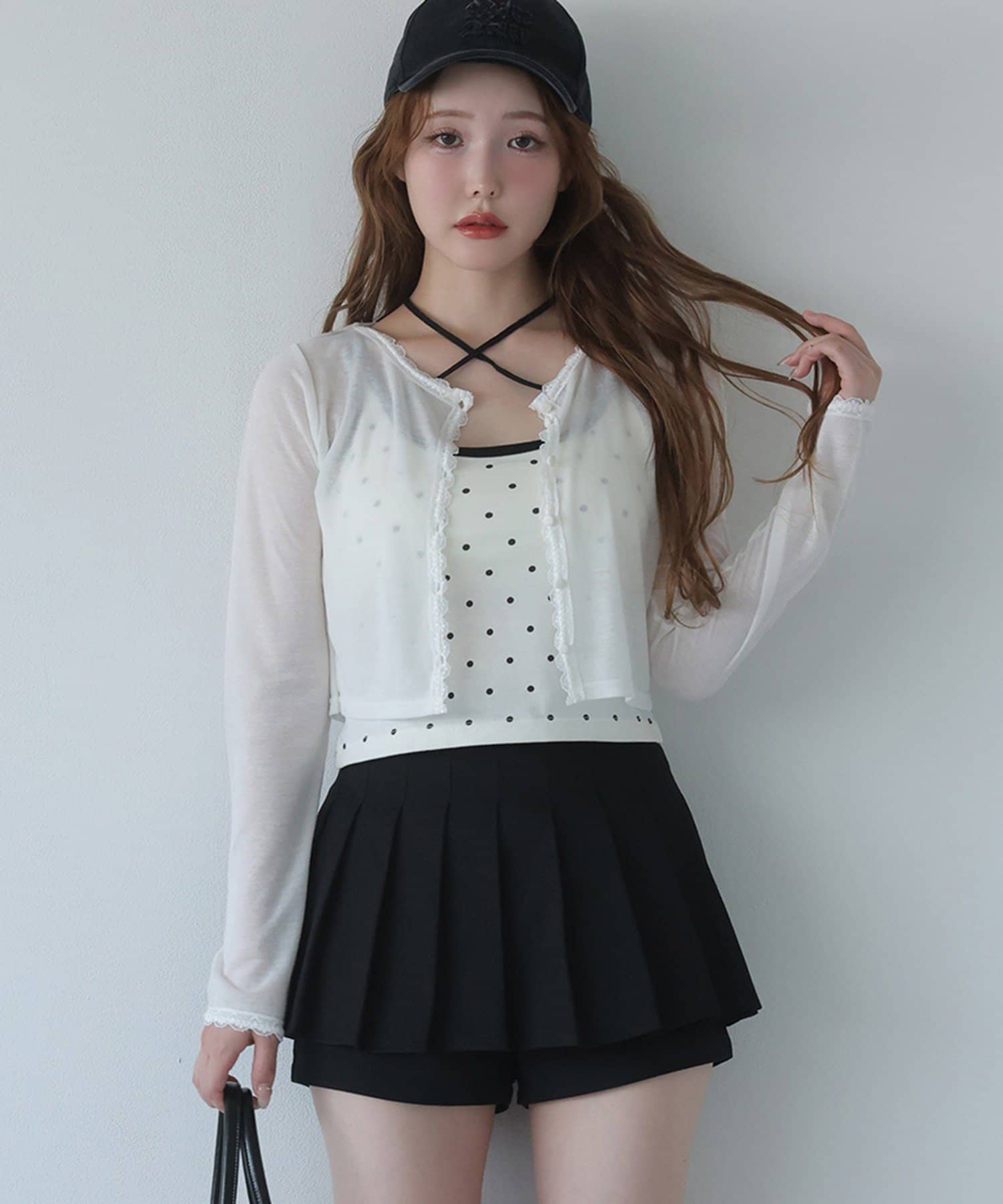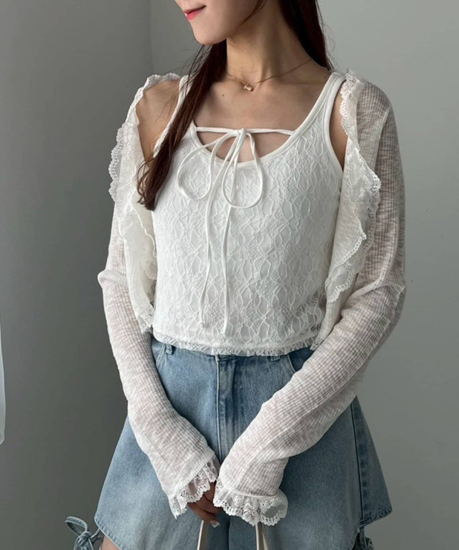 シアートップスやカーディガンのインナーとしてレイヤードすると、胸元のリボンがアクセントに。