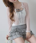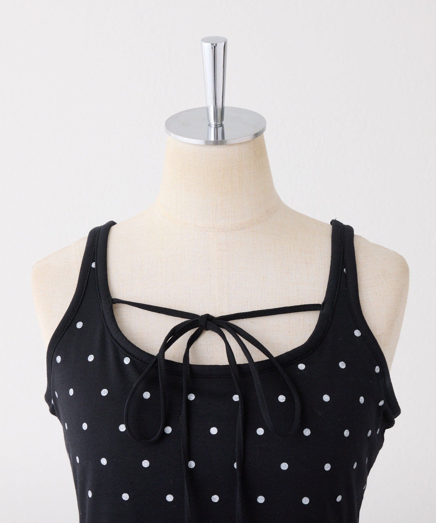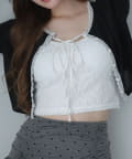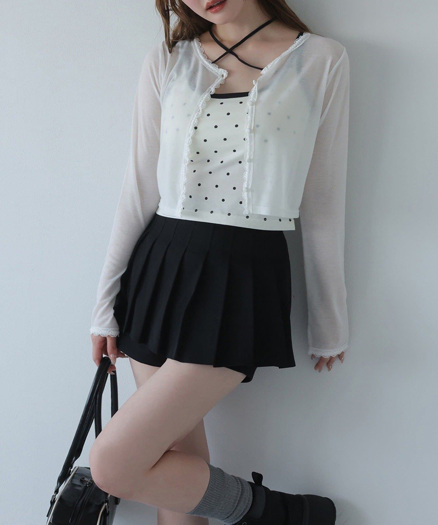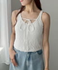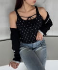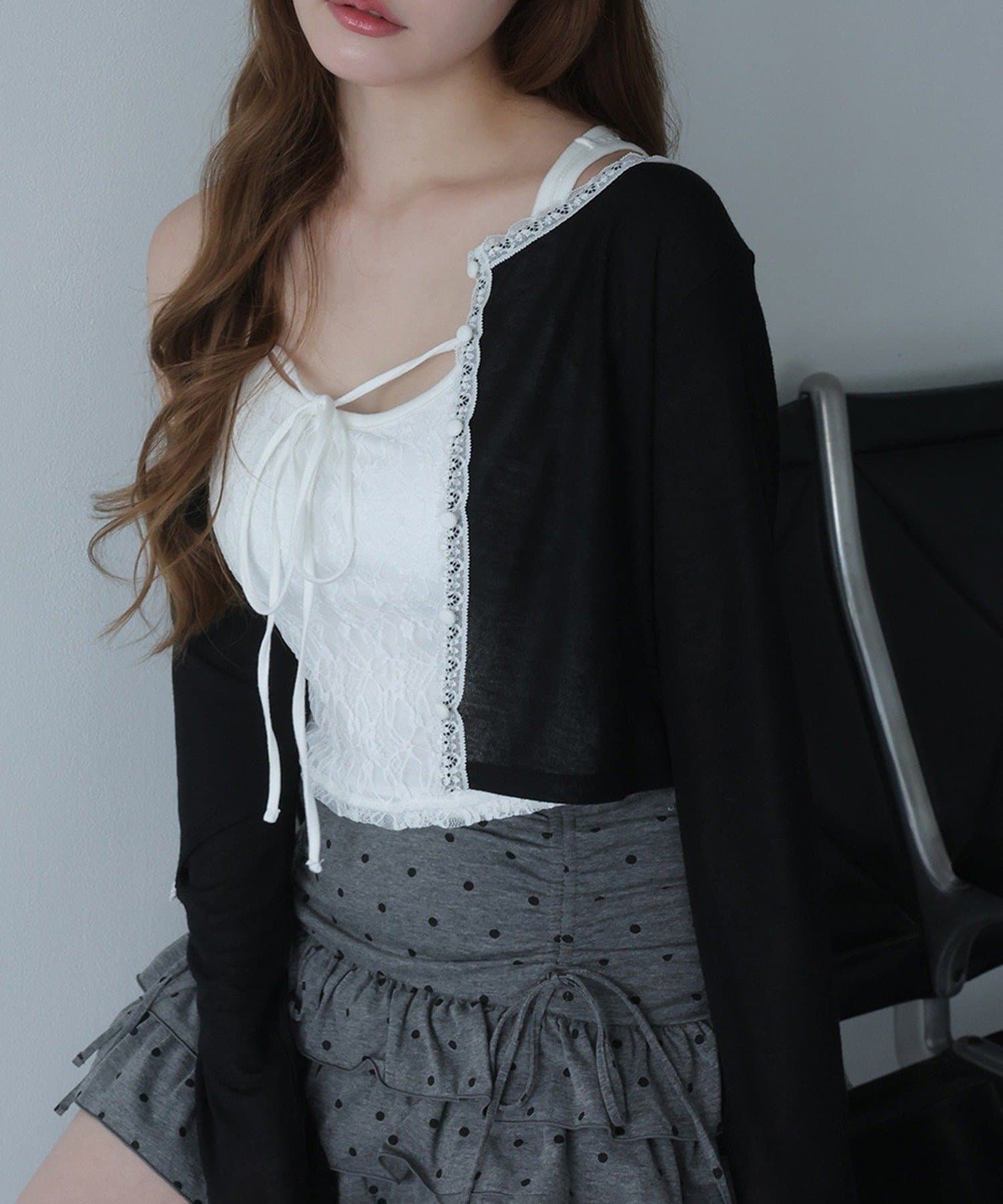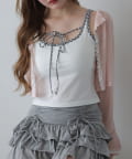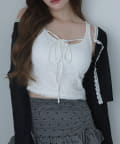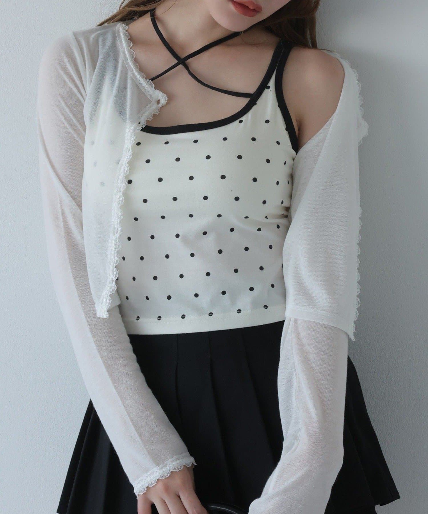 シアートップスやカーディガンのインナーとしてレイヤードすると、胸元のリボンがアクセントに。