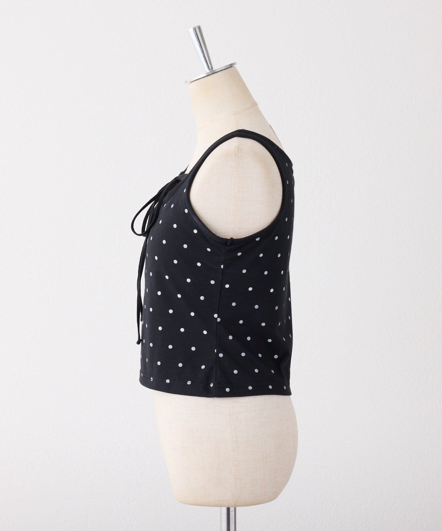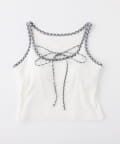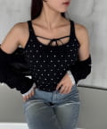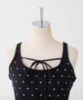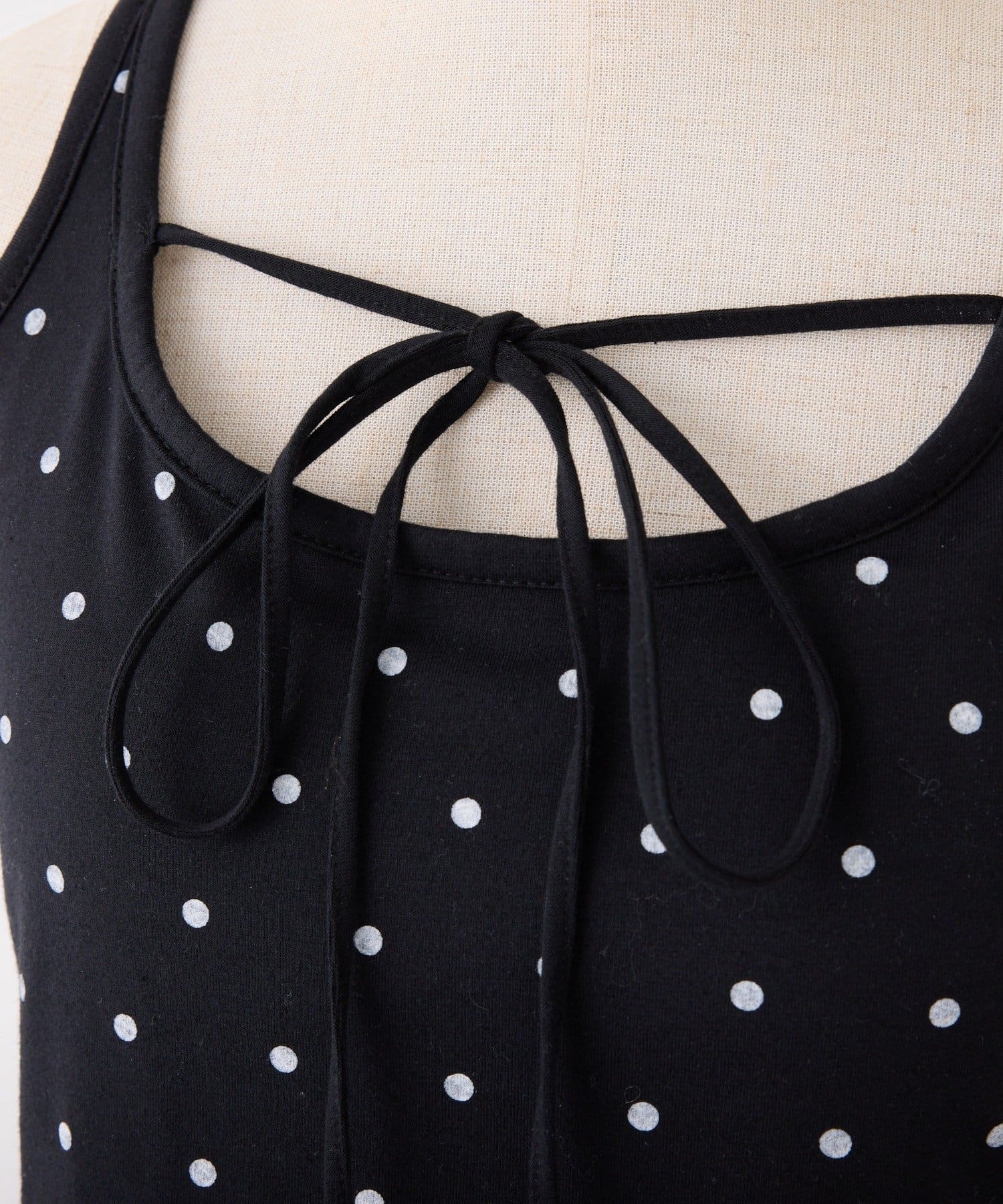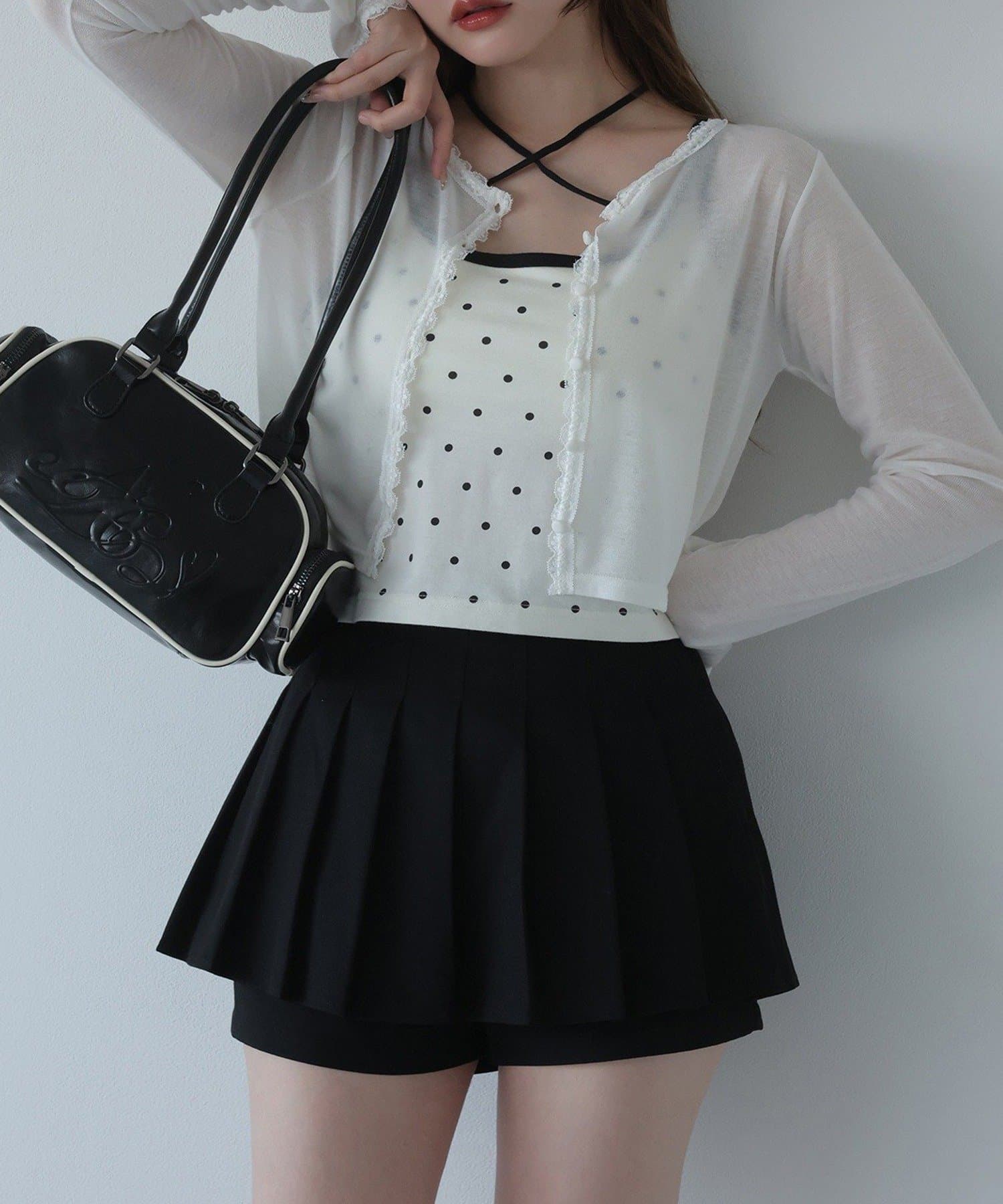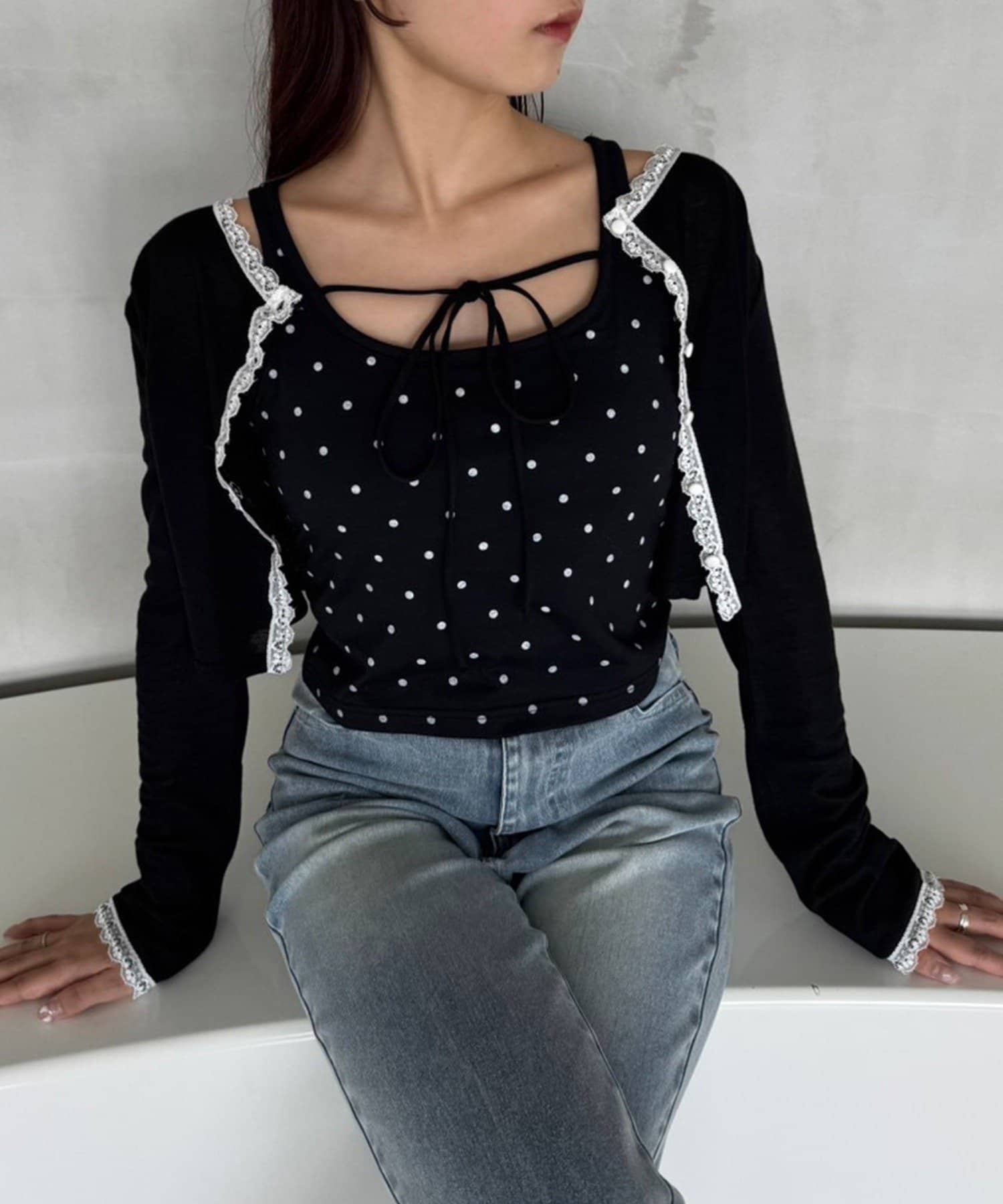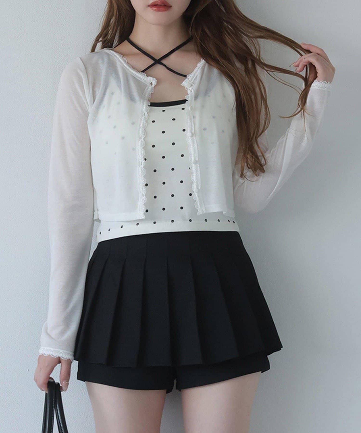シアートップスやカーディガンのインナーとしてレイヤードすると、胸元のリボンがアクセントに。