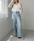 デニムパンツやロングスカートと合わせて、バランスの取れたカジュアルガーリーコーデもおすすめ。