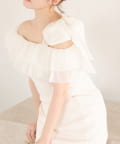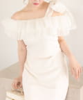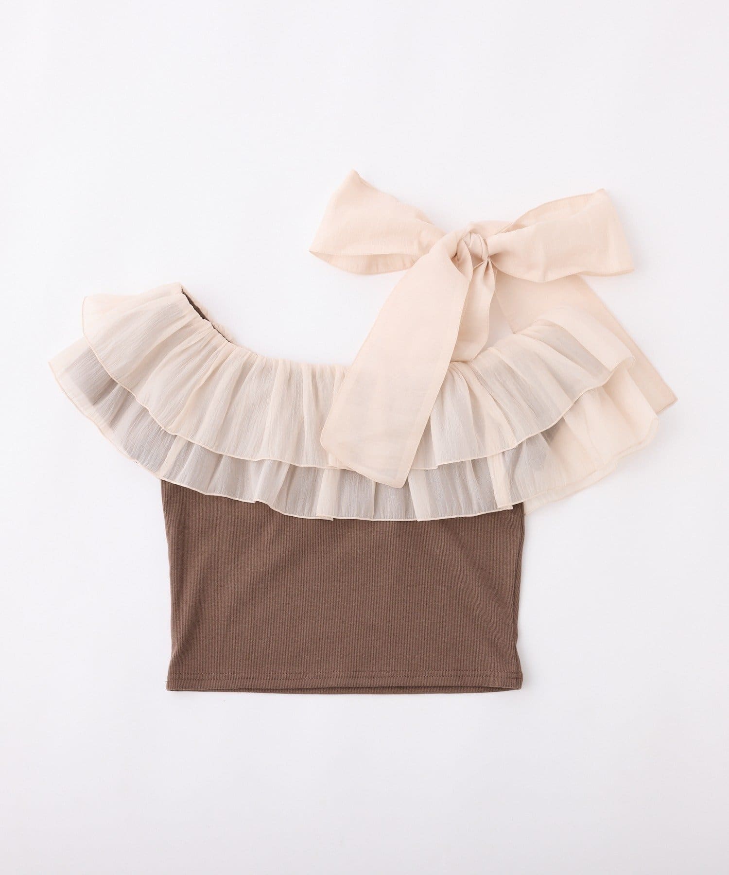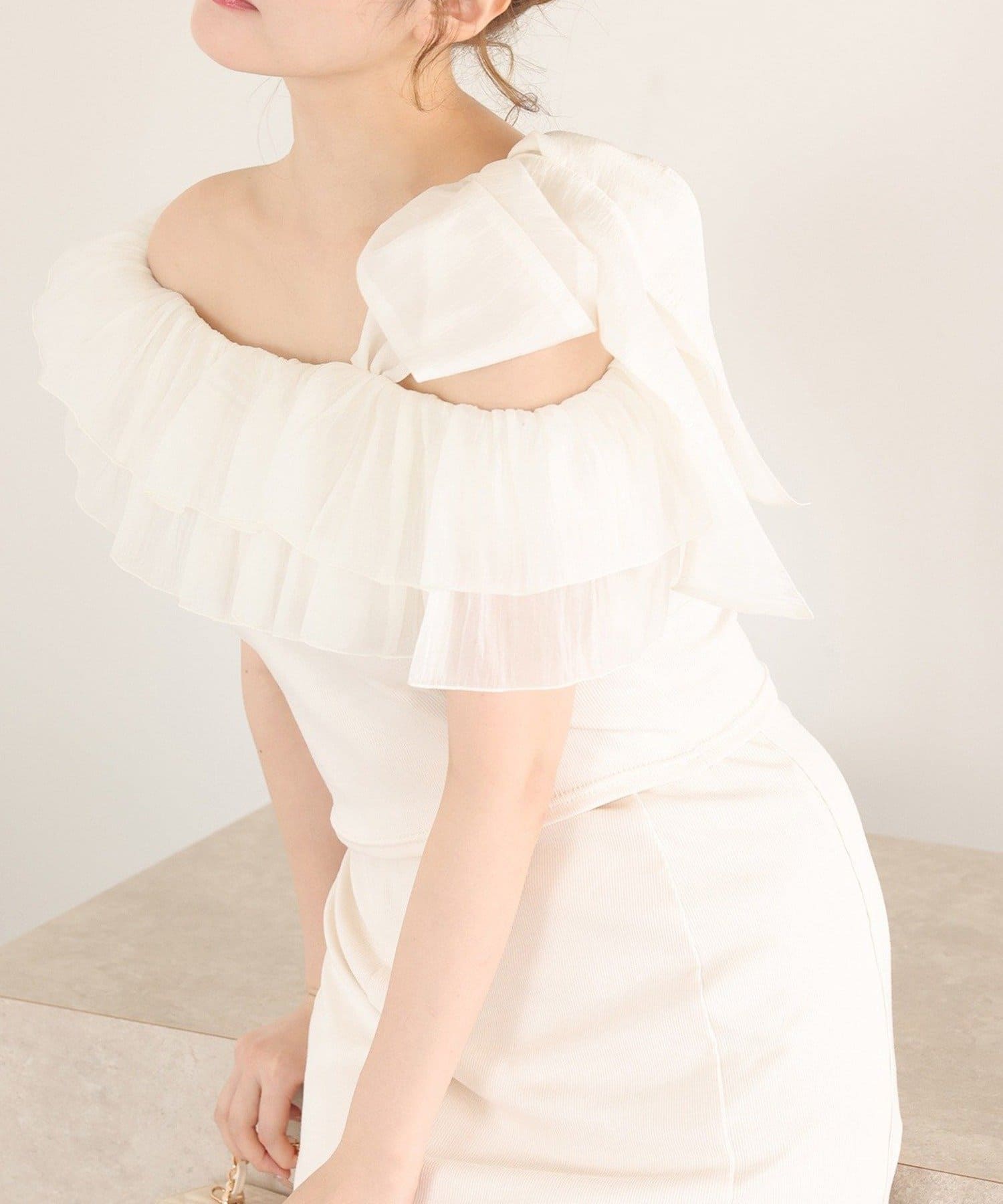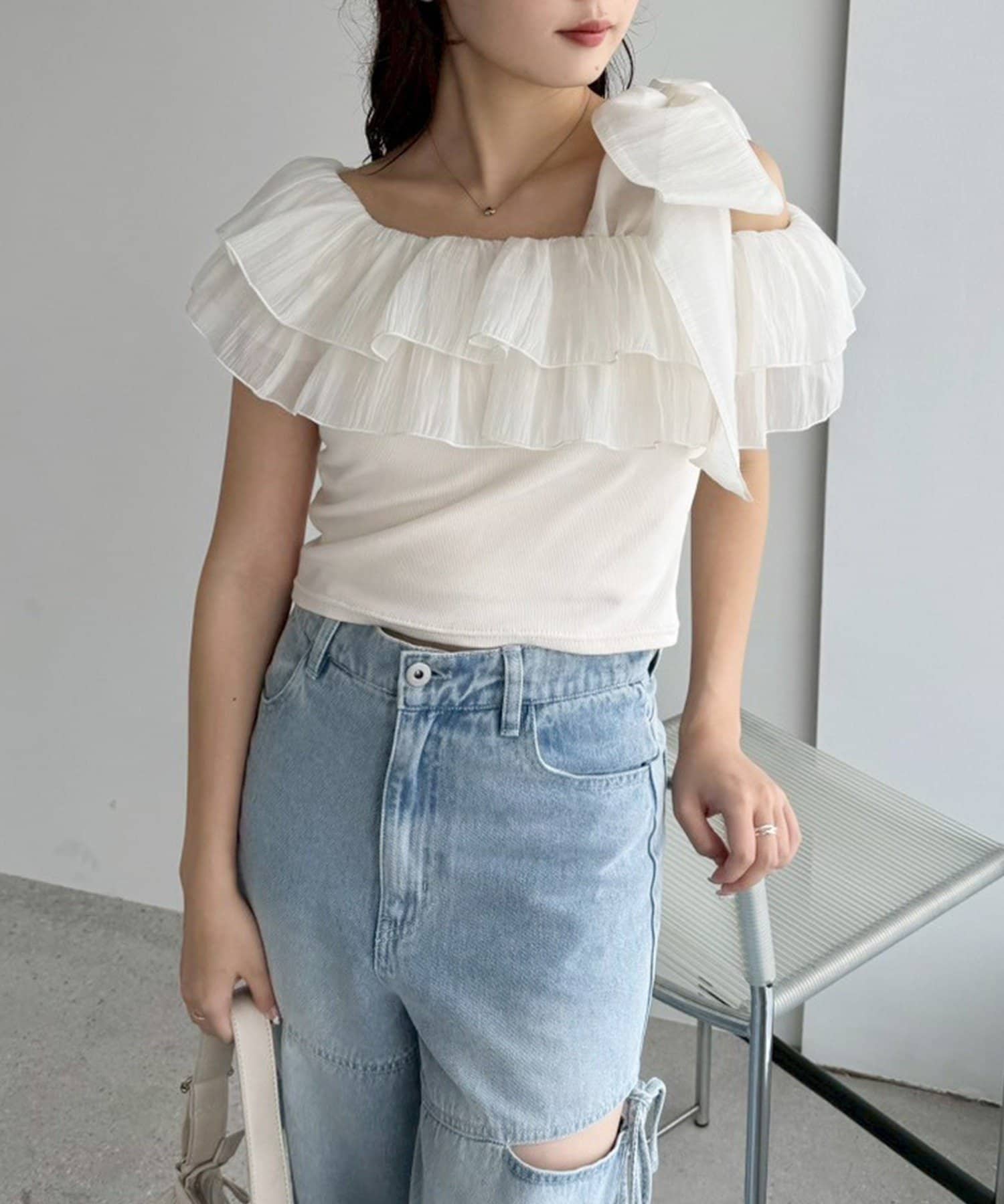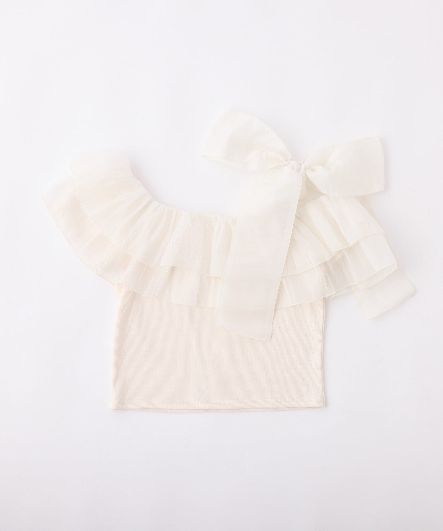 ワンショルダーのシルエットに、たっぷりのフリルと大きめリボンをあしらった主役級トップス。