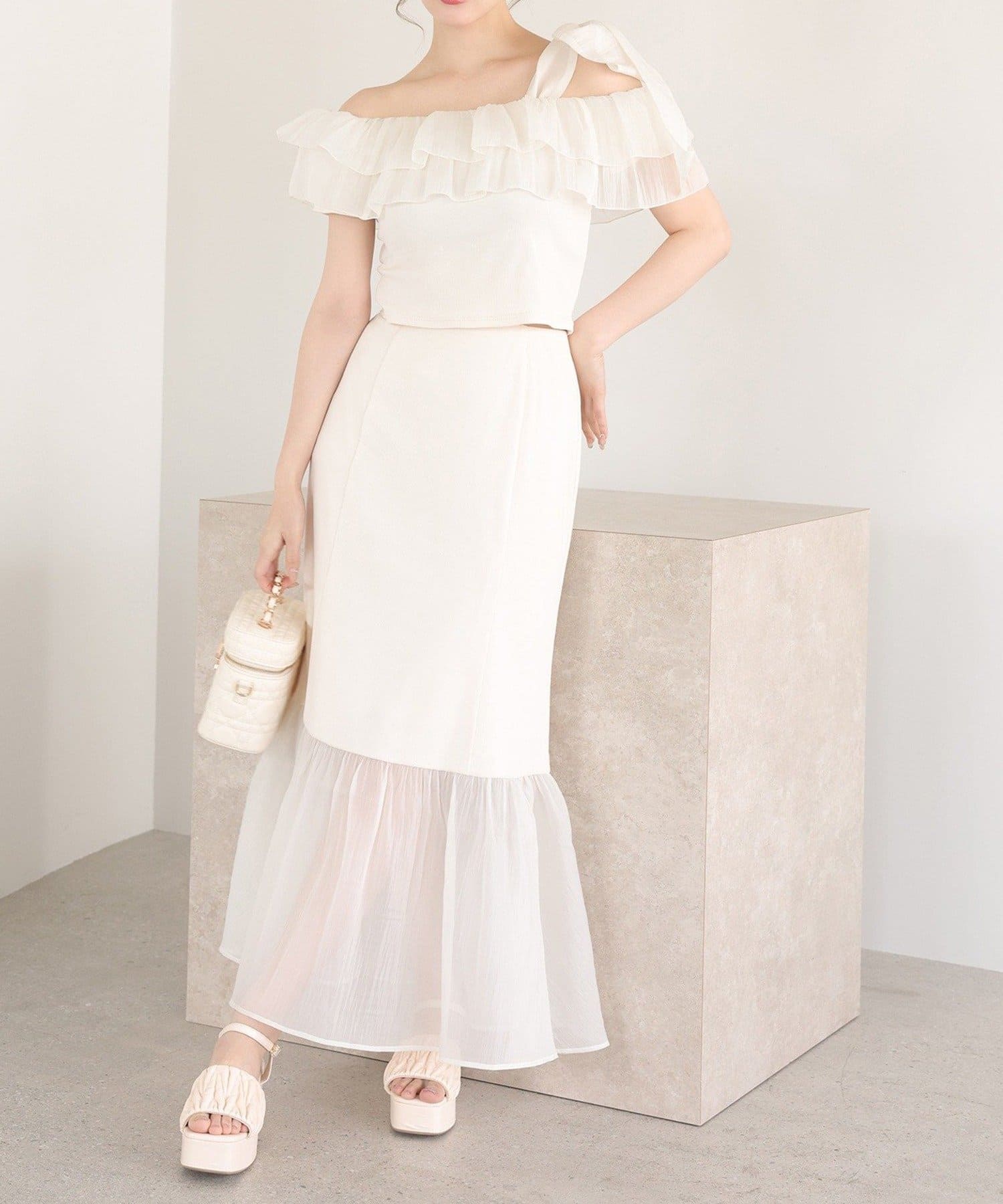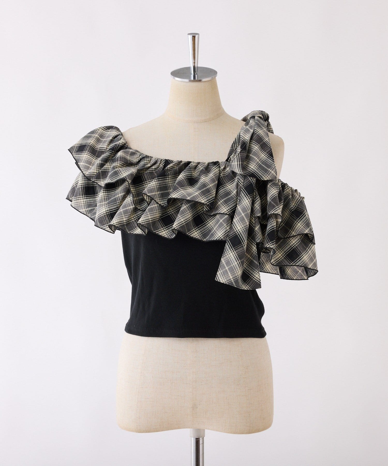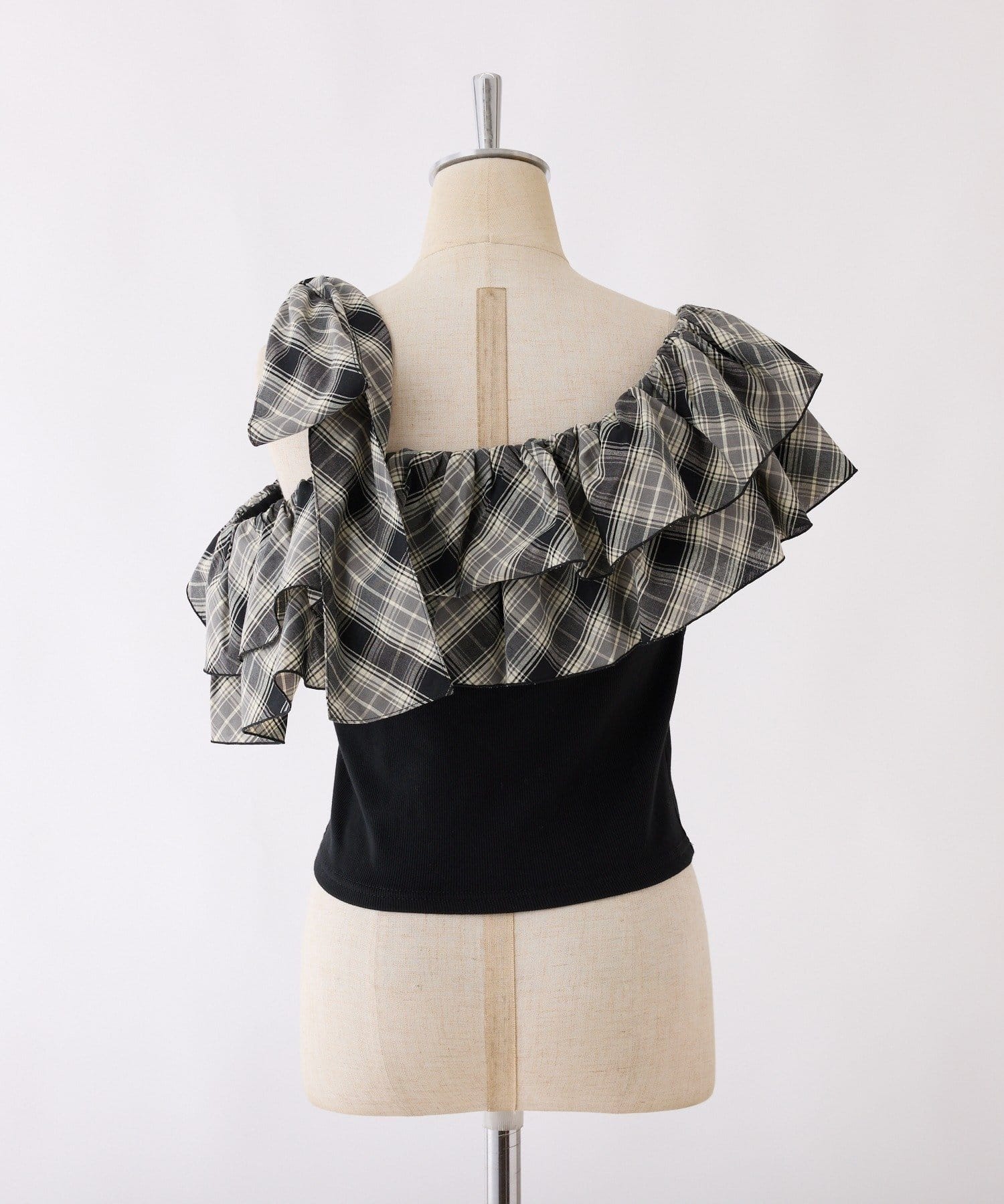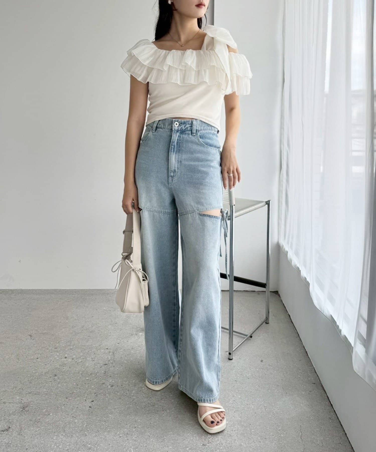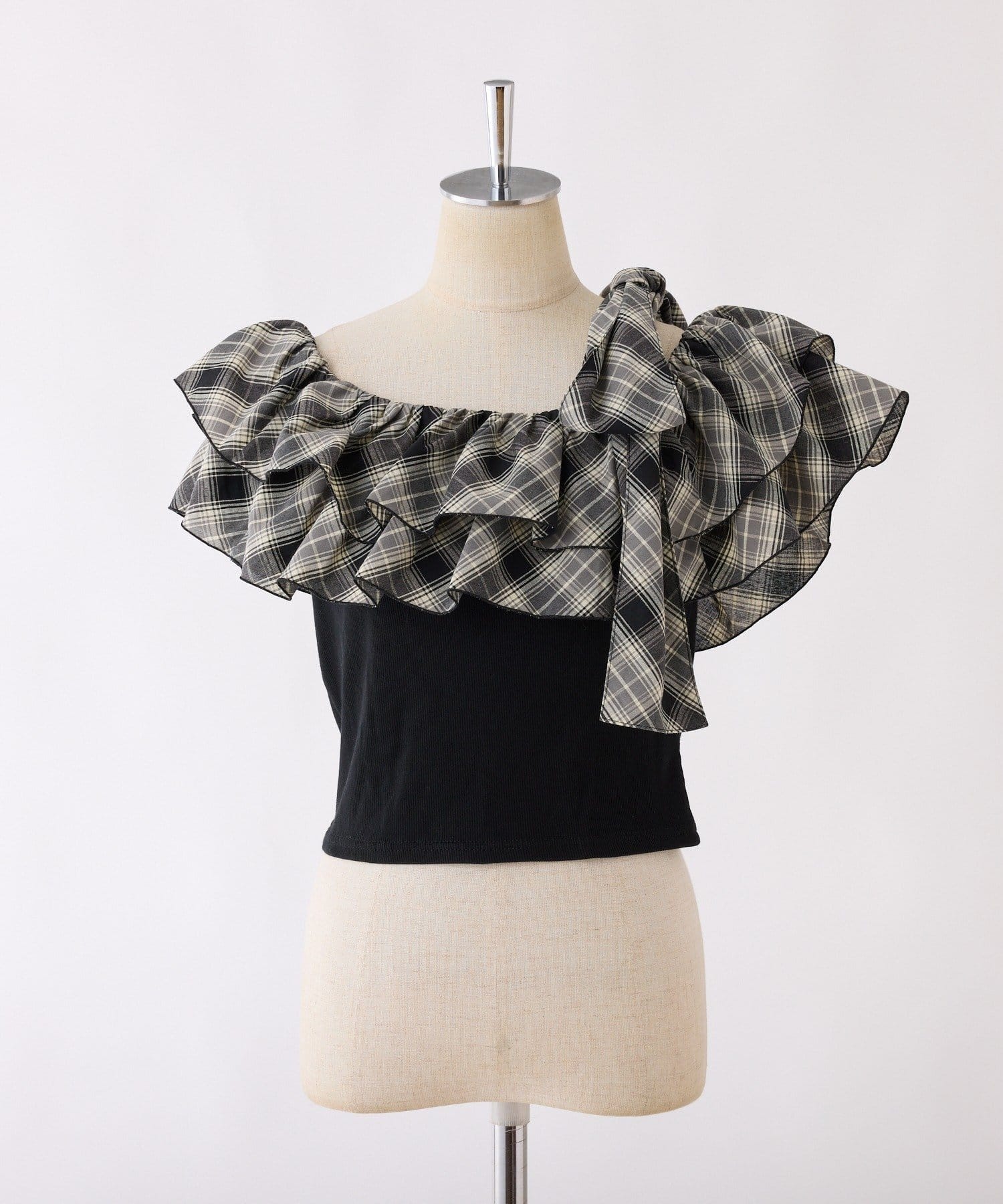 ワンショルダーのシルエットに、たっぷりのフリルと大きめリボンをあしらった主役級トップス。