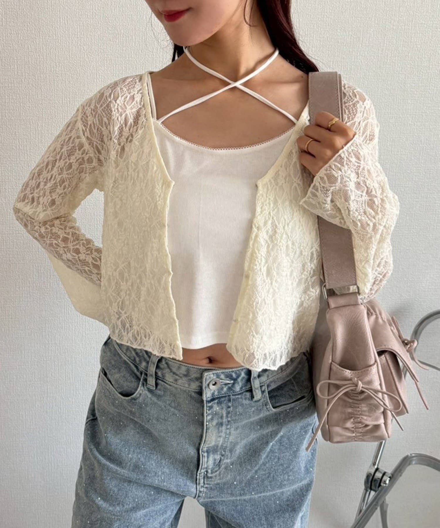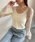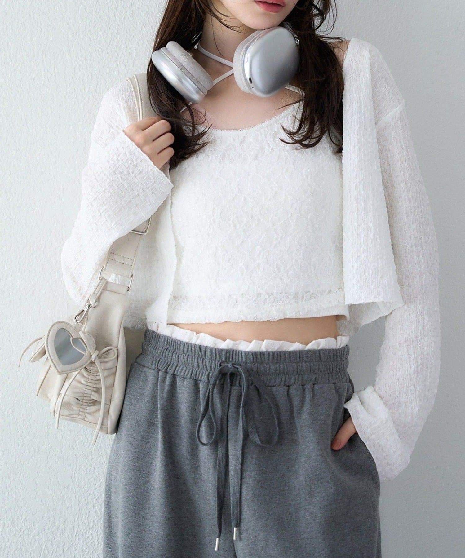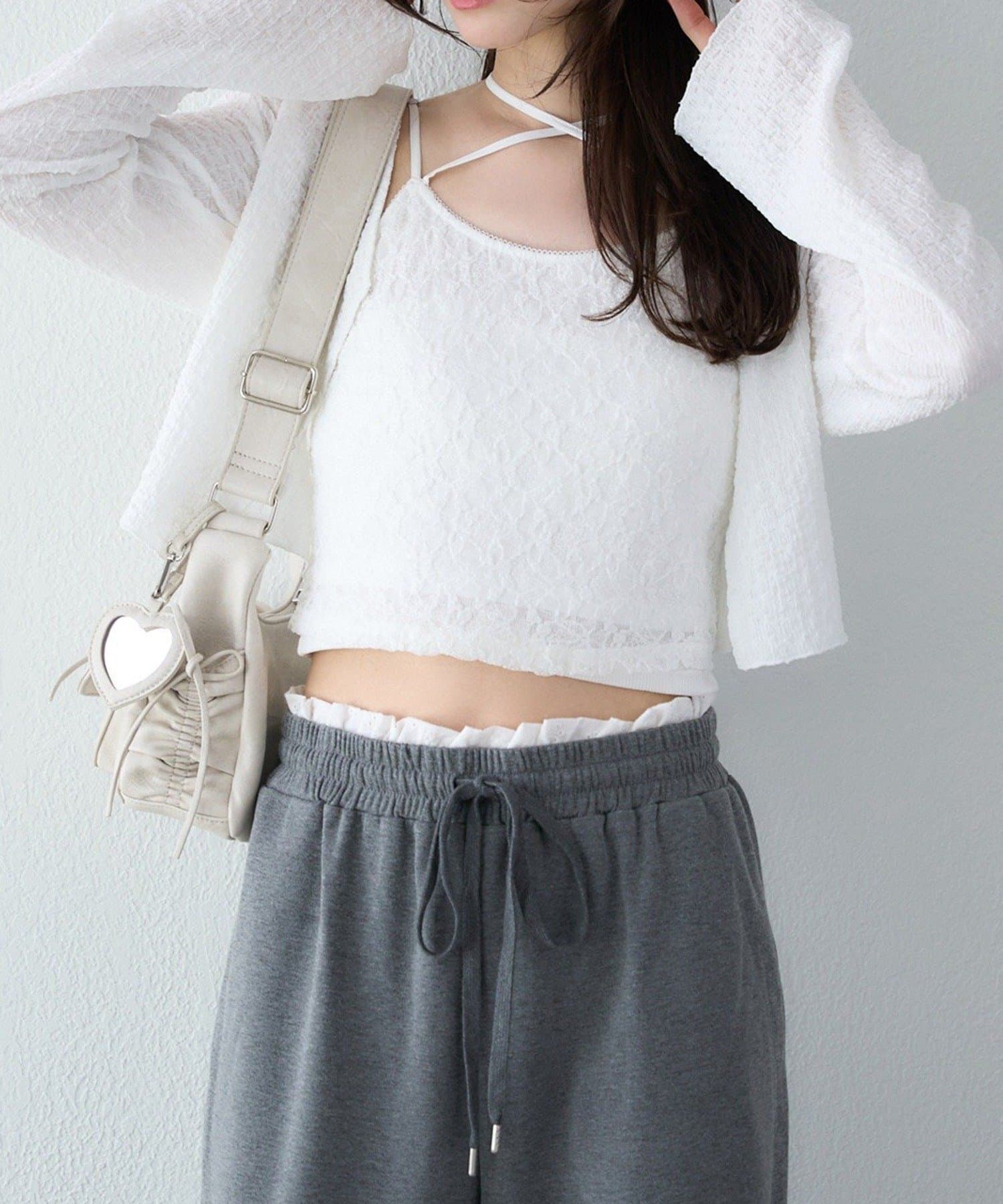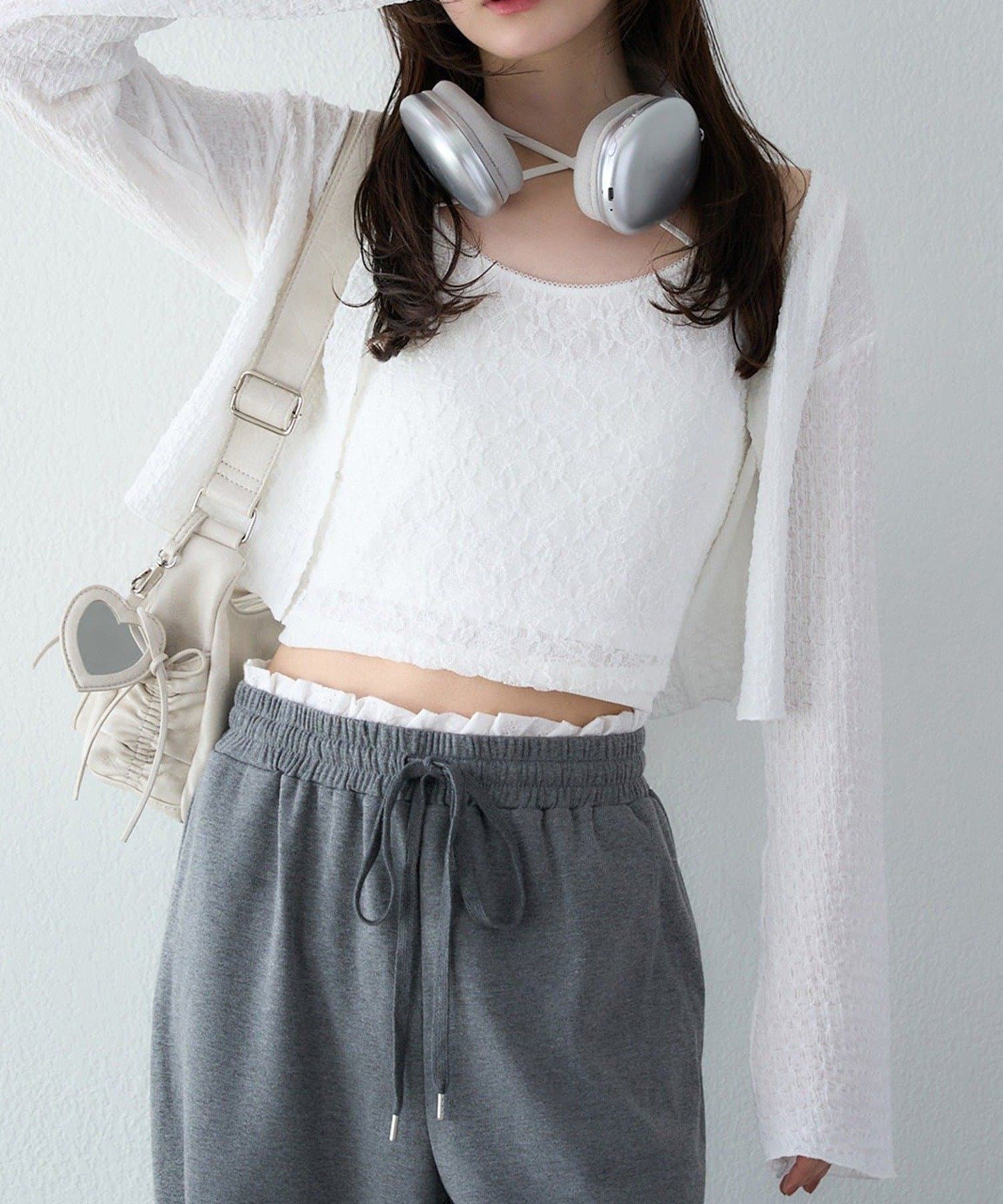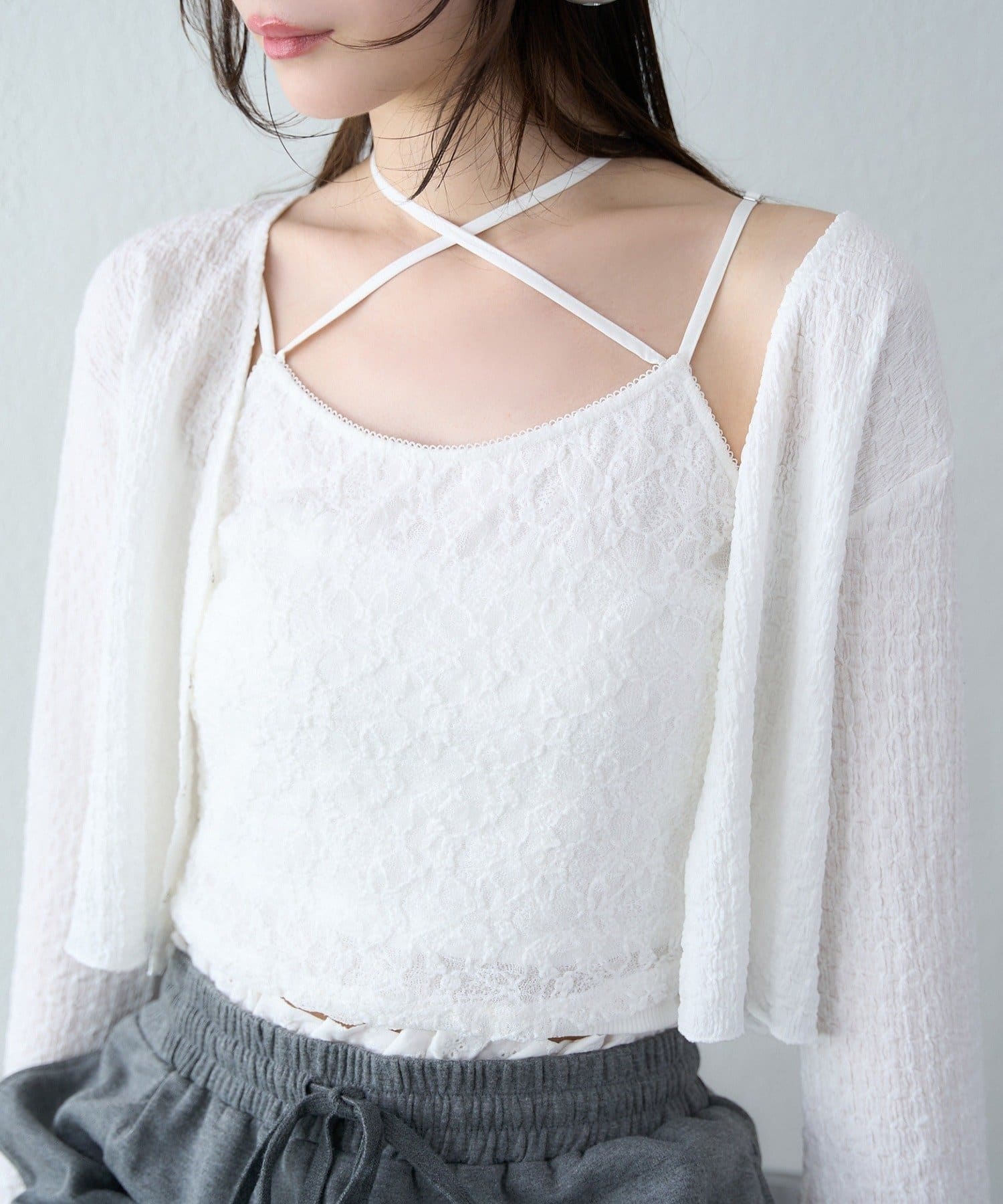 【ホワイト系その他(レース生地カーディガン)】カーディガン:ポリエステル95% ポリウレタン5% キャミナイロン90% ポリウレタン10%