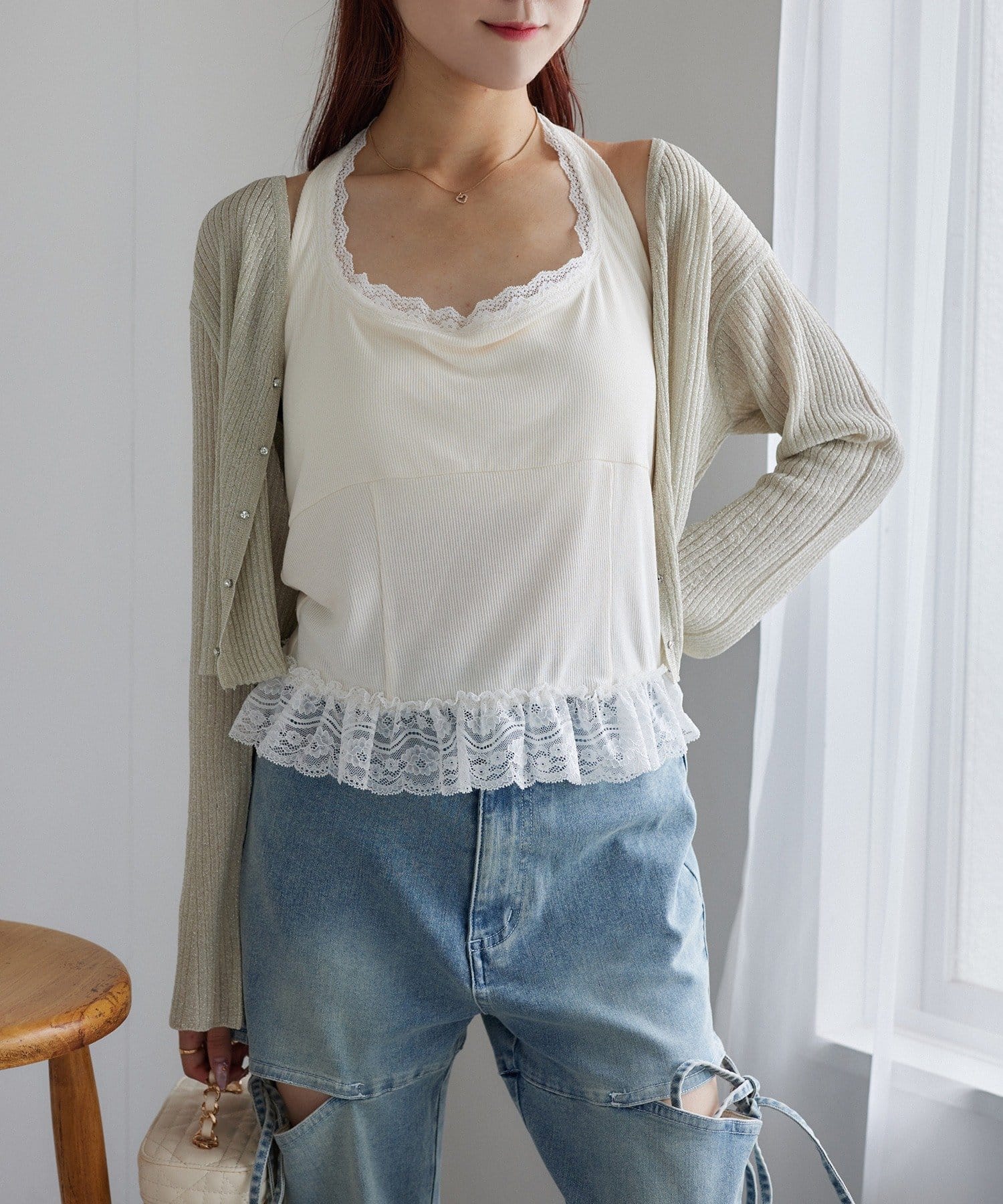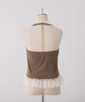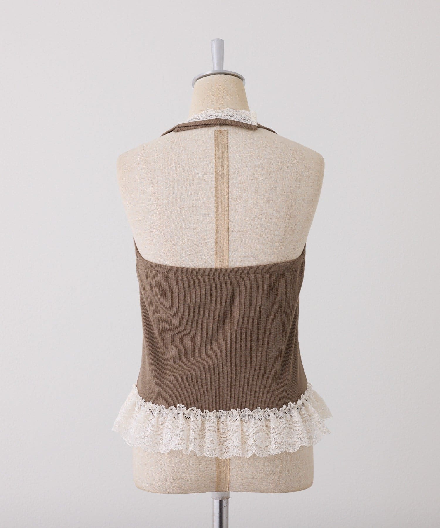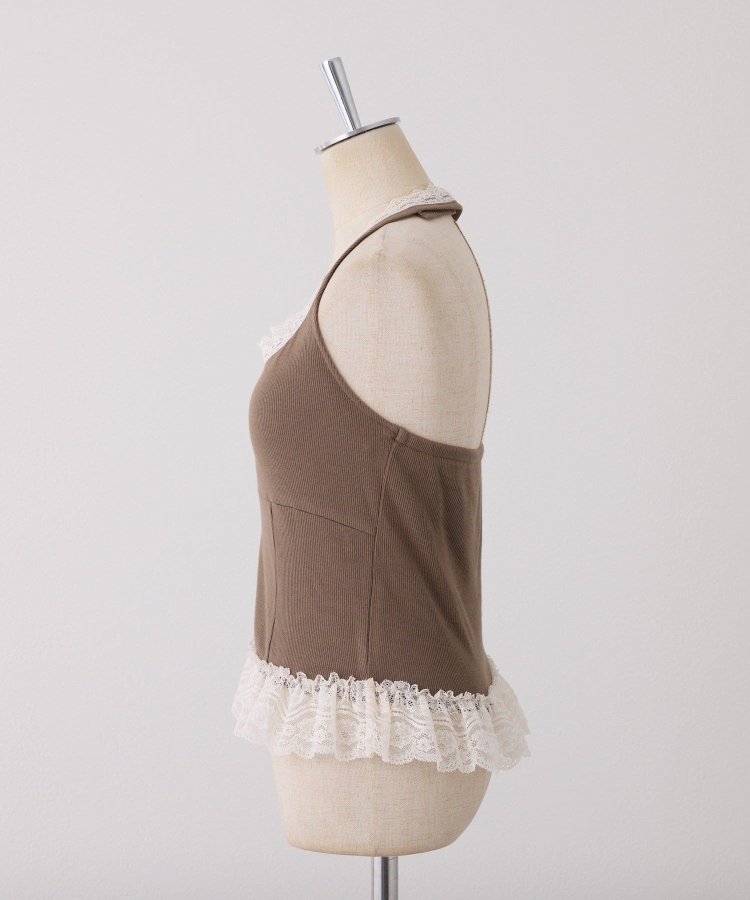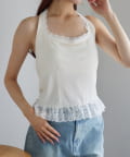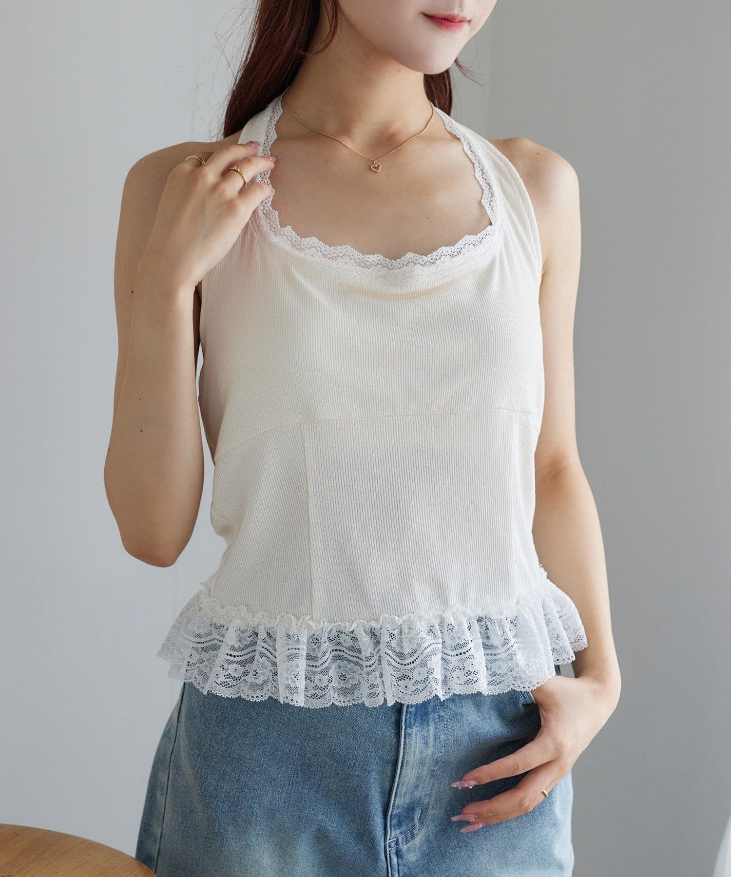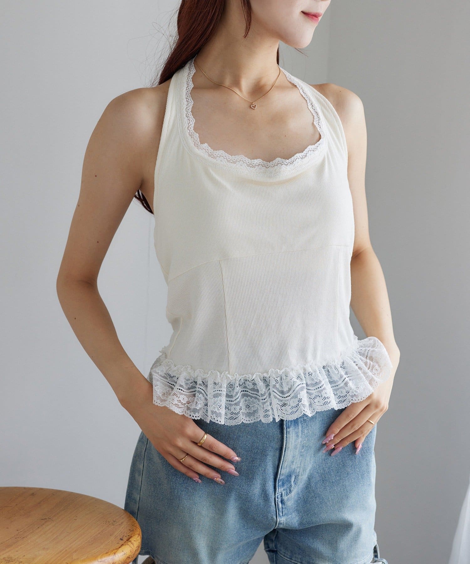 ノースリーブのカットソーに、繊細なレースが施されたホルターネックがあしらわれたトップス。