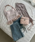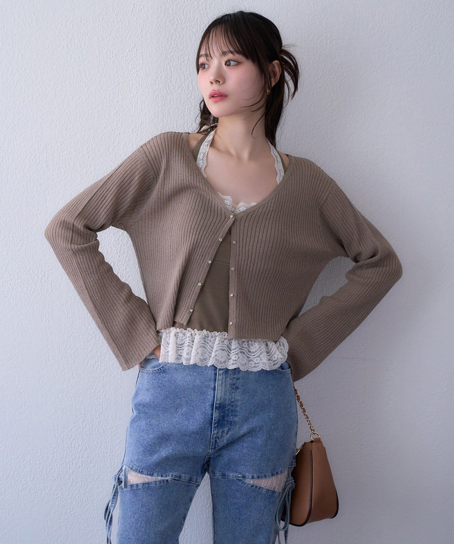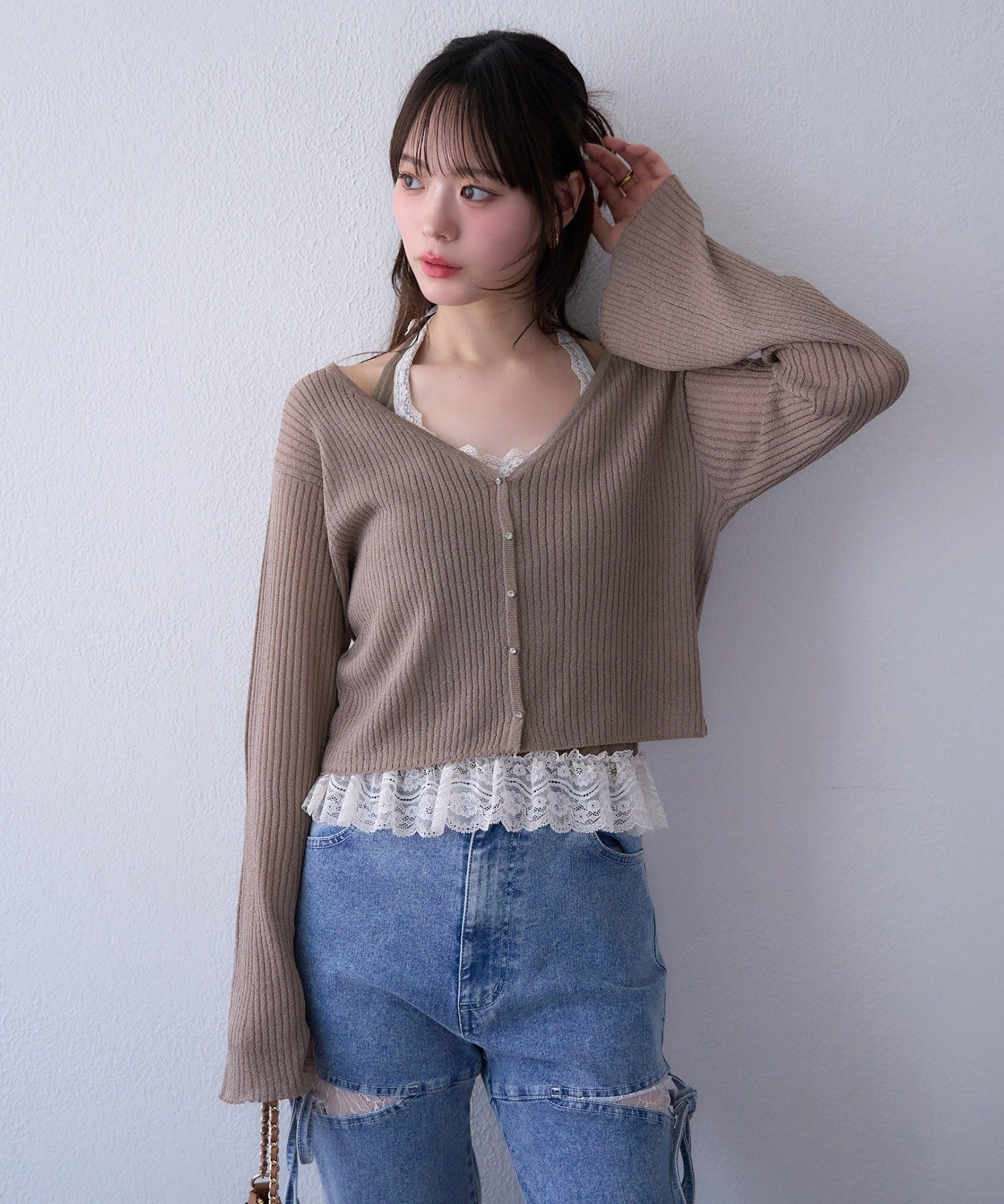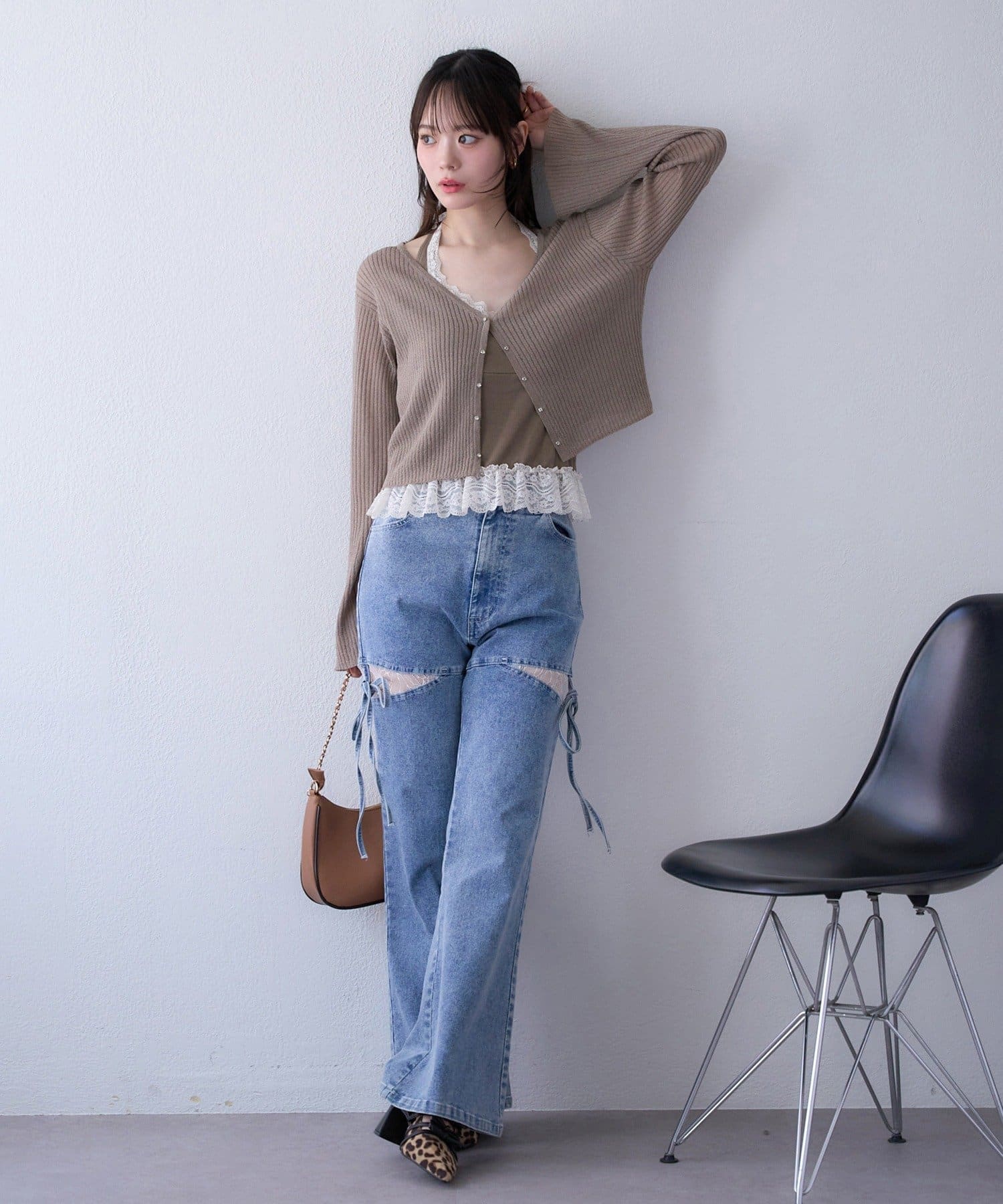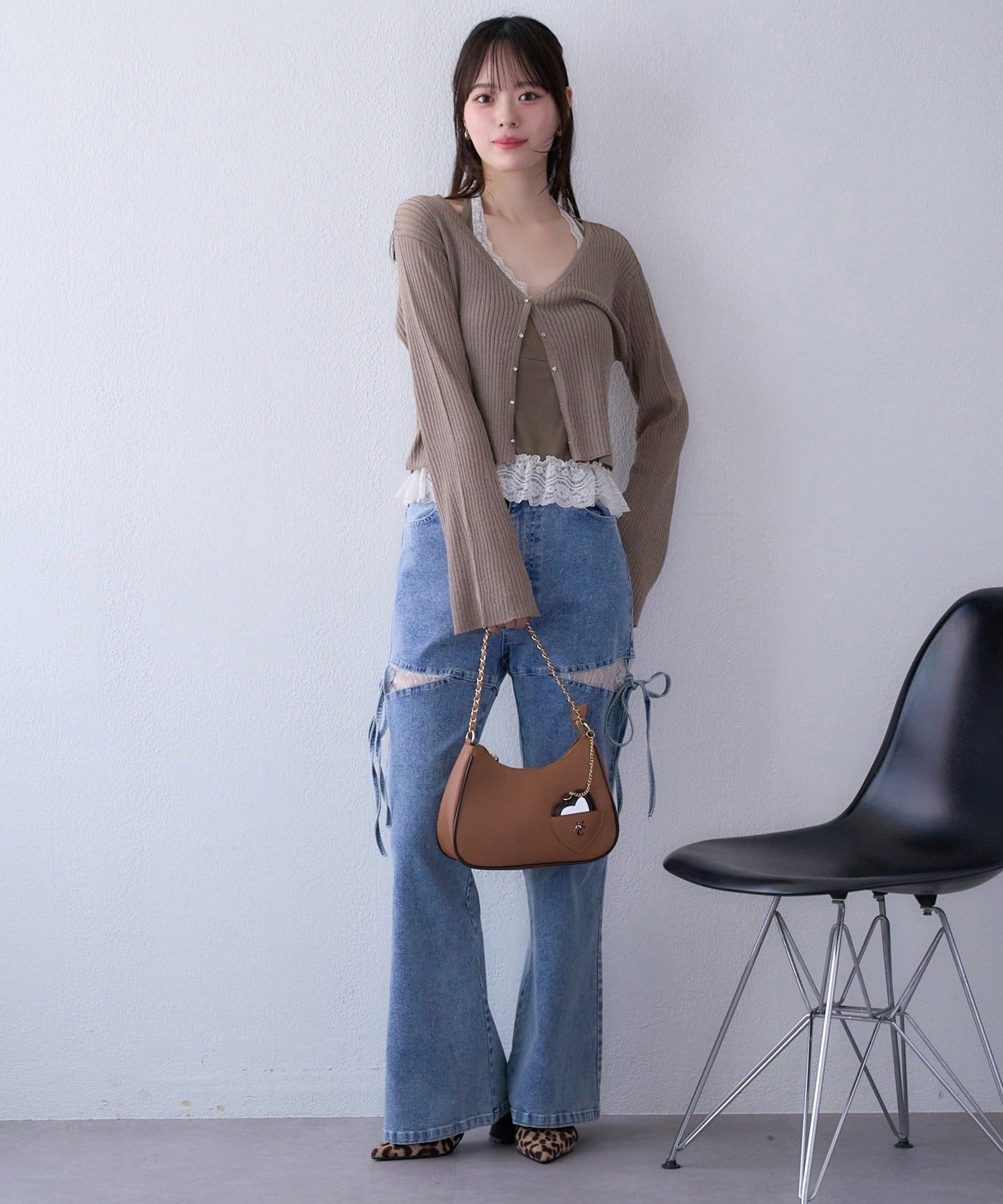 シアーカーディガンを羽織ってデニムを合わせてヘルシーな肌見せコーデに。