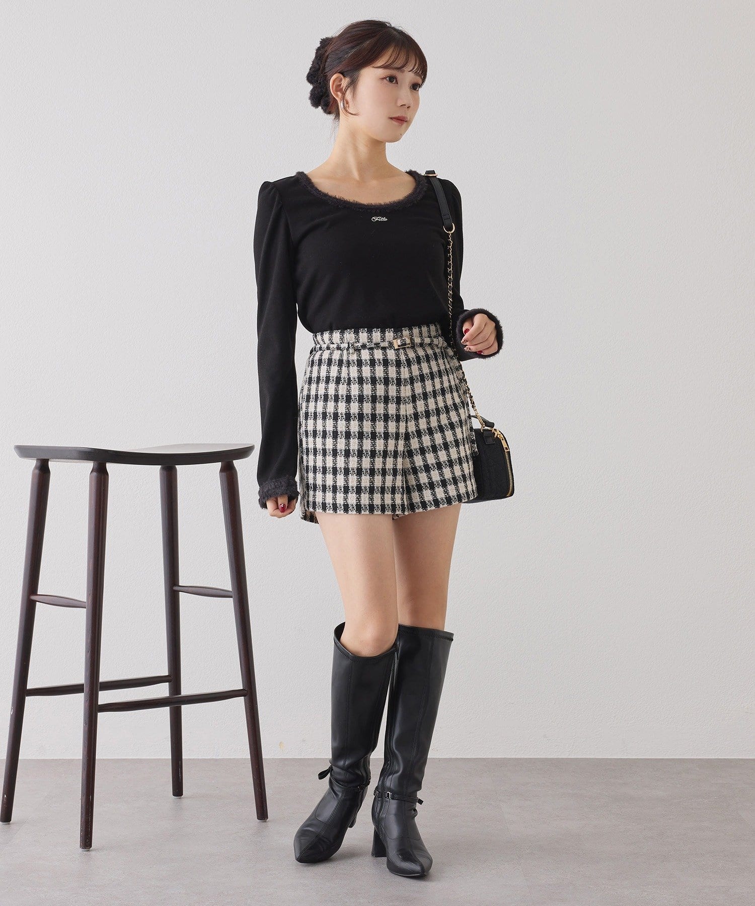 そのまま1枚でミニワンピース風に着こなしてブーツ合わせの大人ガーリーコーデに