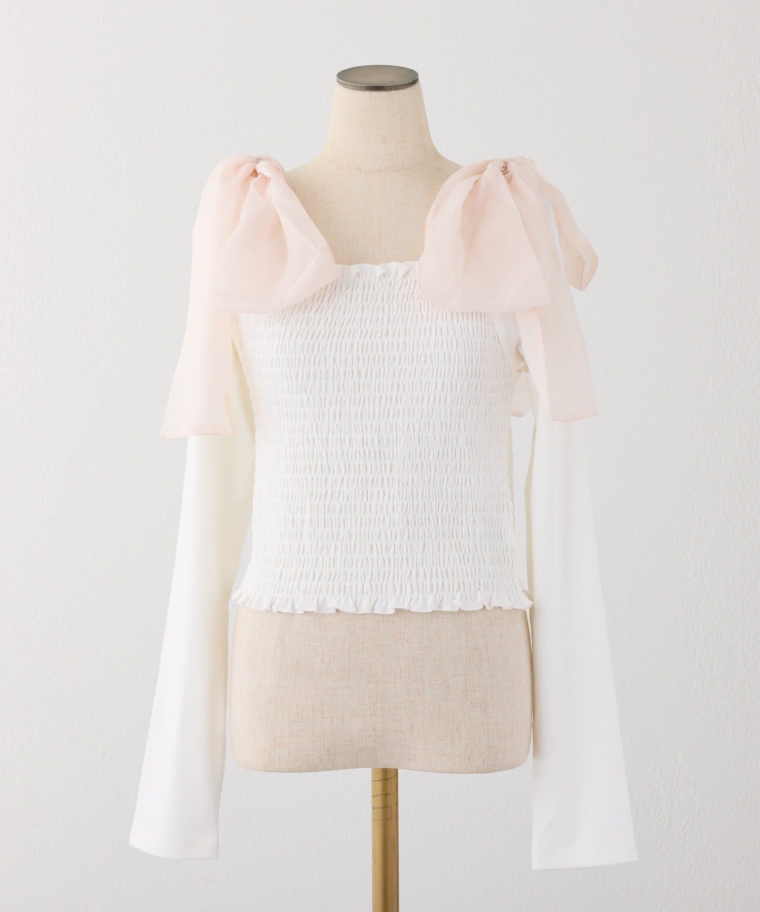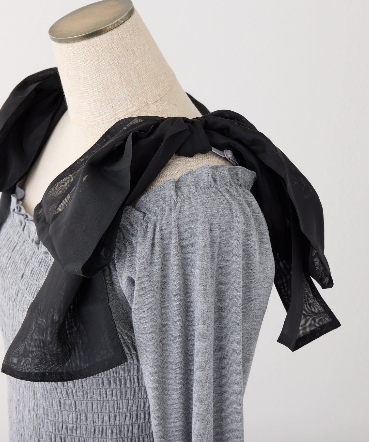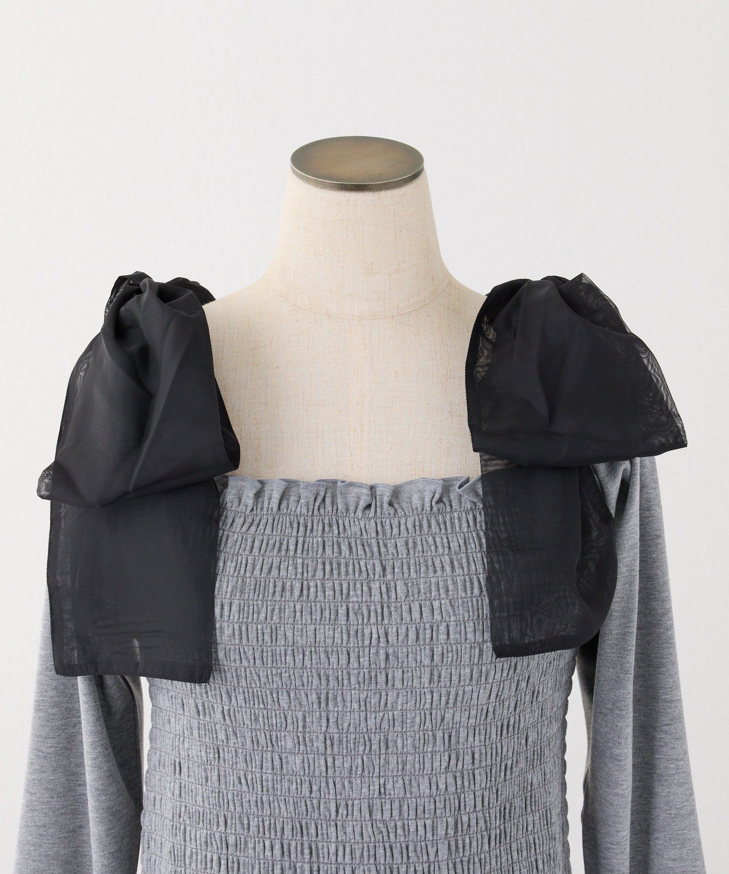 肩にはリボンがあしらわれていて、シンプルながらもガーリーなアクセントをプラスしてくれます。