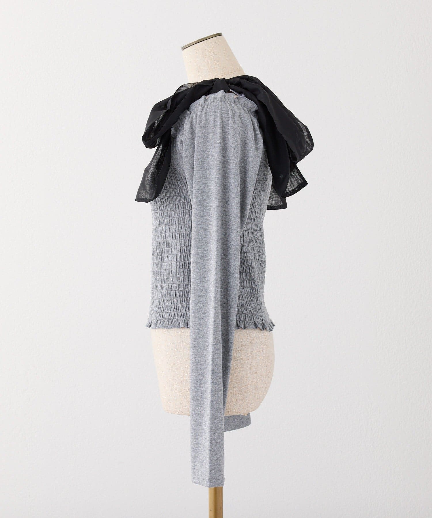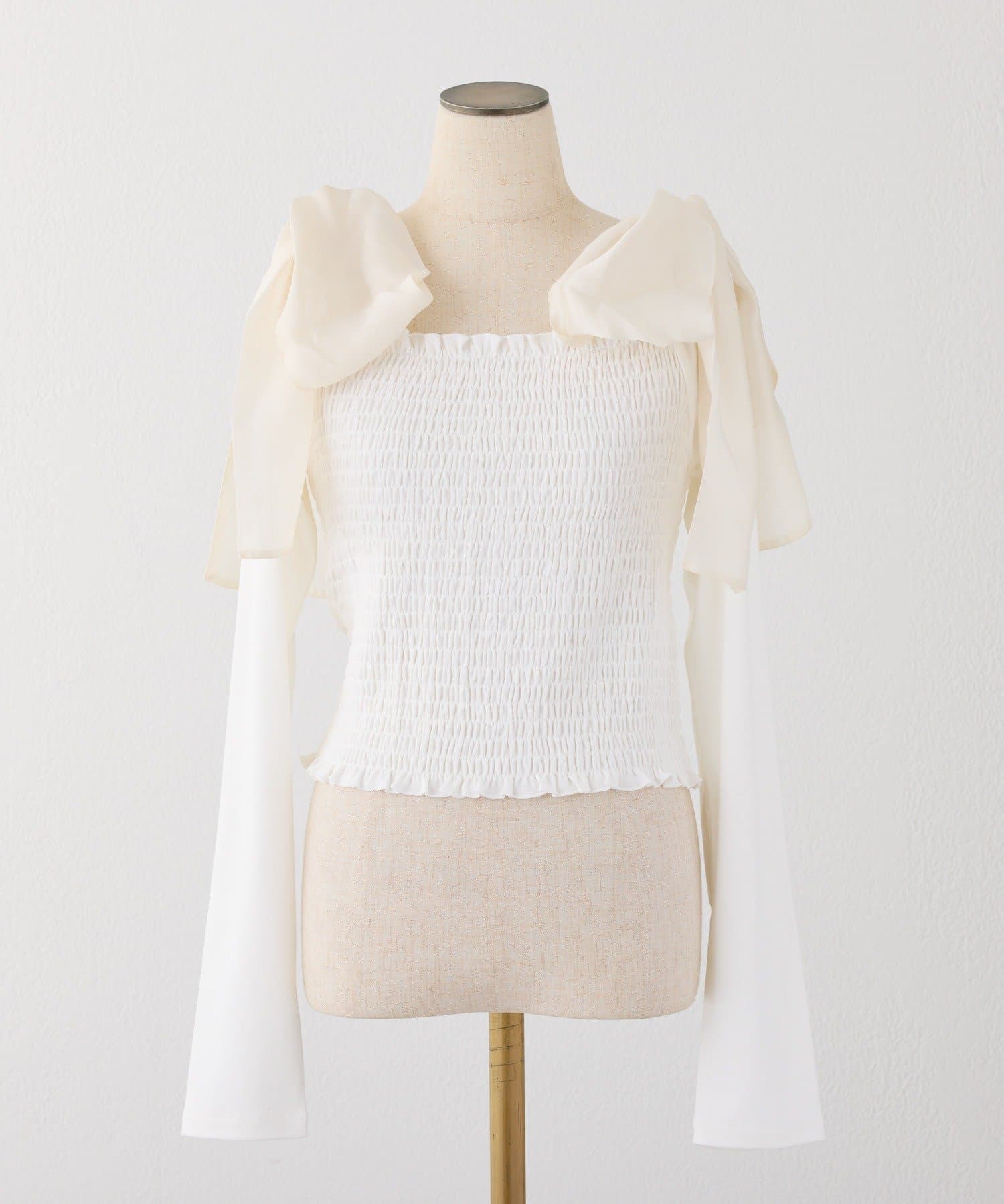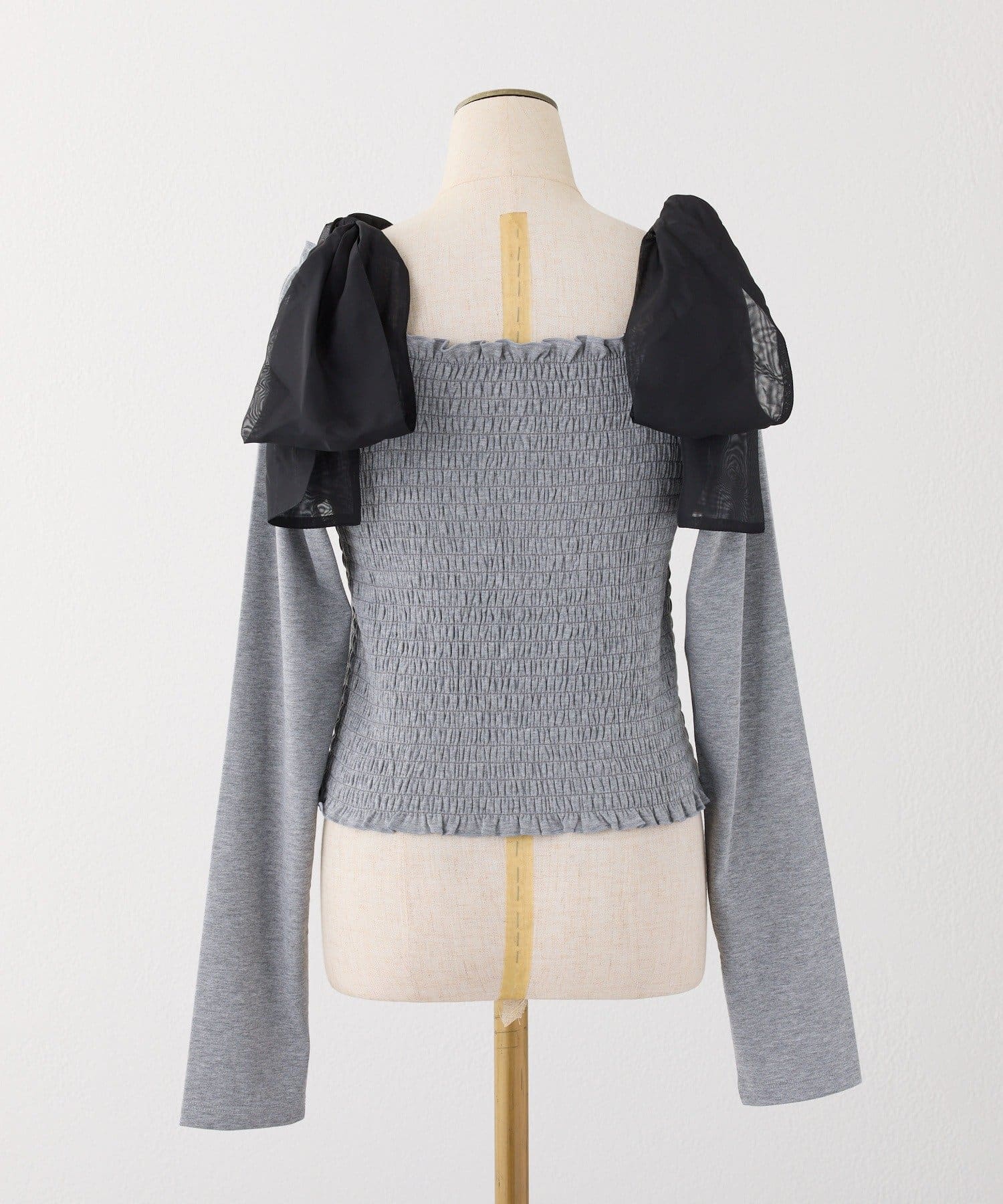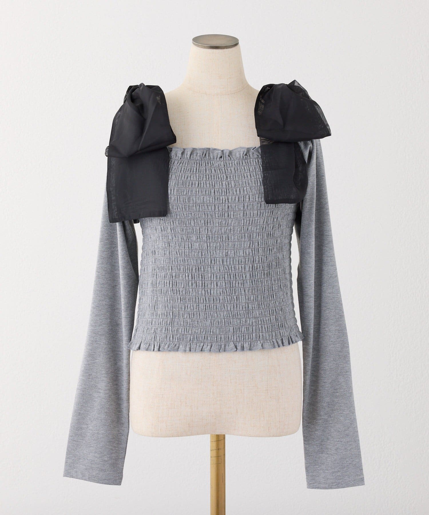 肩にはリボンがあしらわれていて、シンプルながらもガーリーなアクセントをプラスしてくれます。