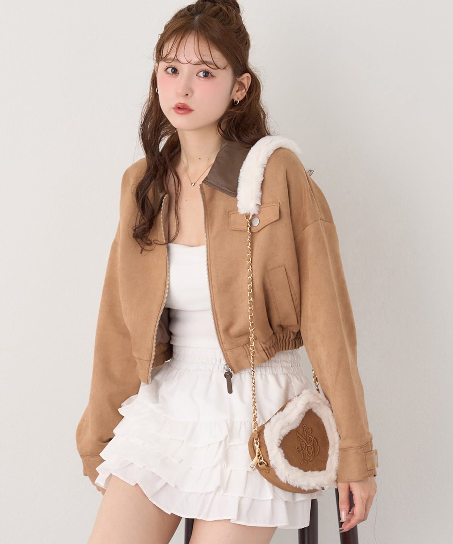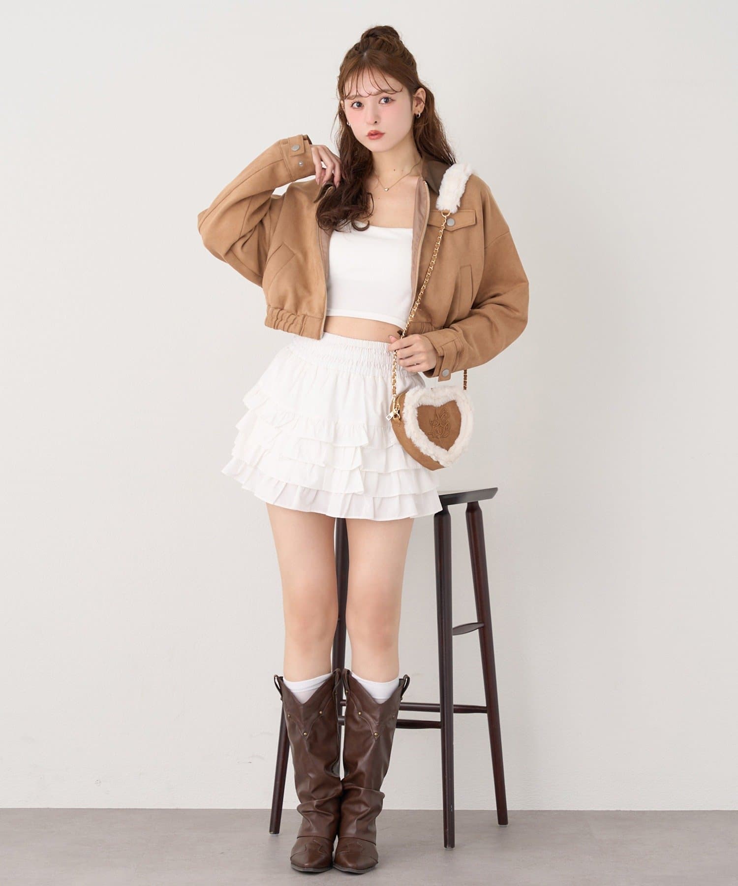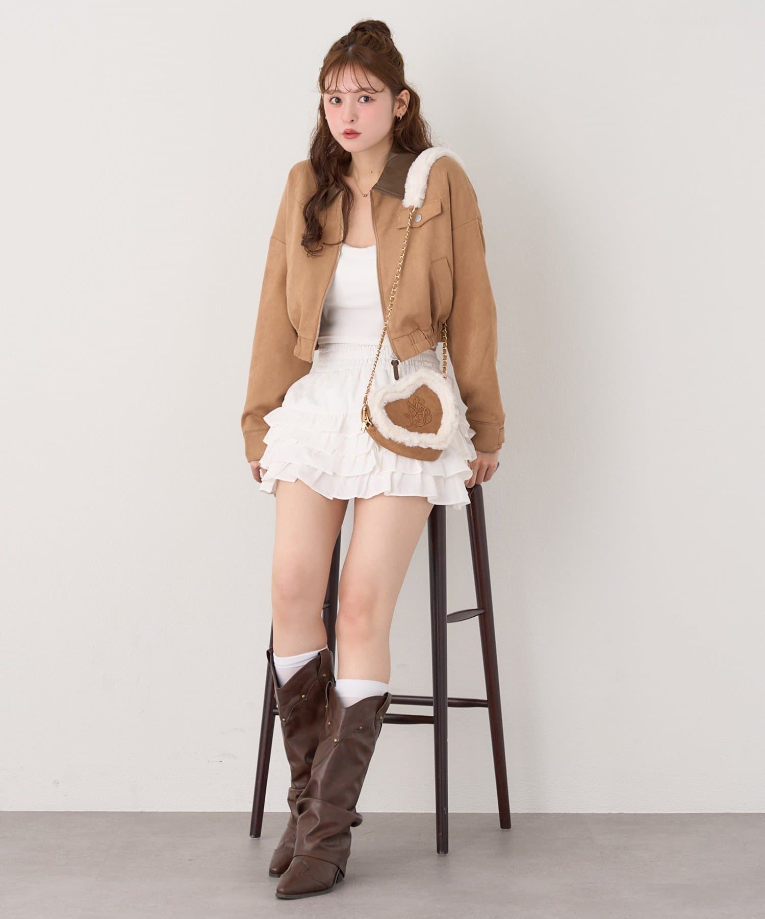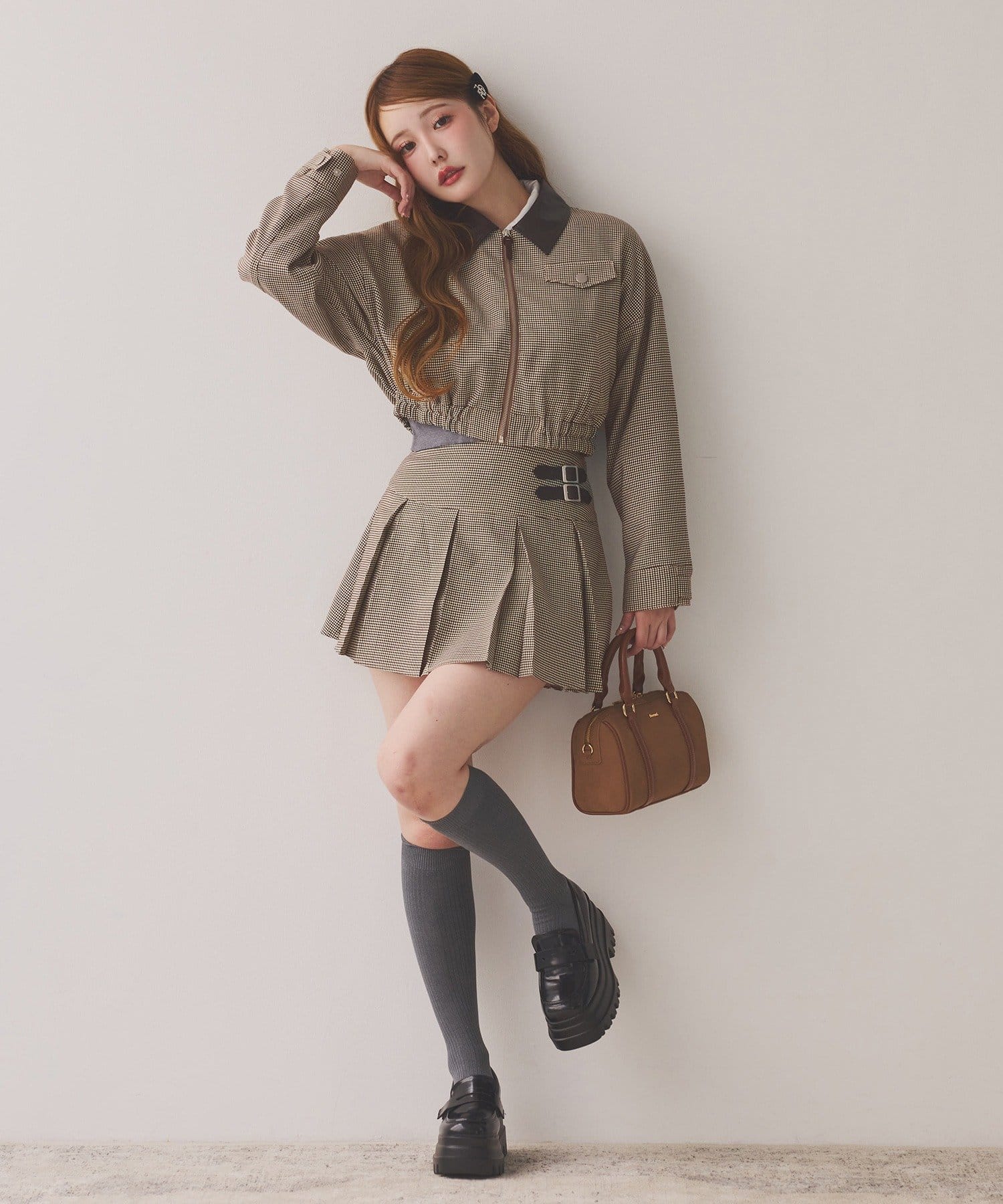 ミニボトム×ハイソックス×スニーカーで、トレンドライクなスタイルに。