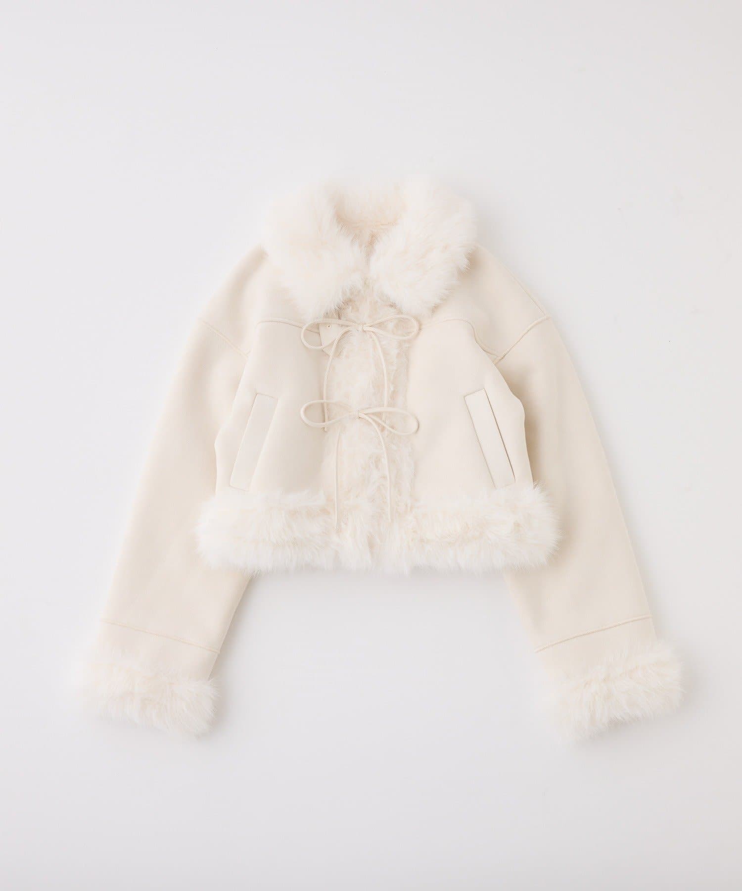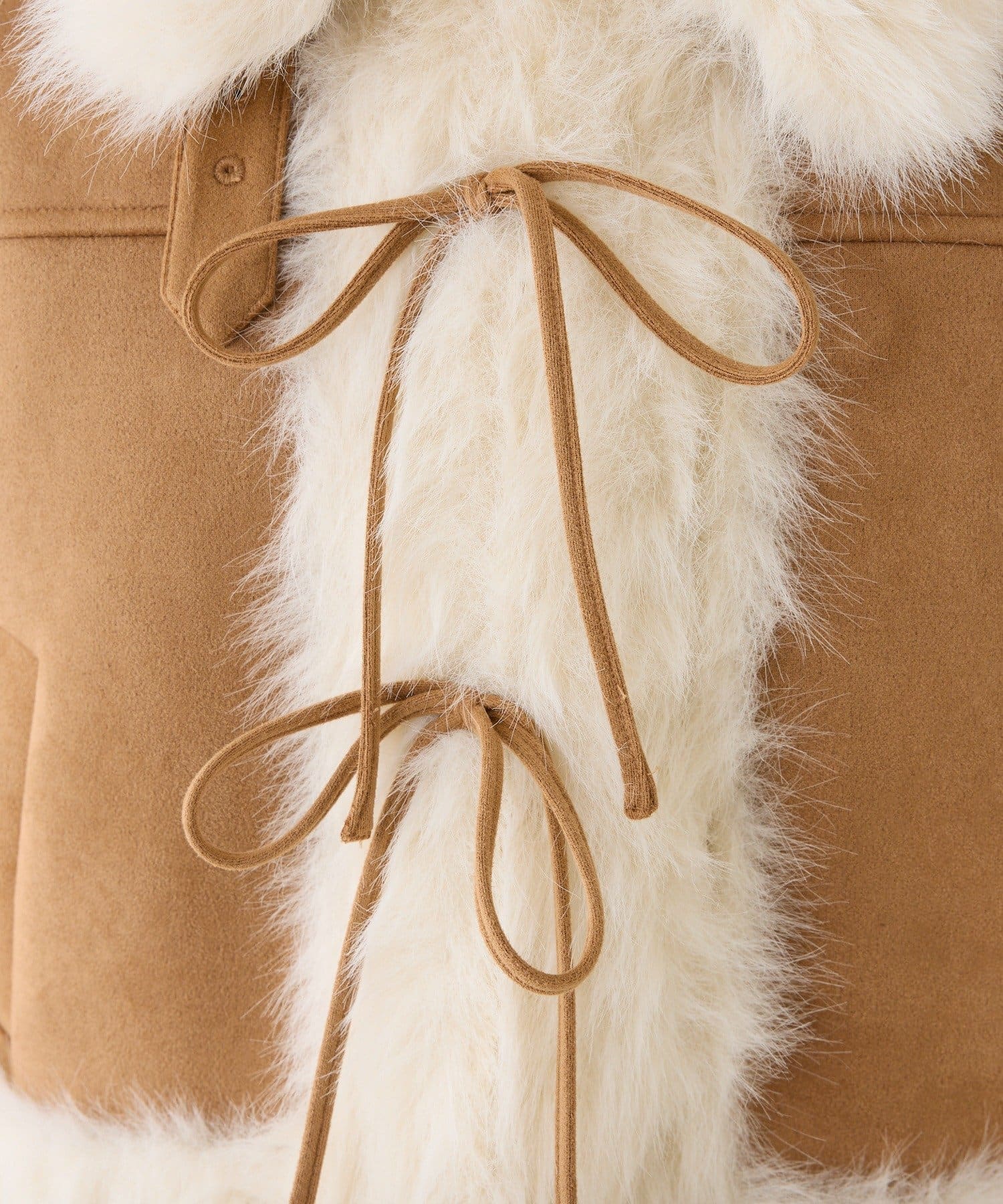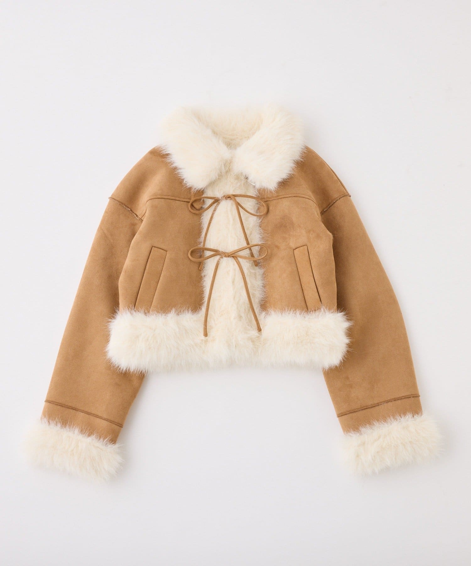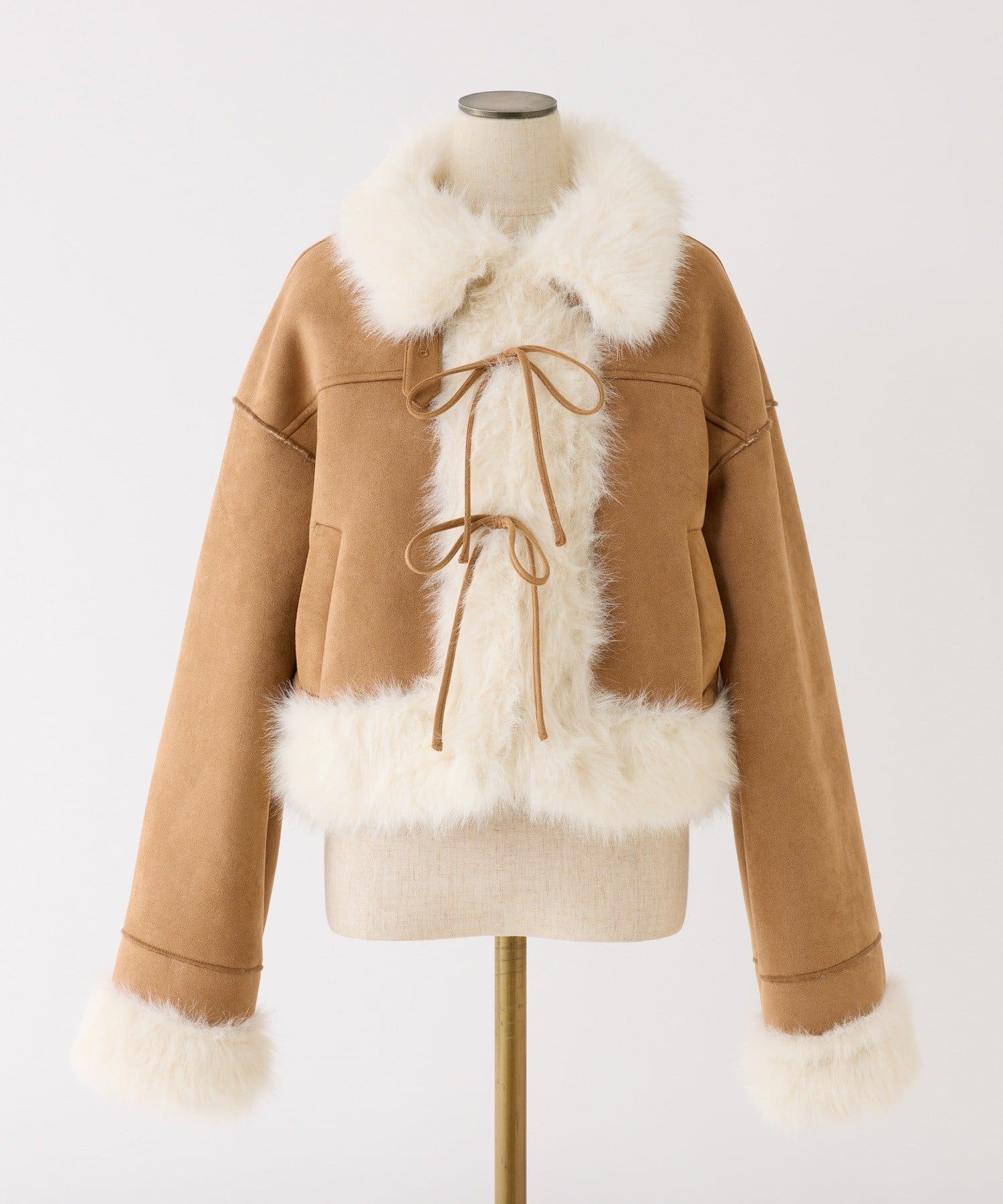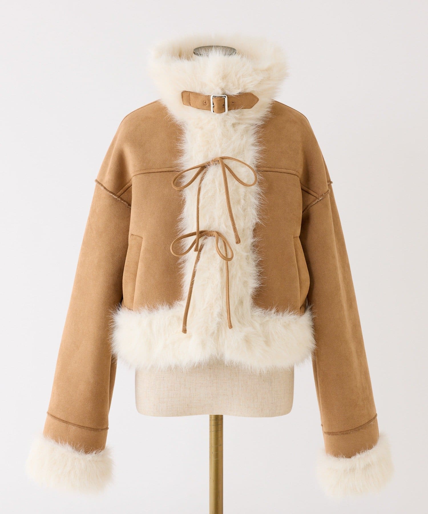 リボンディテールが可愛いアクセントになったショート丈のフェイクムートンコート。
