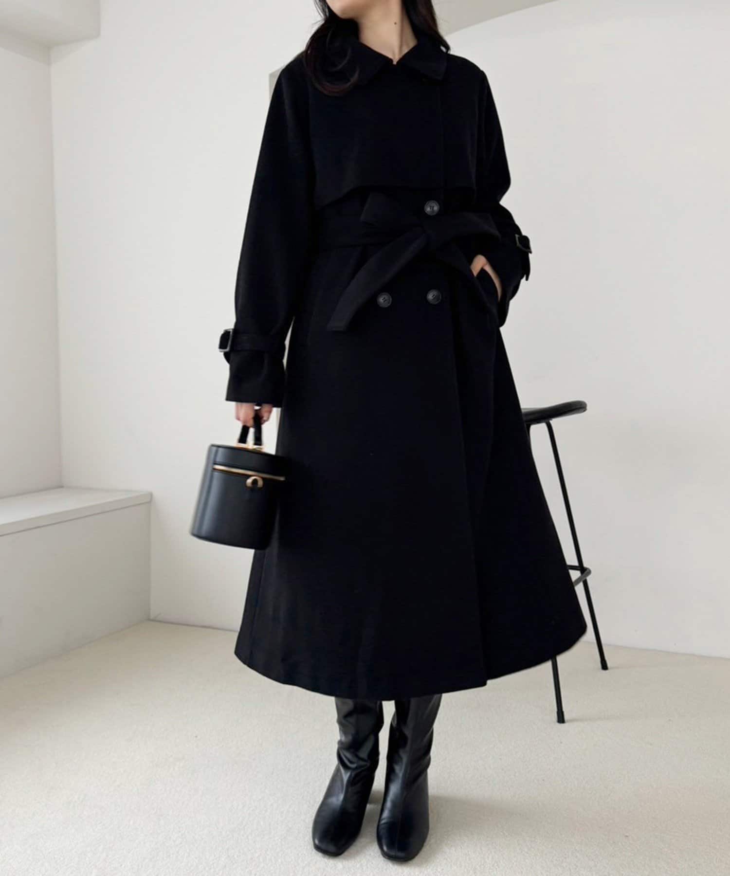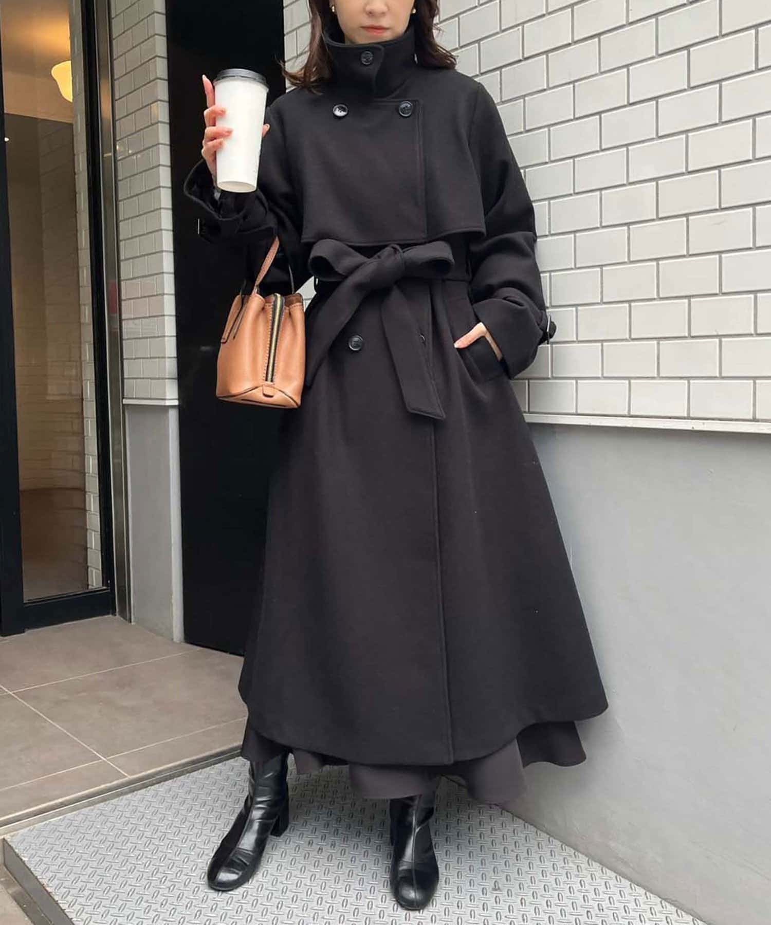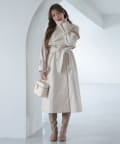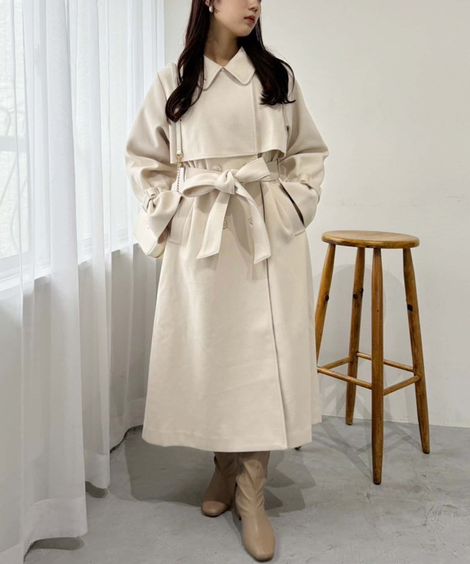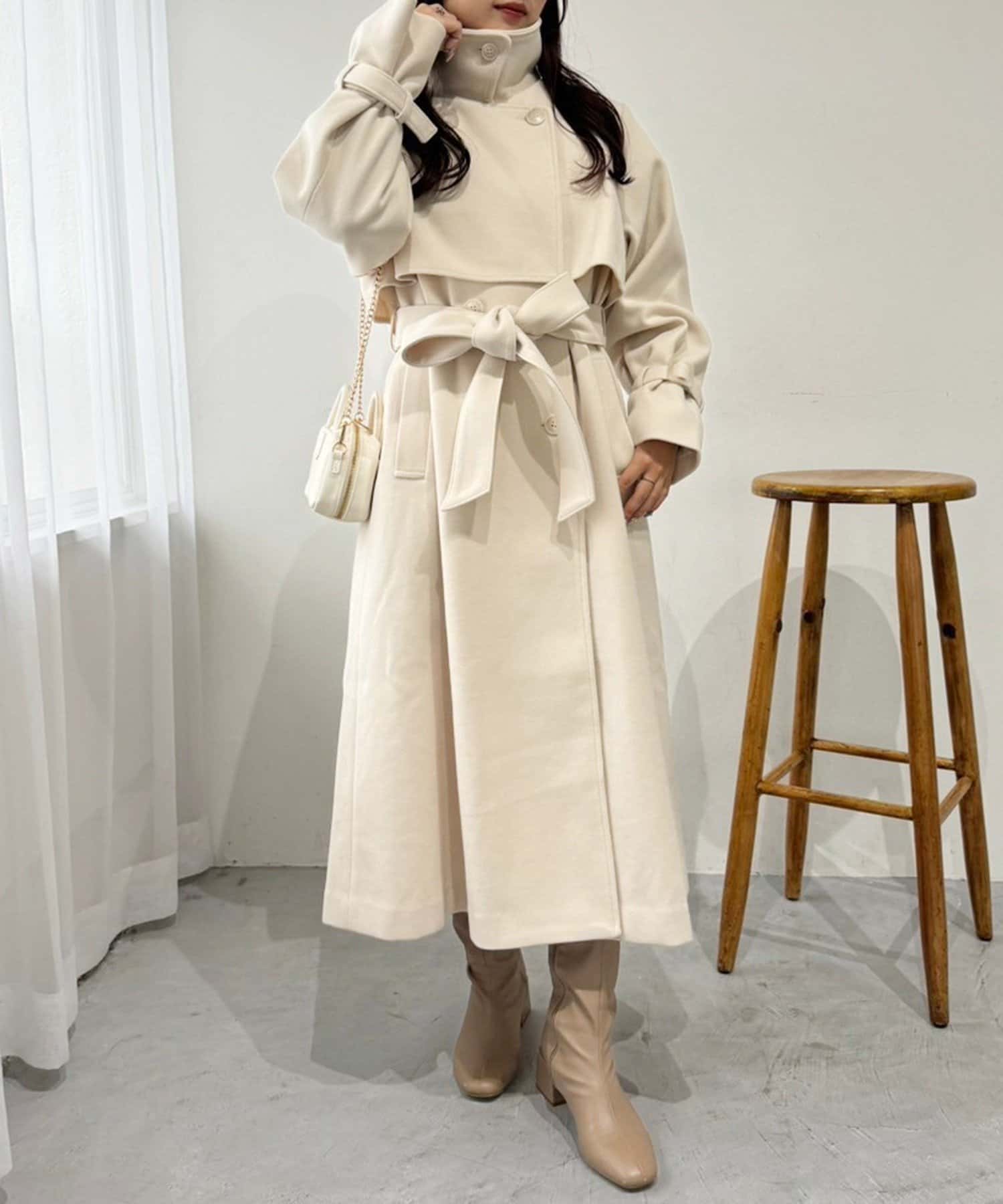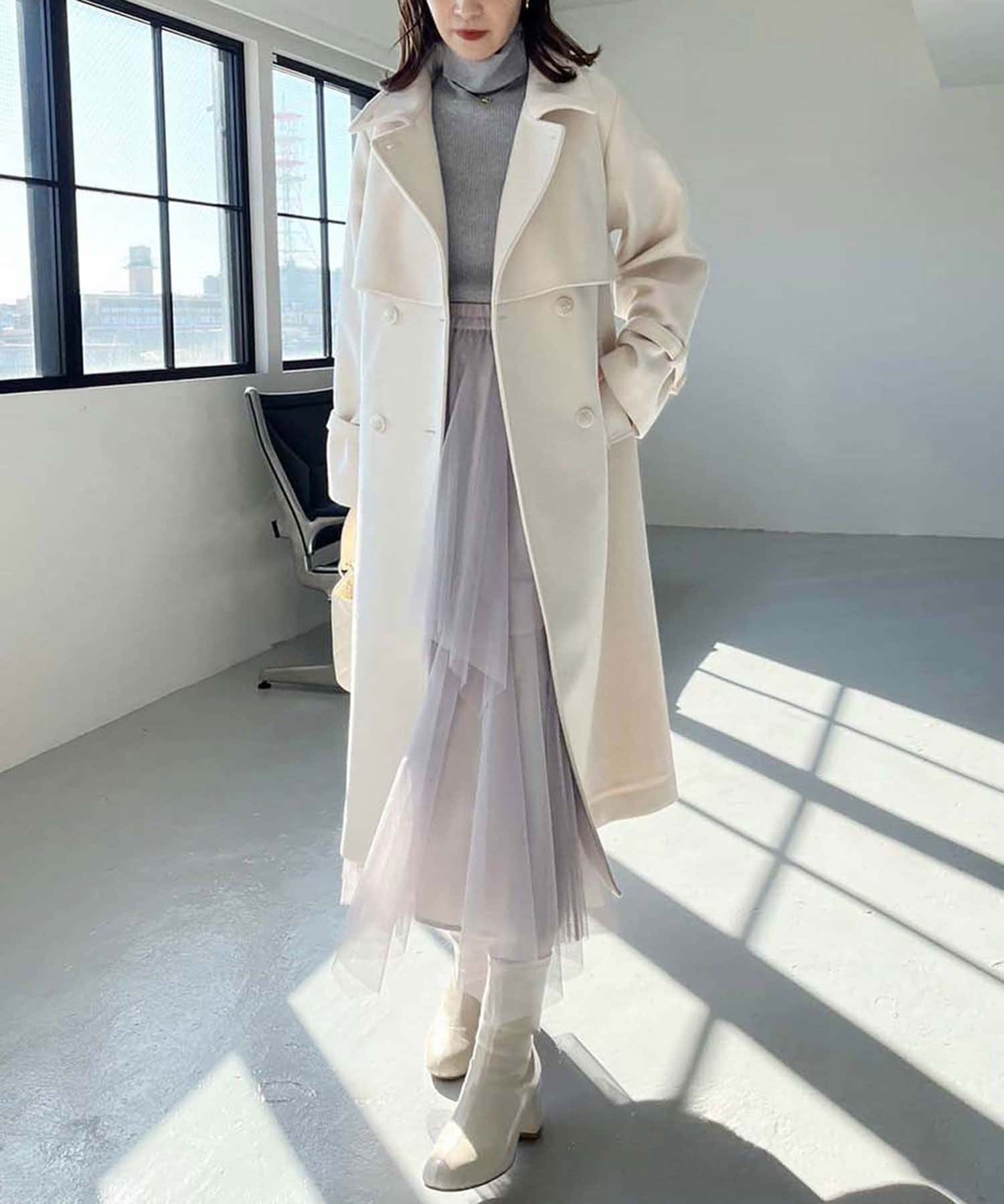 上品な印象になるステンカラーコートは、フレアスカートやワンピース合わせがオススメ。
