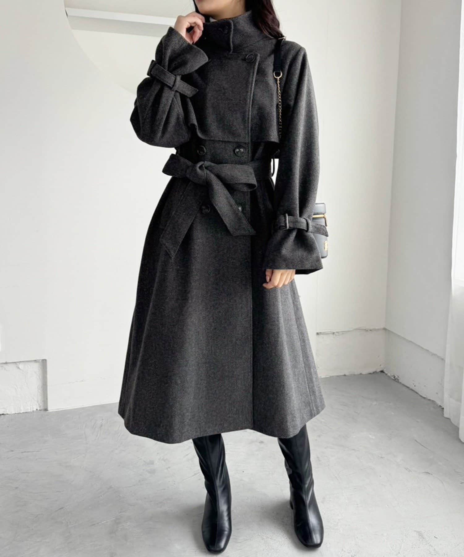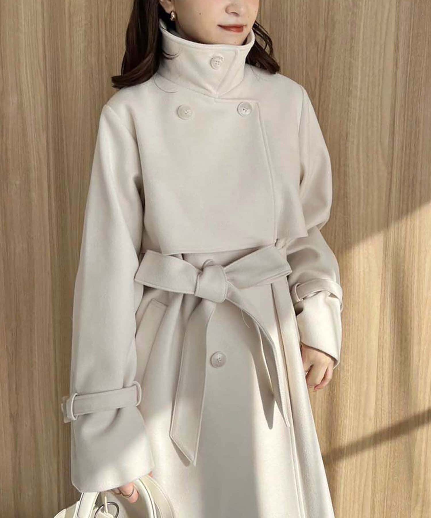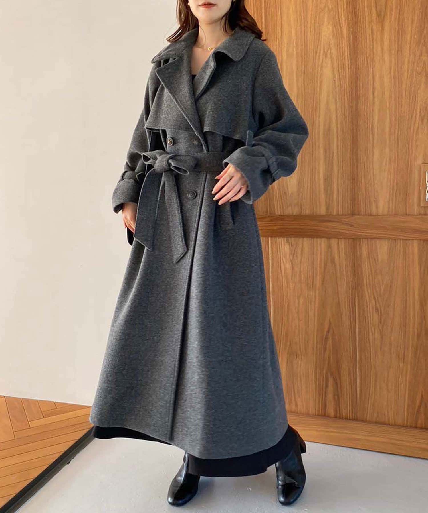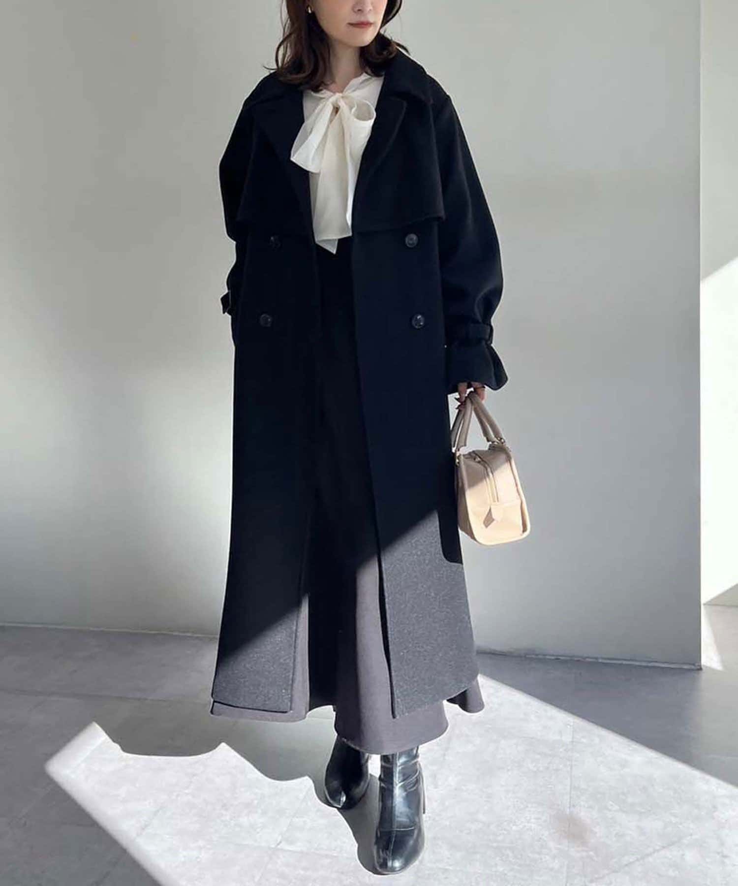 上品な印象になるステンカラーコートは、フレアスカートやワンピース合わせがオススメ。