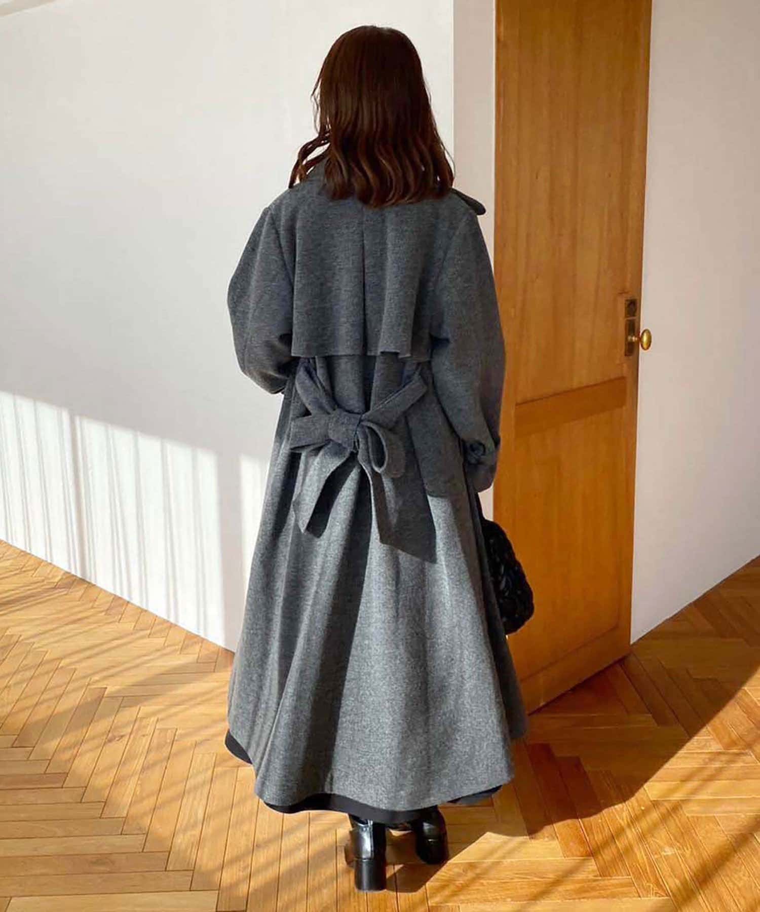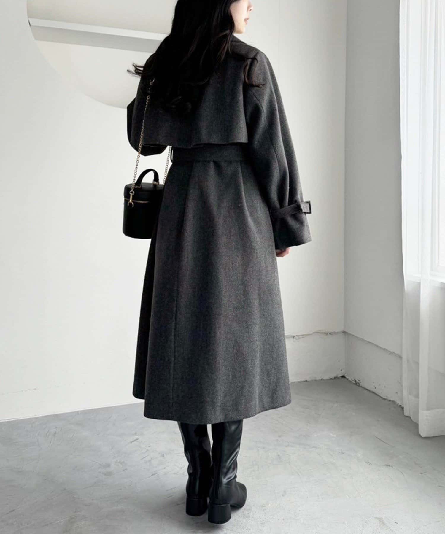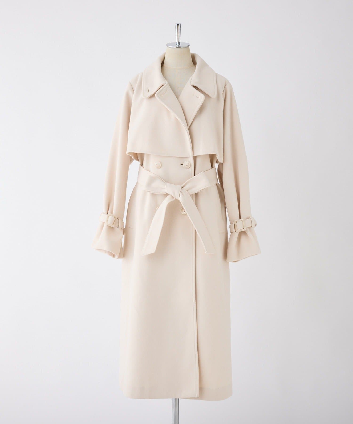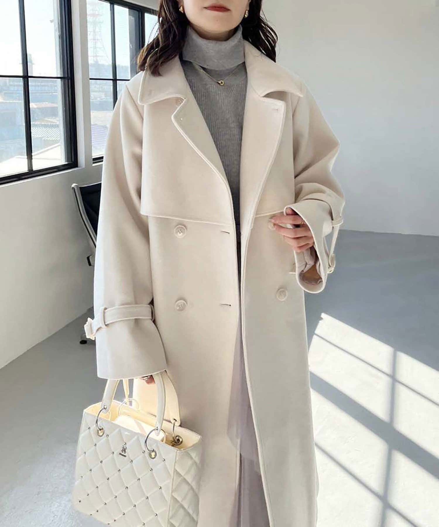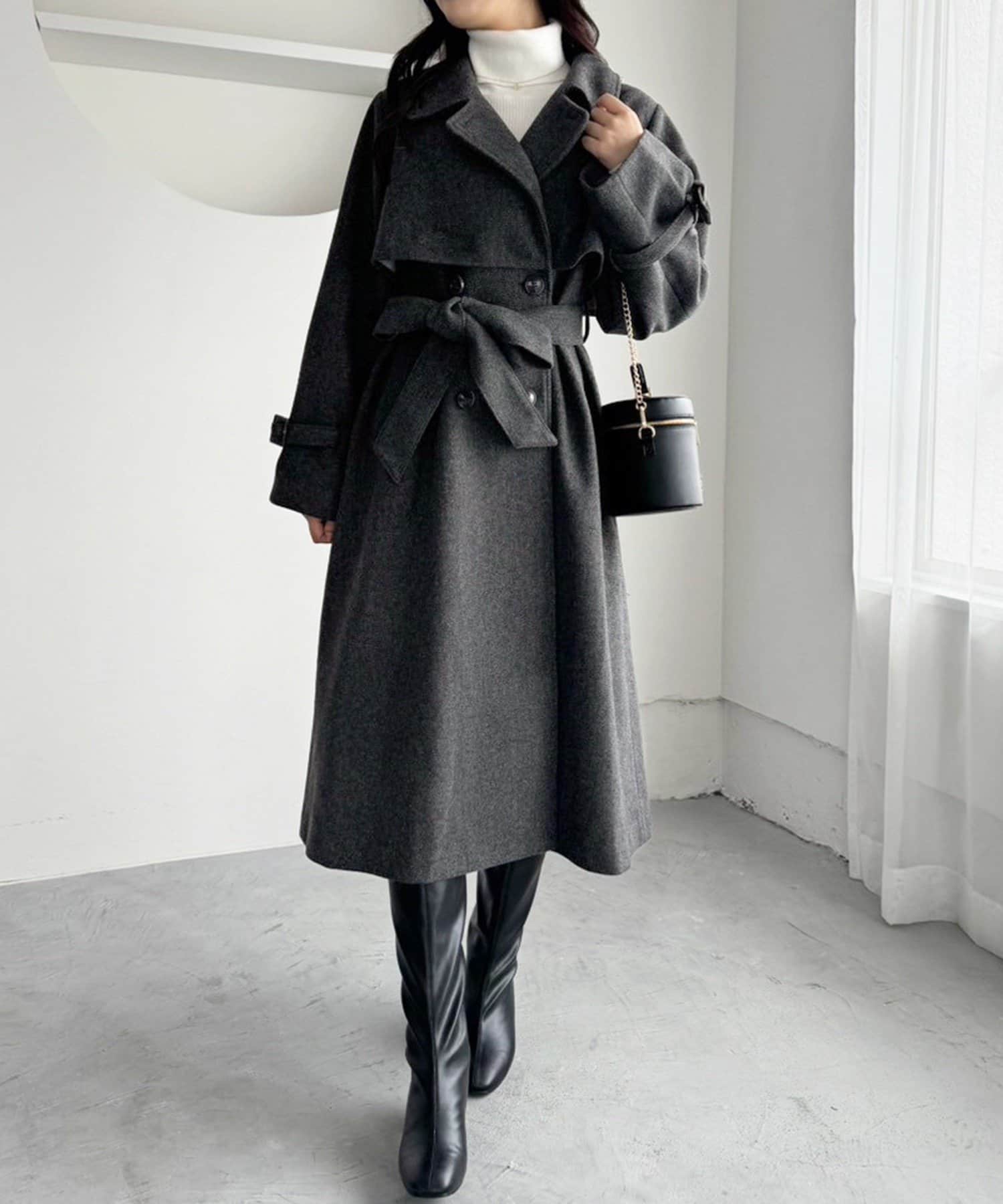 上品な印象になるステンカラーコートは、フレアスカートやワンピース合わせがオススメ。
