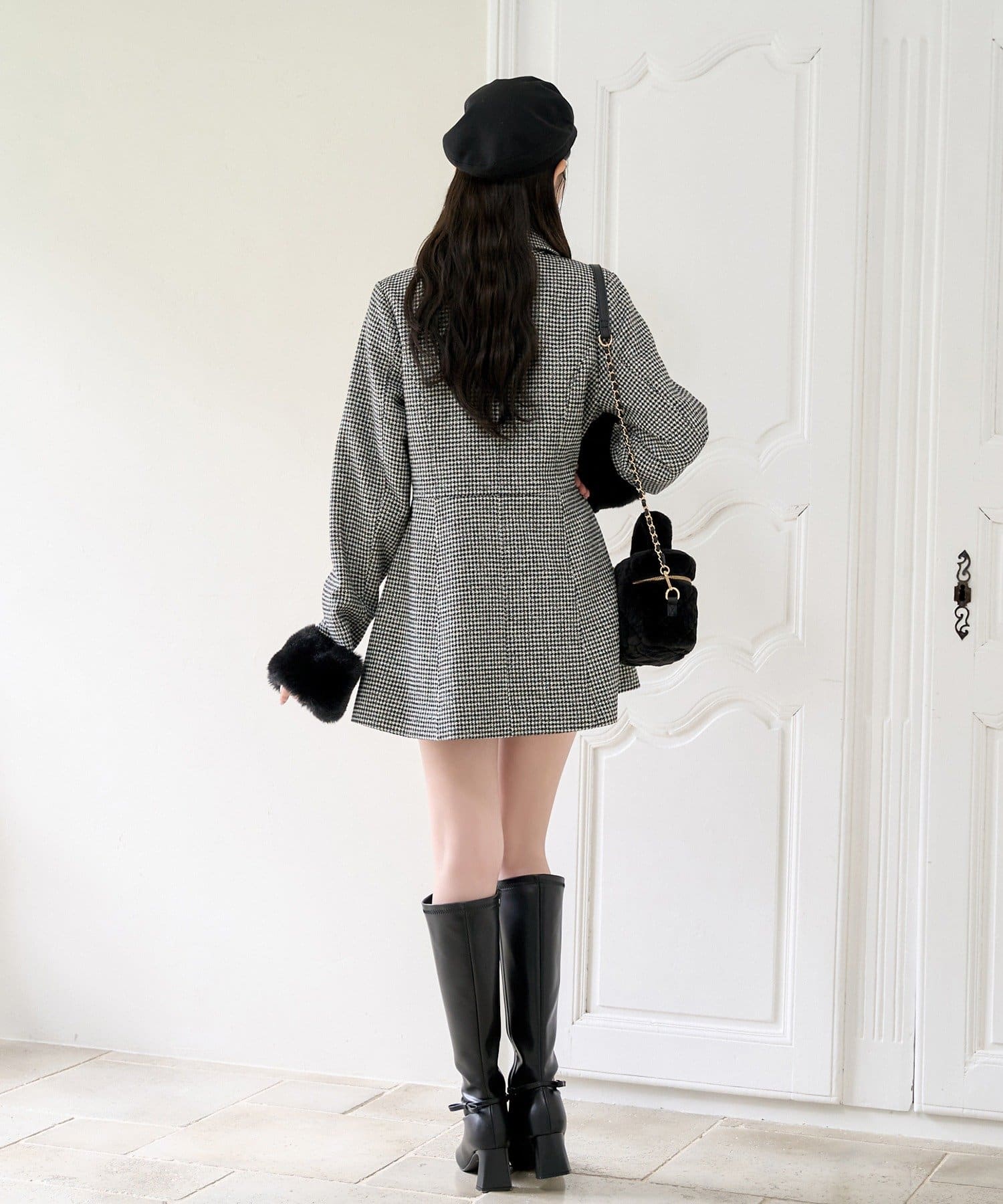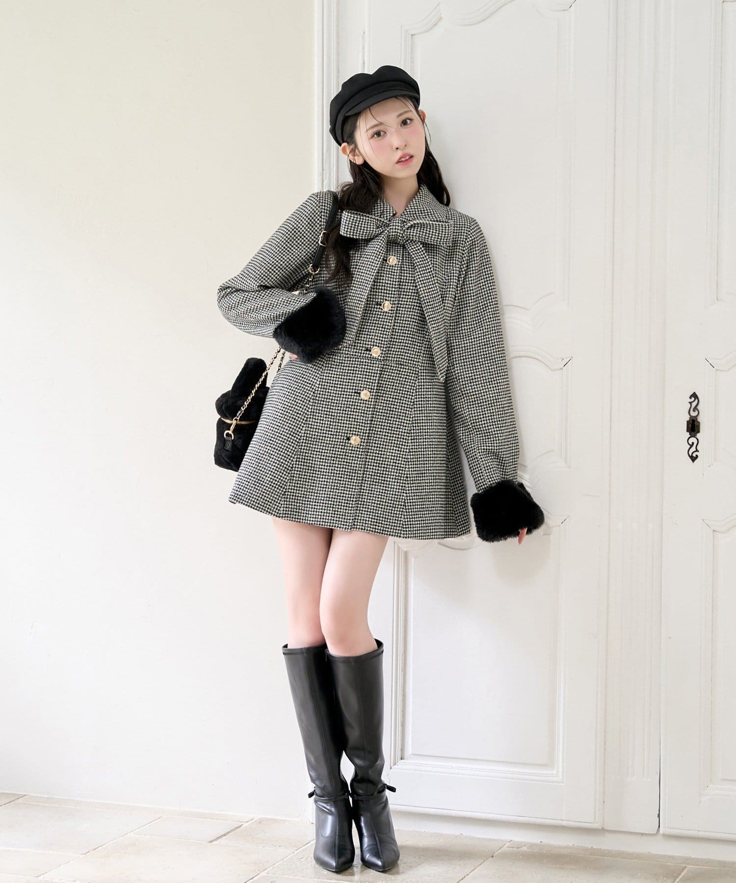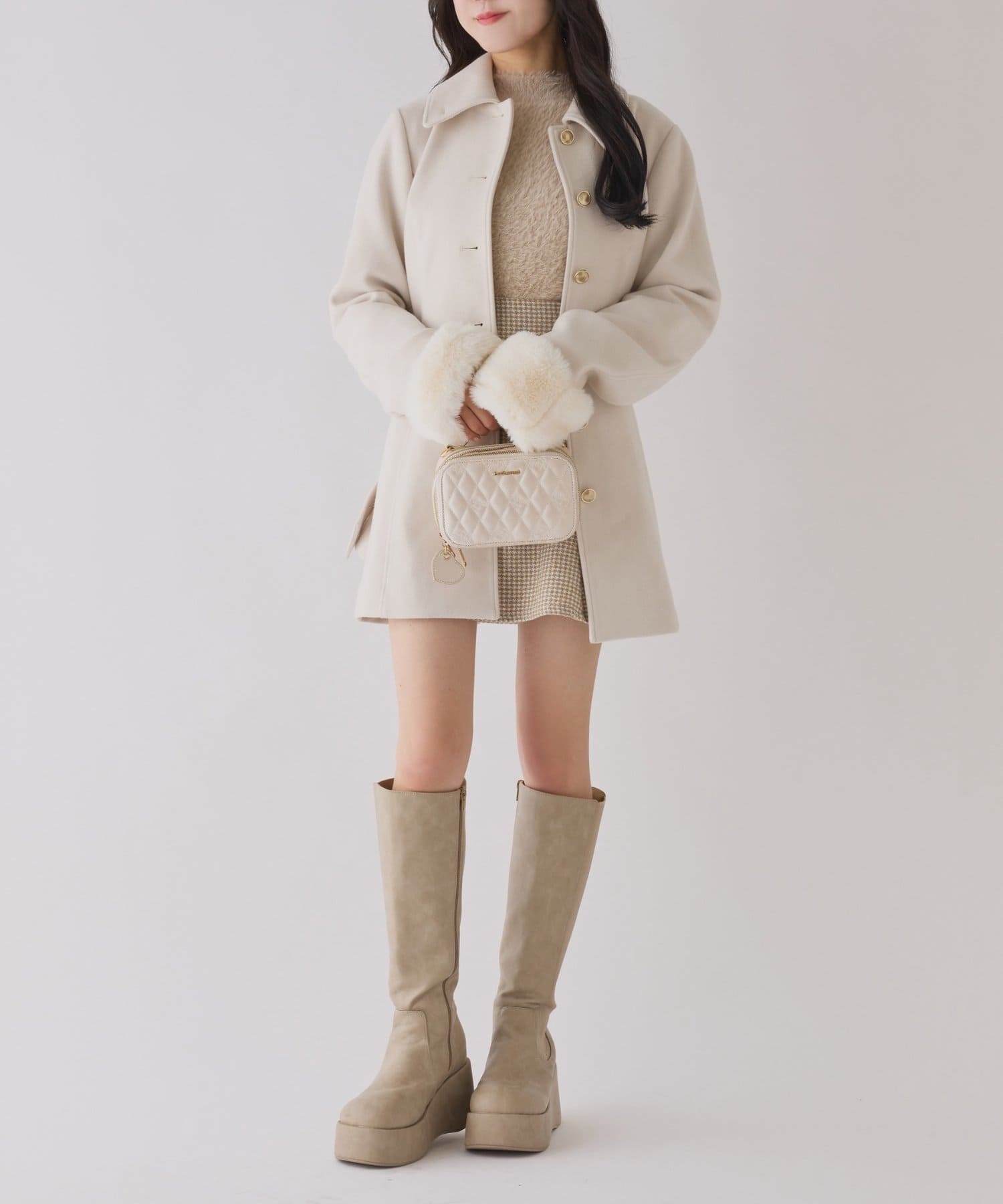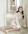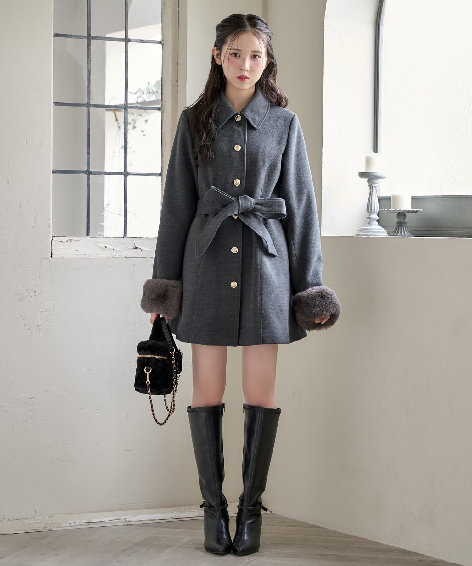 ミニボトム×ロングブーツでコートを閉じてワンピースっぽく着こなすのがオススメ!