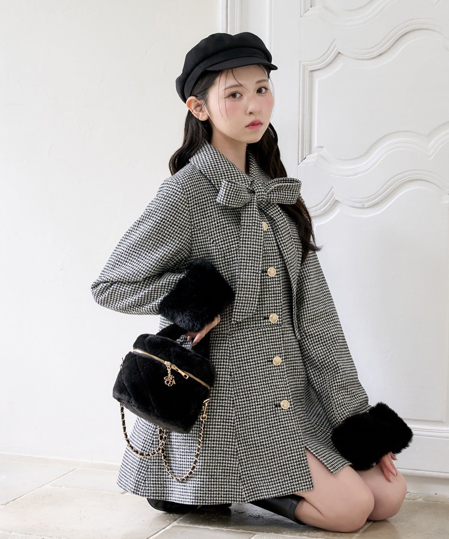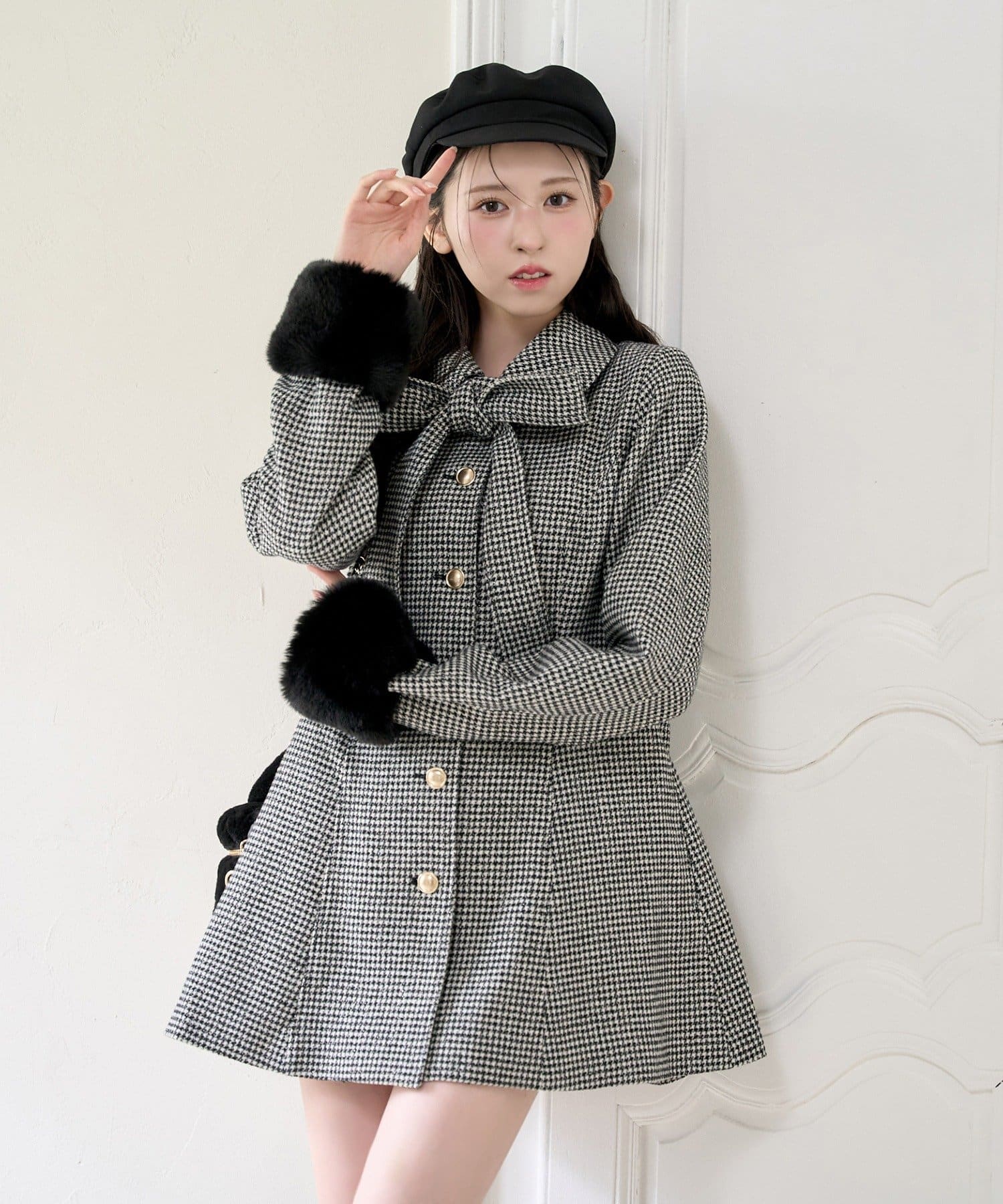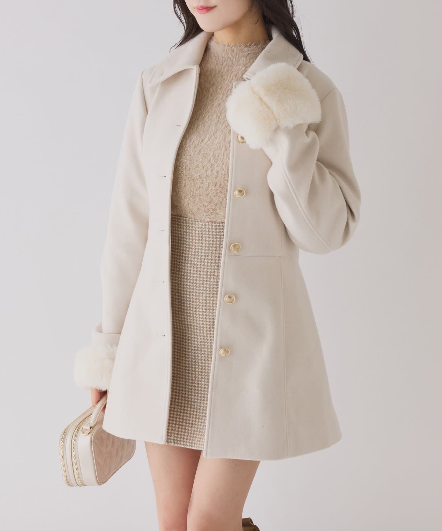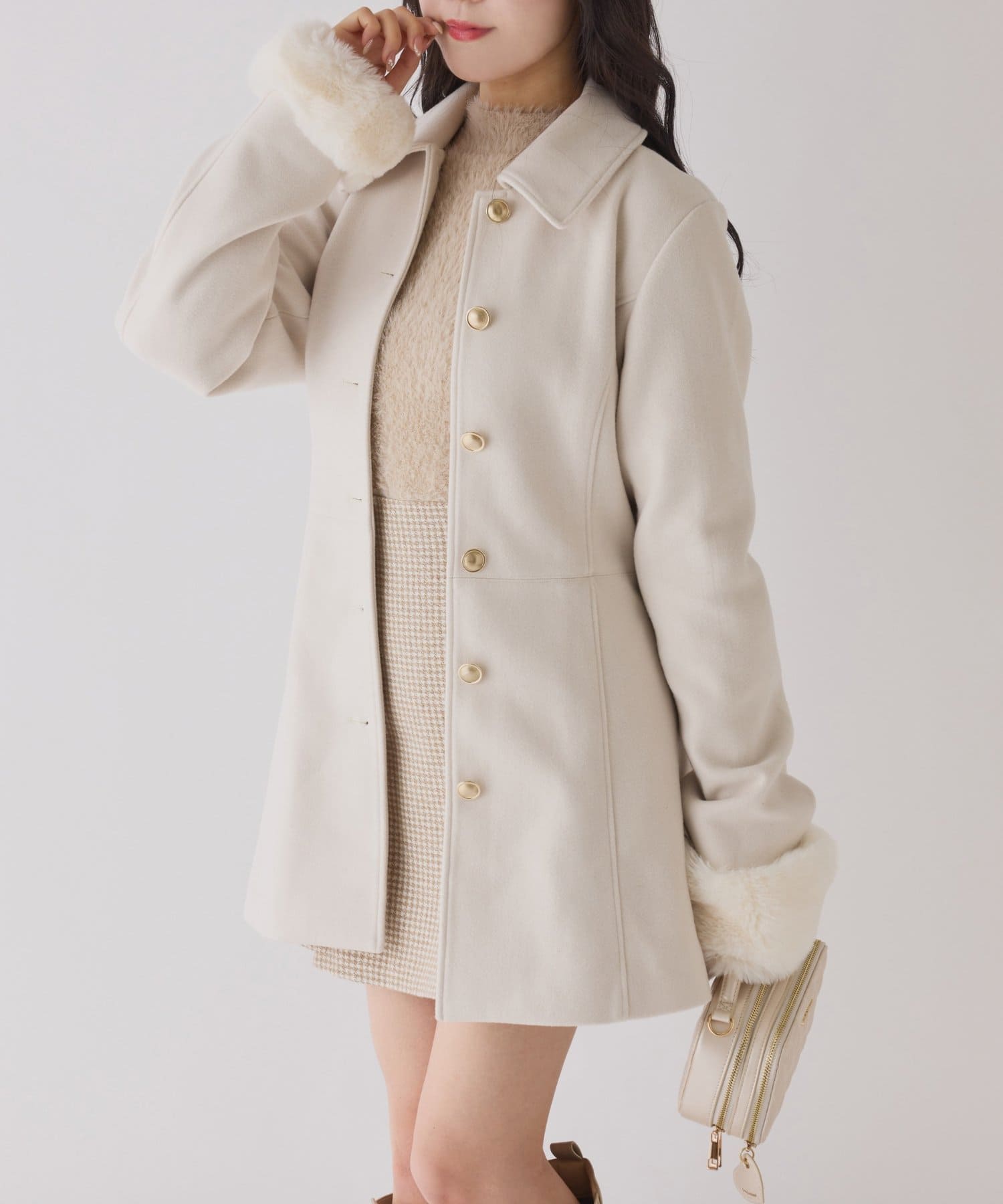 ミニボトム×ロングブーツでコートを閉じてワンピースっぽく着こなすのがオススメ!