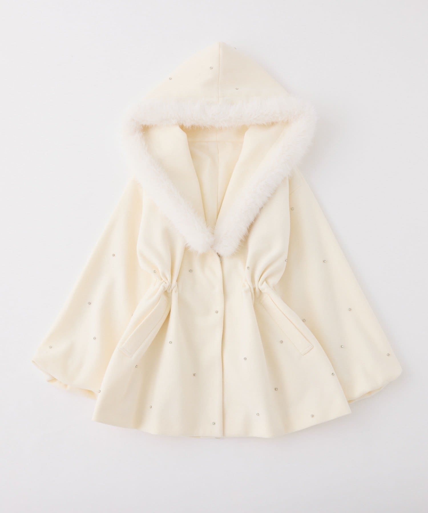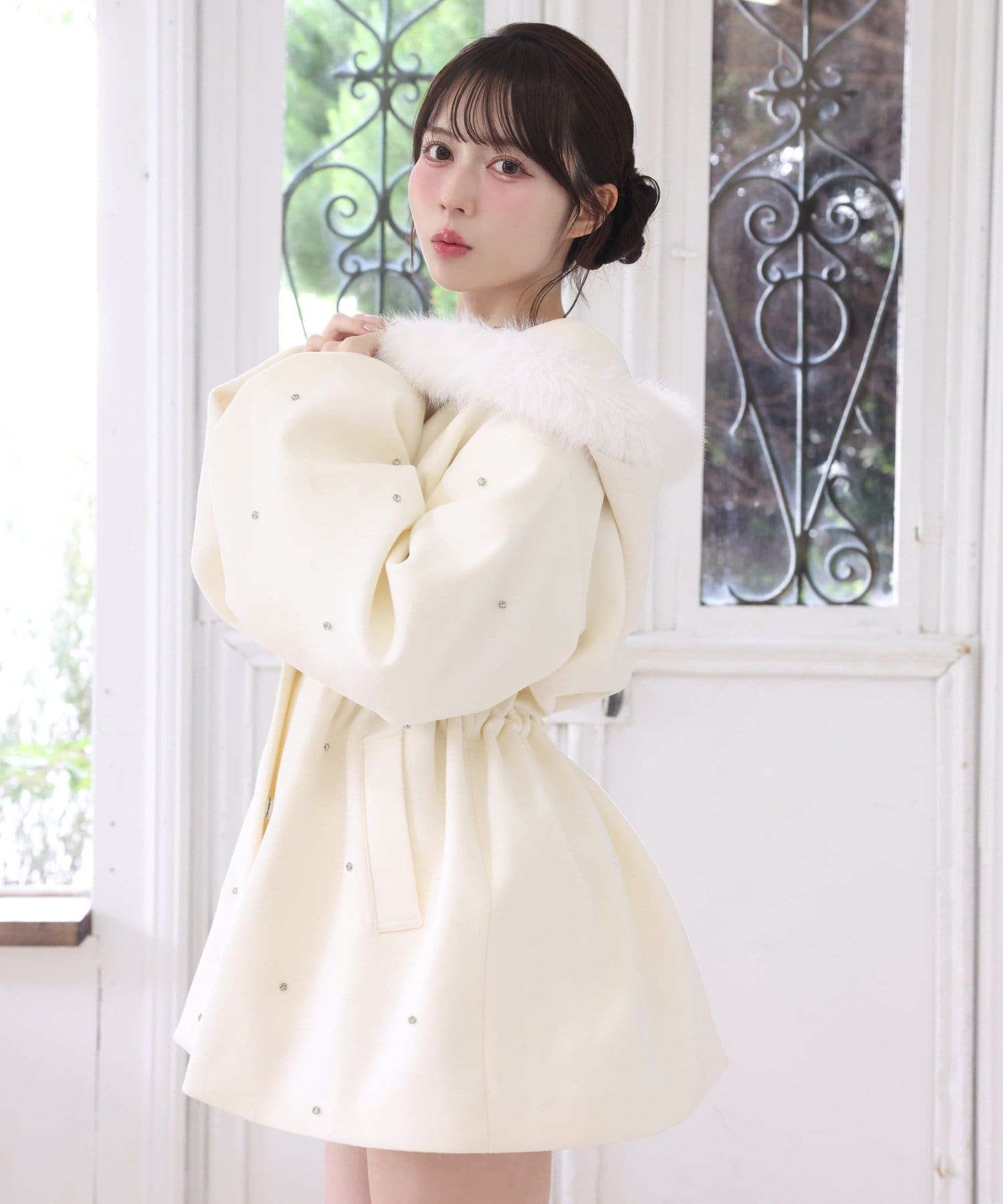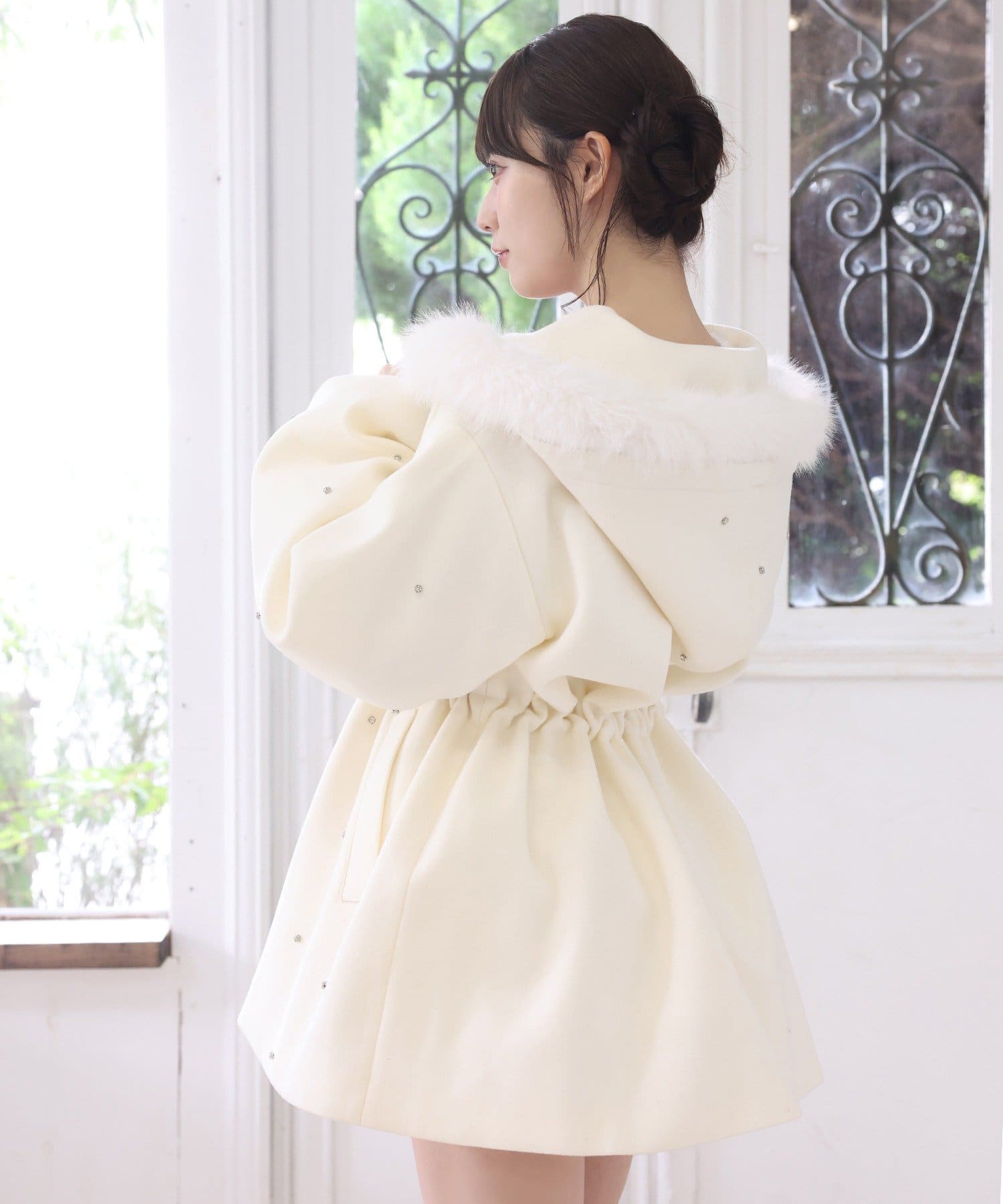 フードにはふんわりファー付きで、顔まわりを華やかに演出。