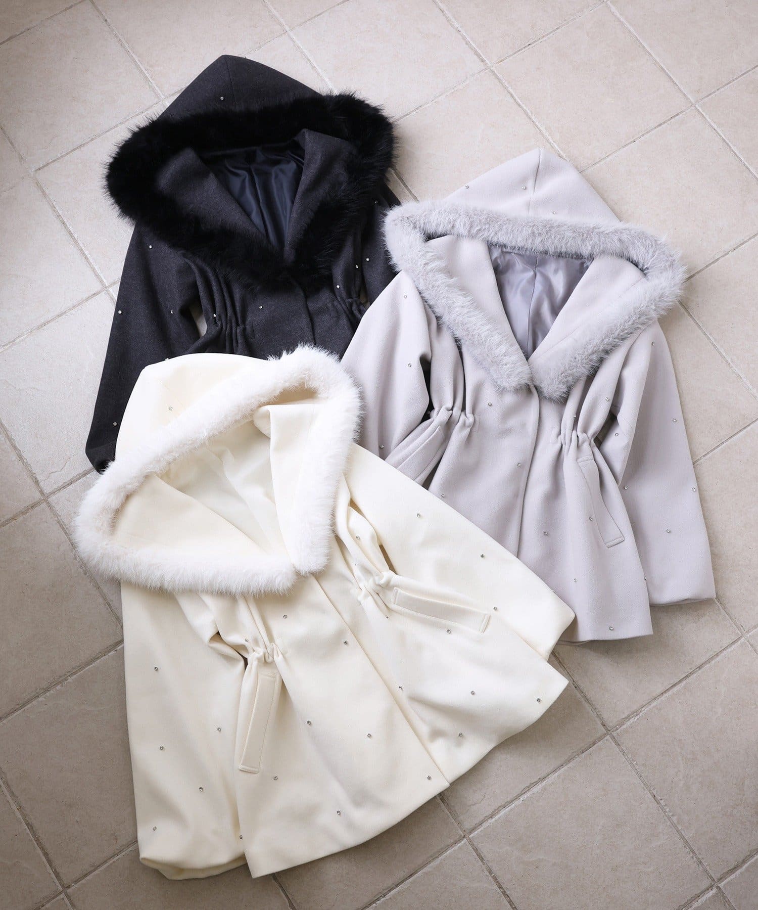 【人気カラー再予約】フードフェイクファービジューミドルコート