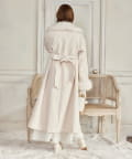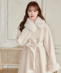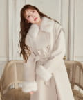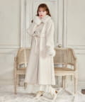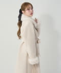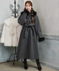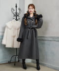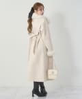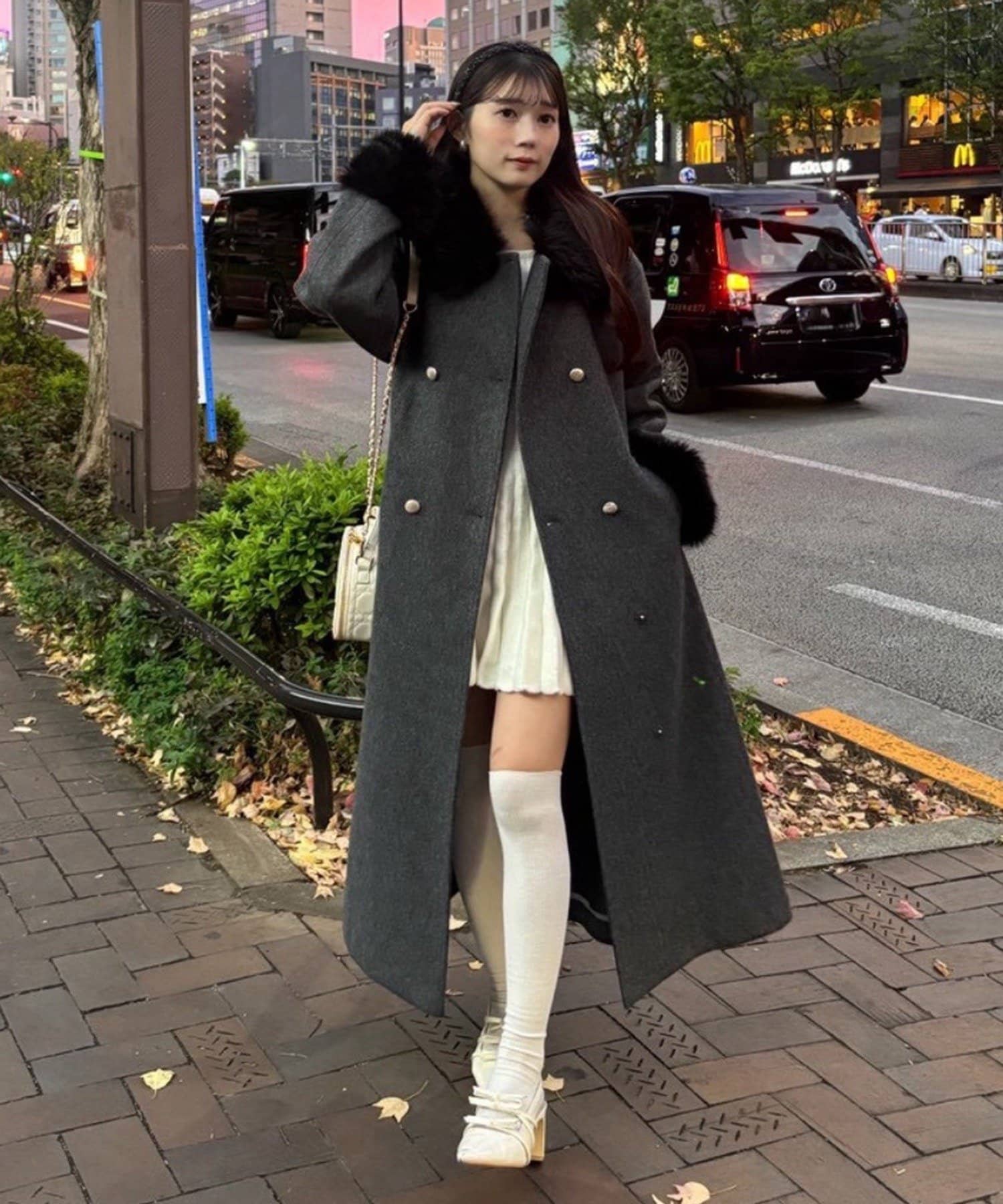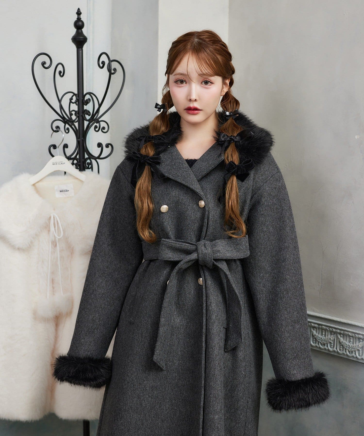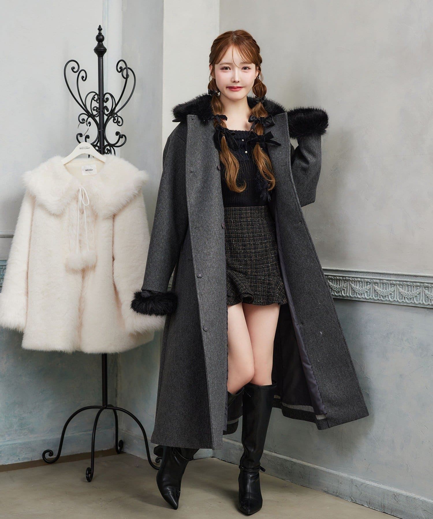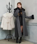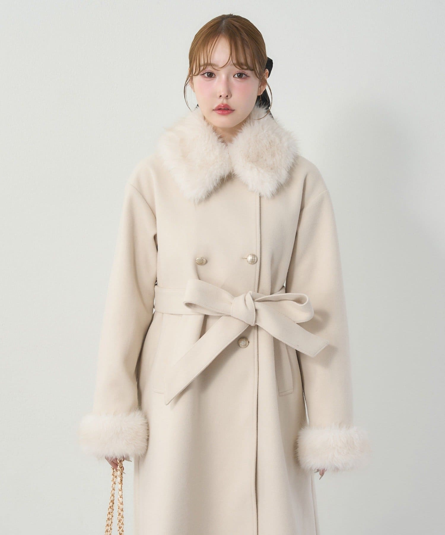 襟と袖口にふわふわのファーをあしらった、華やかで上品なロングコート。