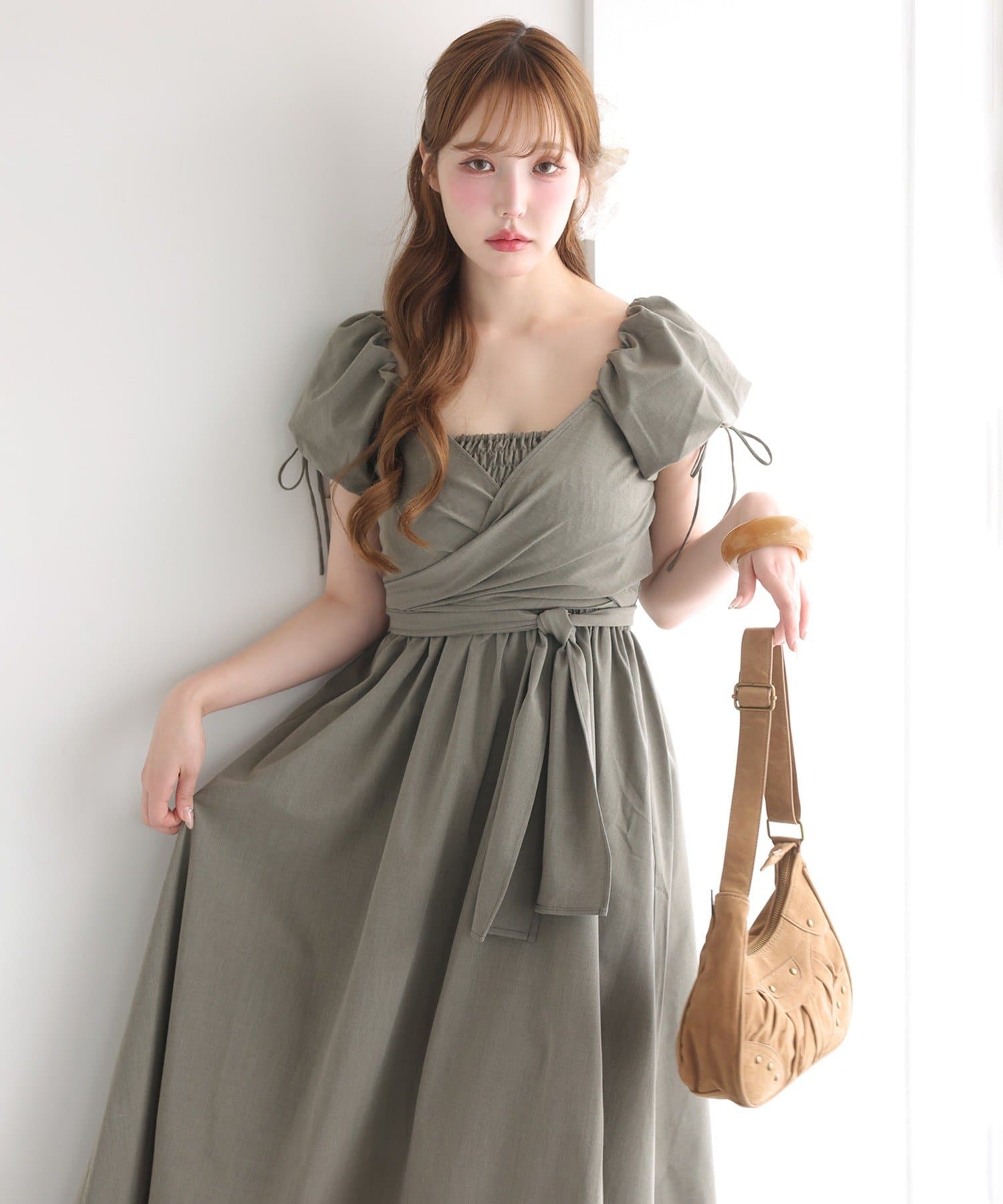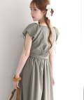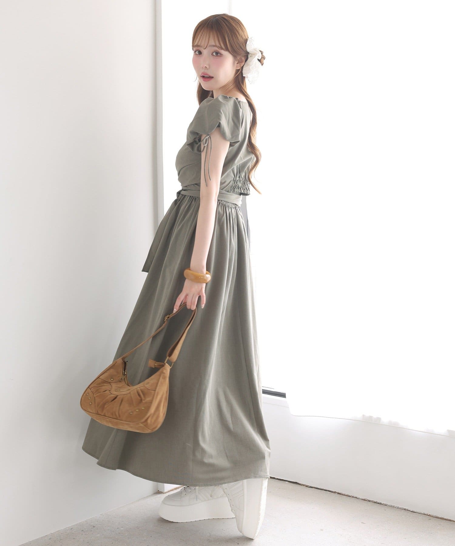 シャーリングデザインがウエストラインもキレイに見せてくれるロングワンピースとブラウスのセットアイテム