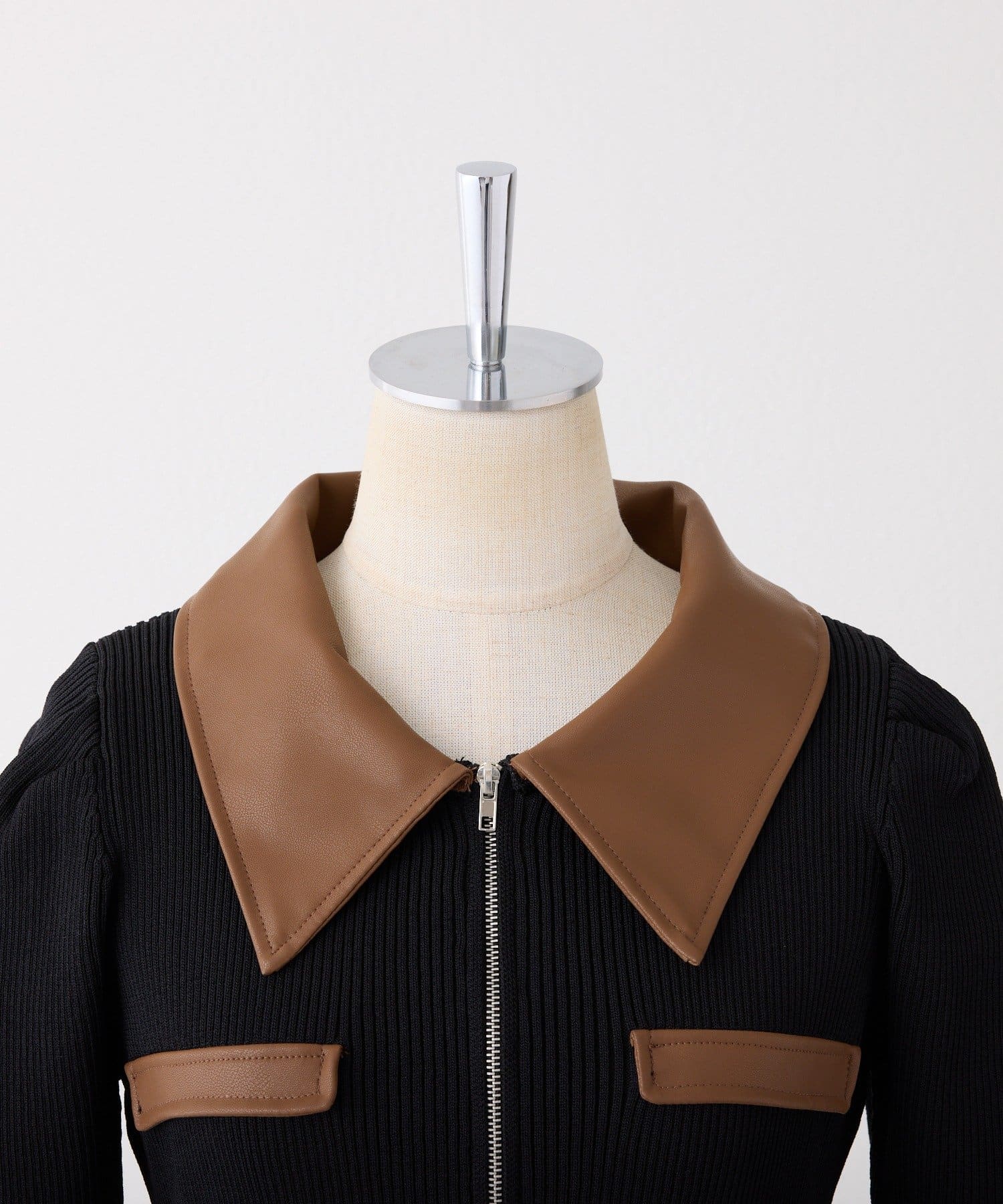 襟部分は合皮素材を使用し、クラシカルでちょっぴりモードな印象に仕上げました。