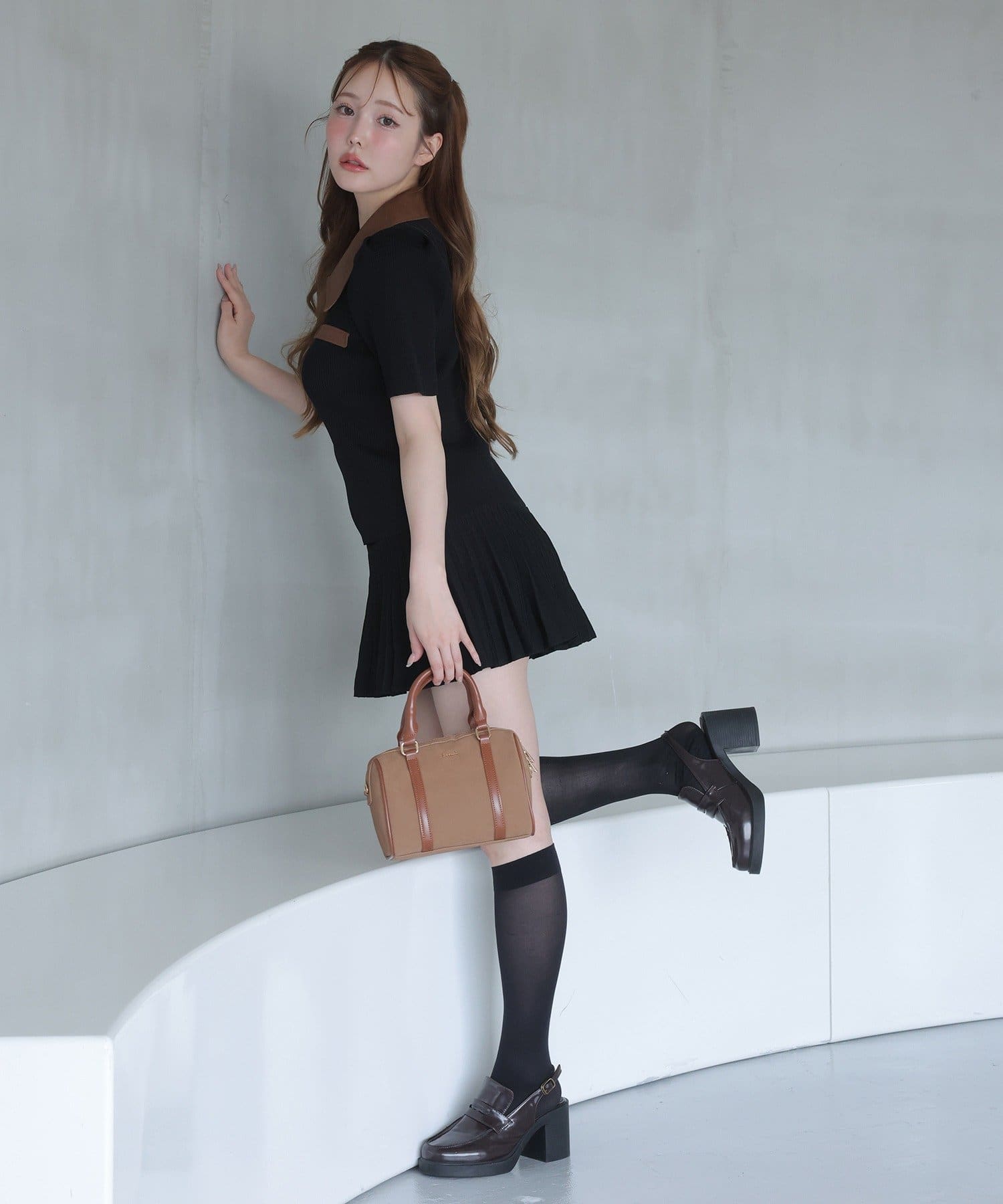 厚底ローファー+ハイソックスを合わせてスクールガール風に。