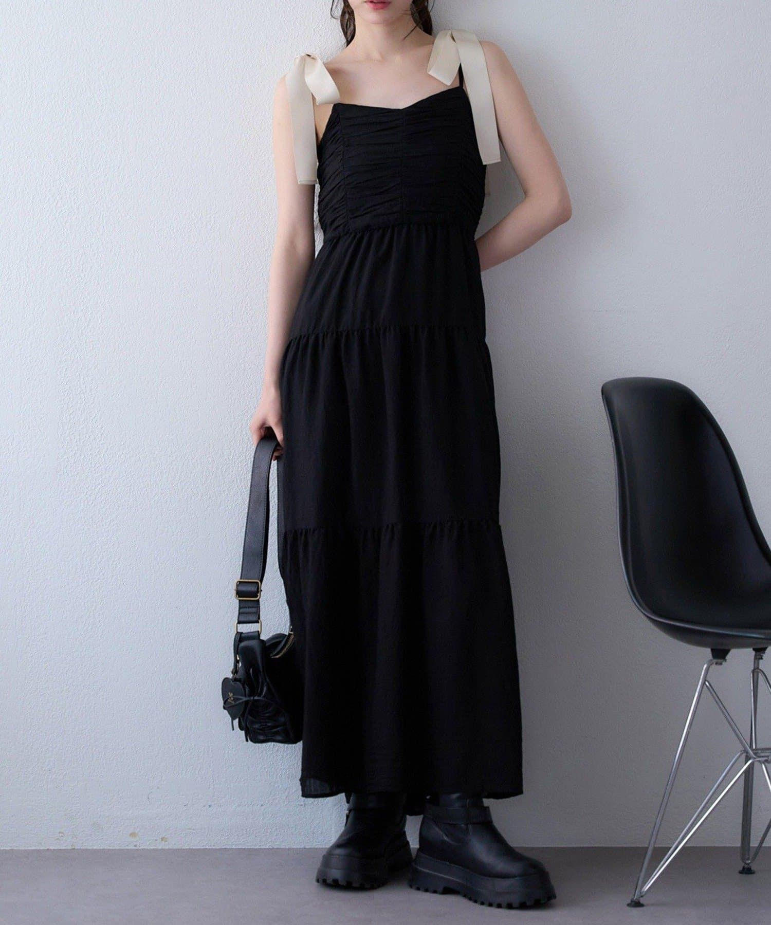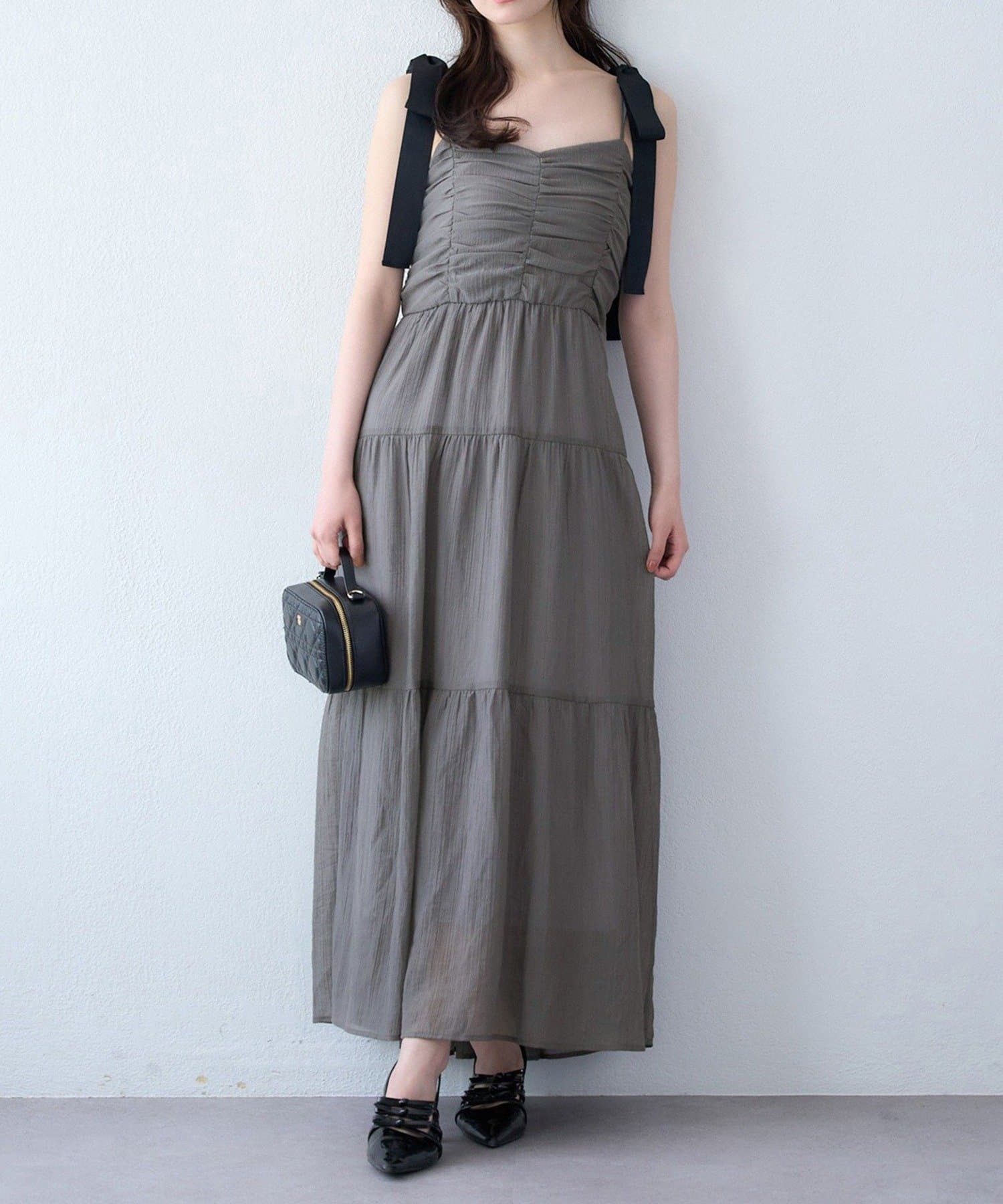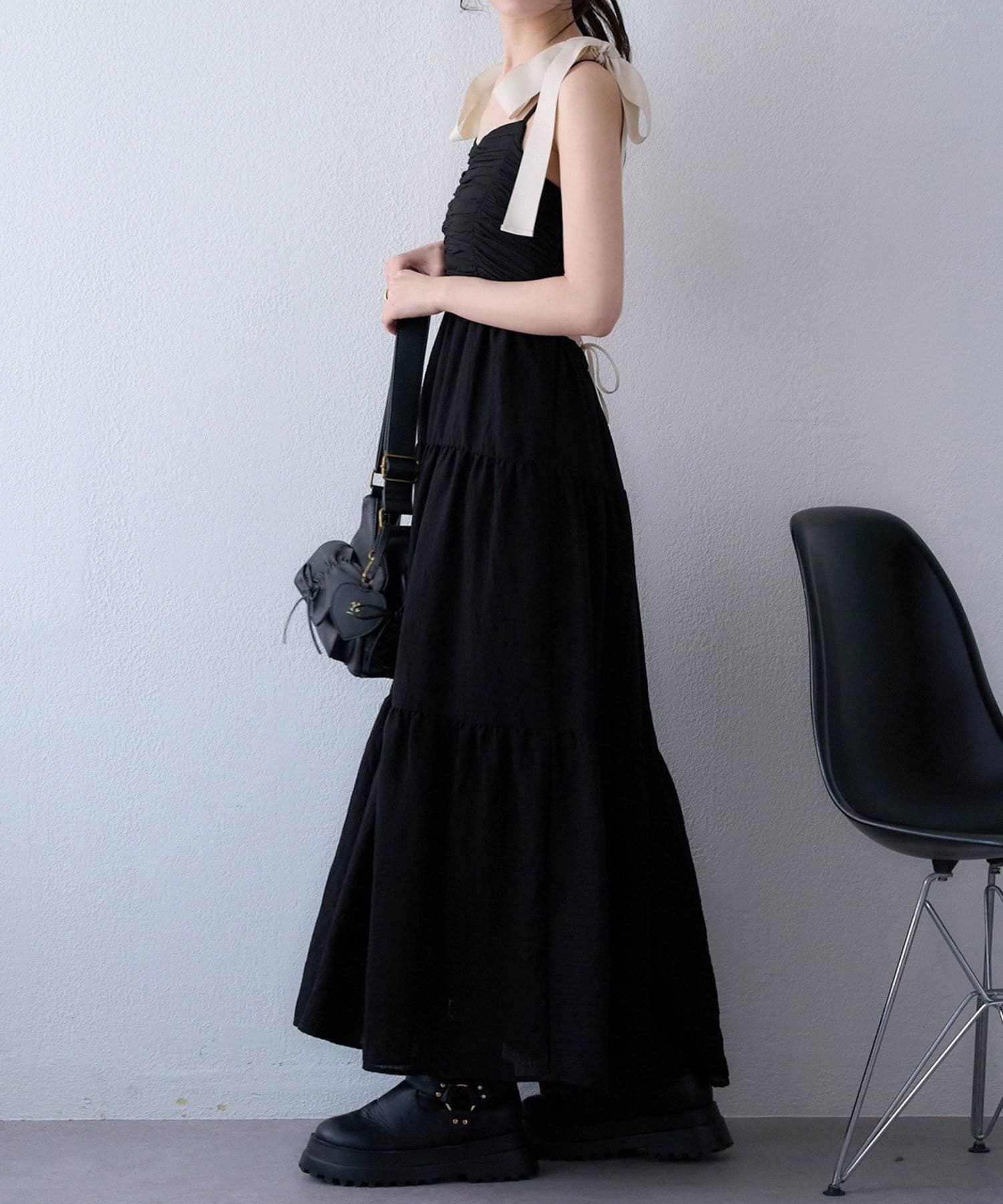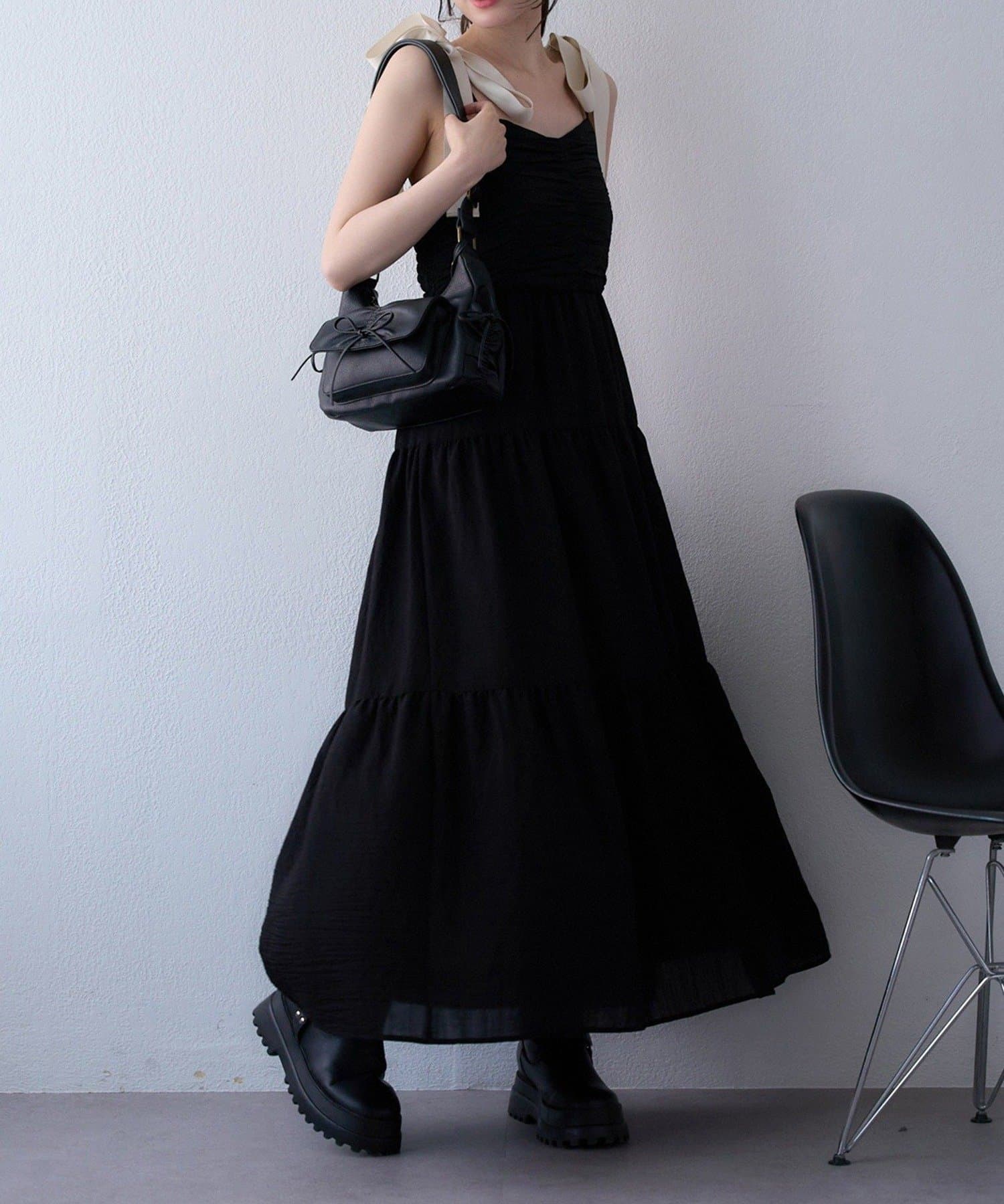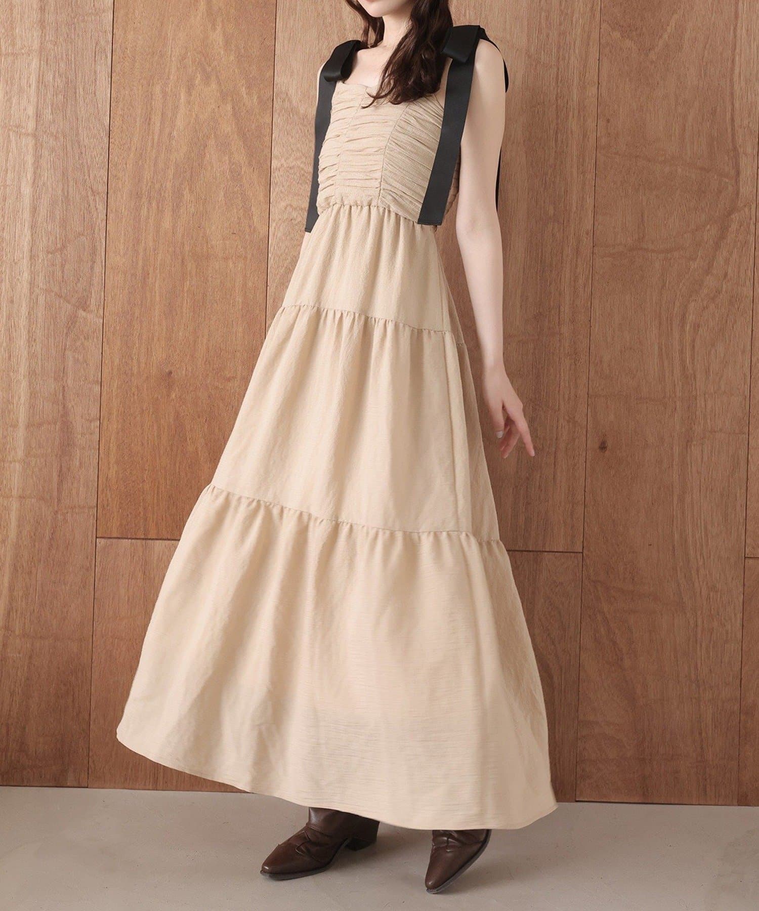 肩のリボンデザインがポイントのティアードロングワンピース。