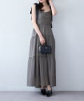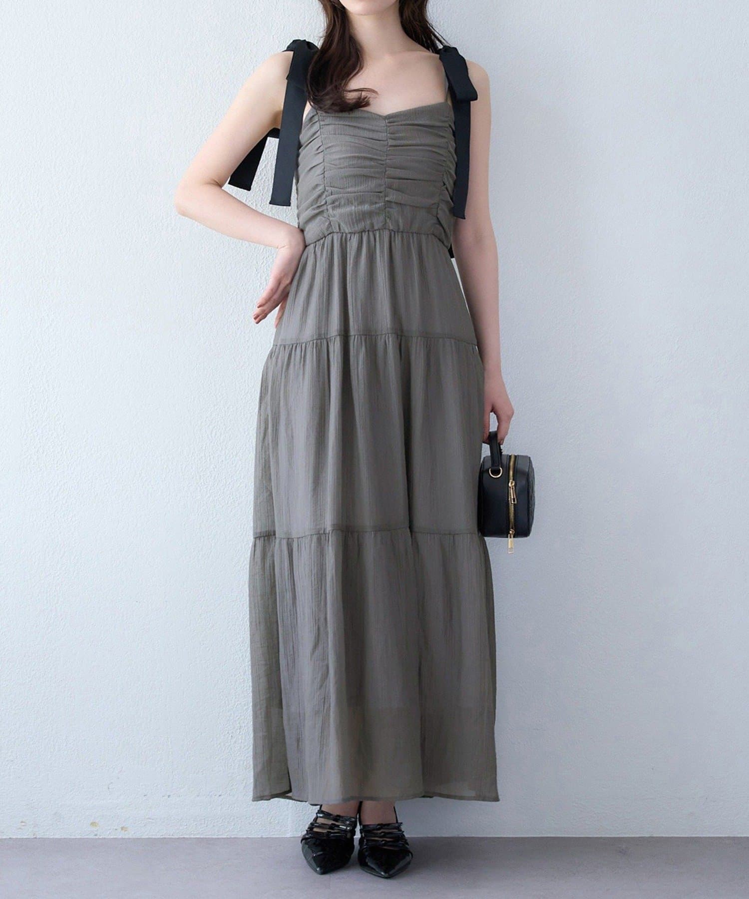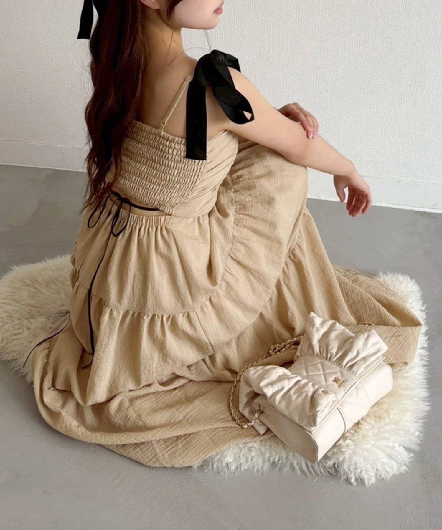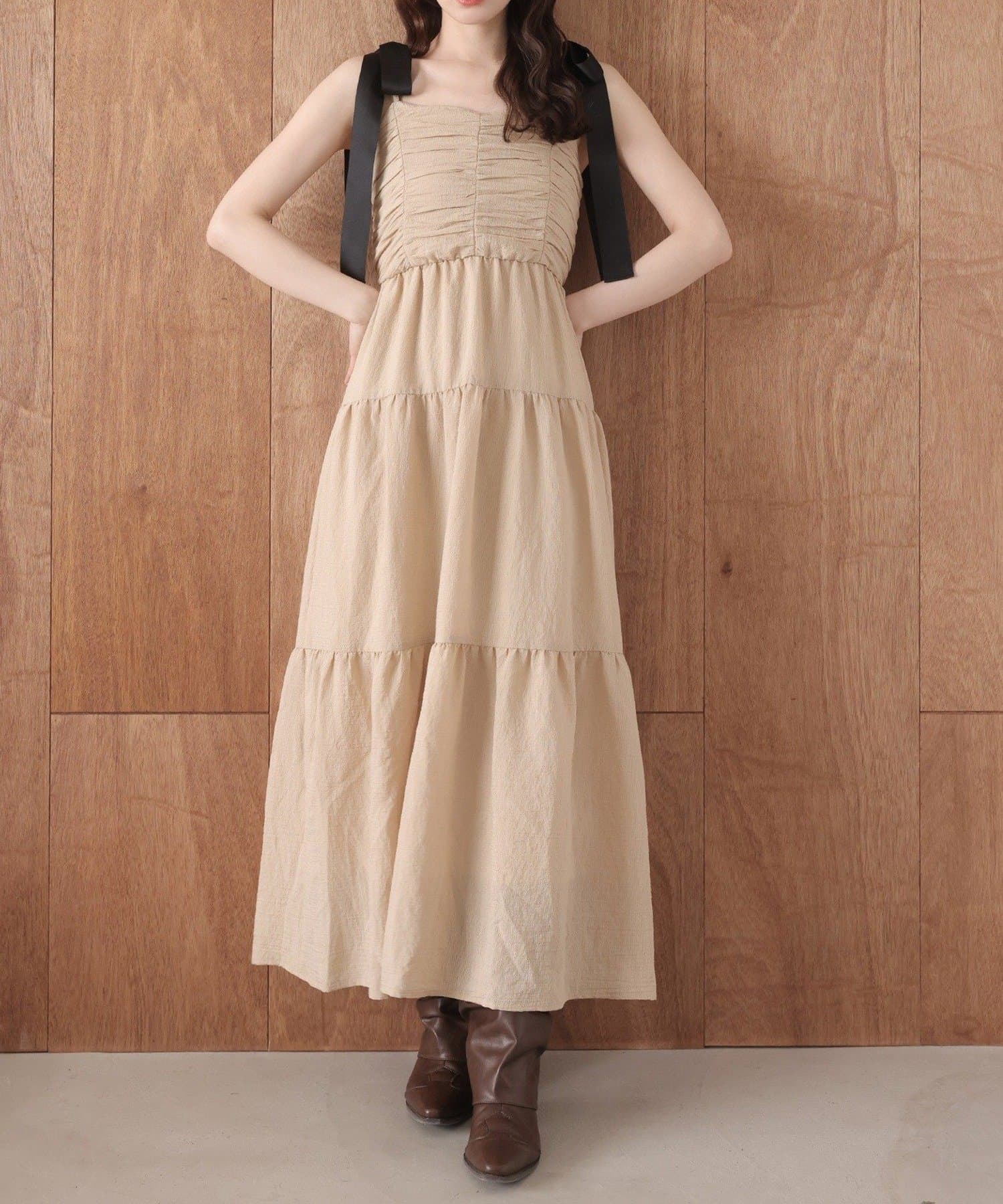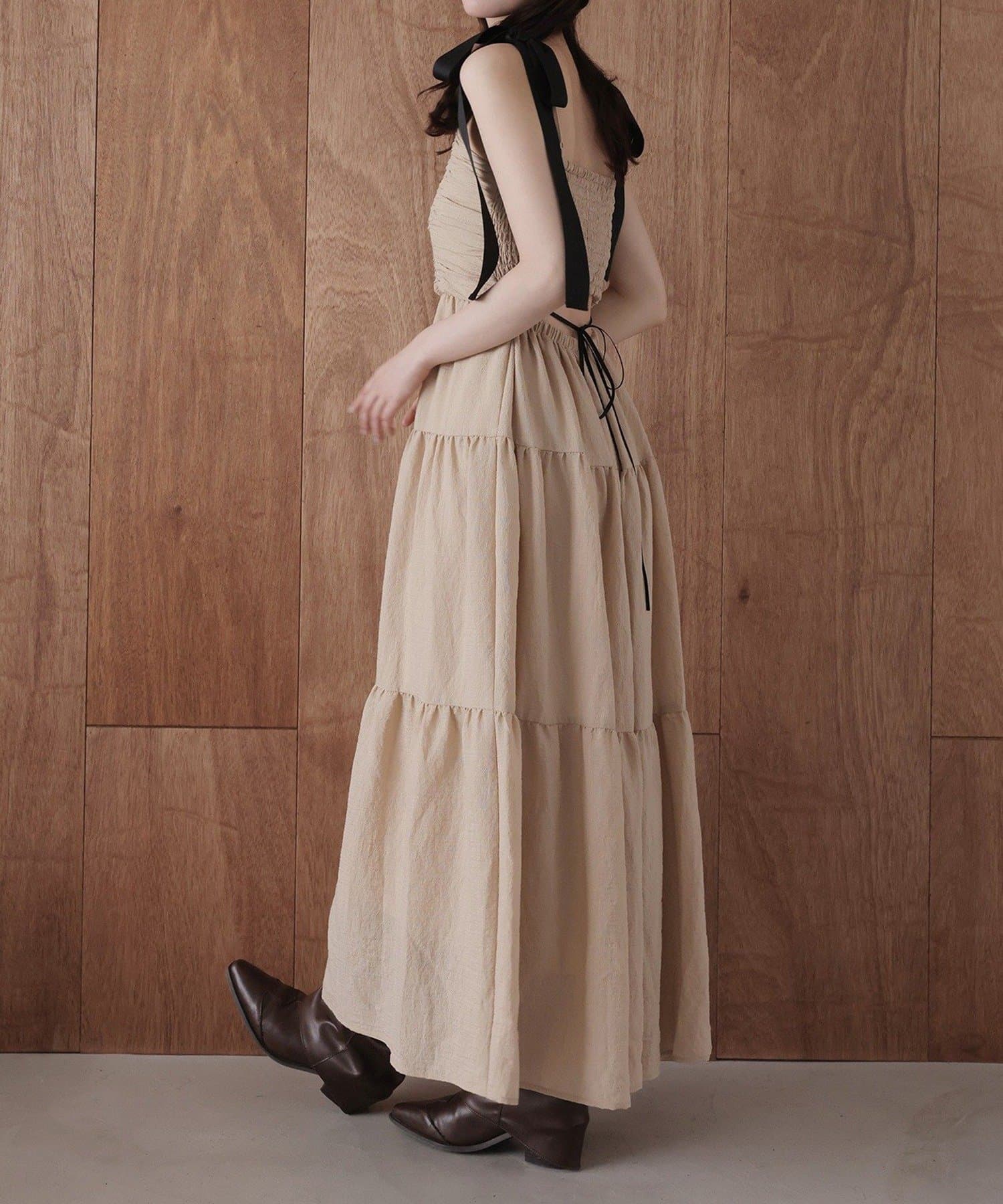 肩のリボンデザインがポイントのティアードロングワンピース。
