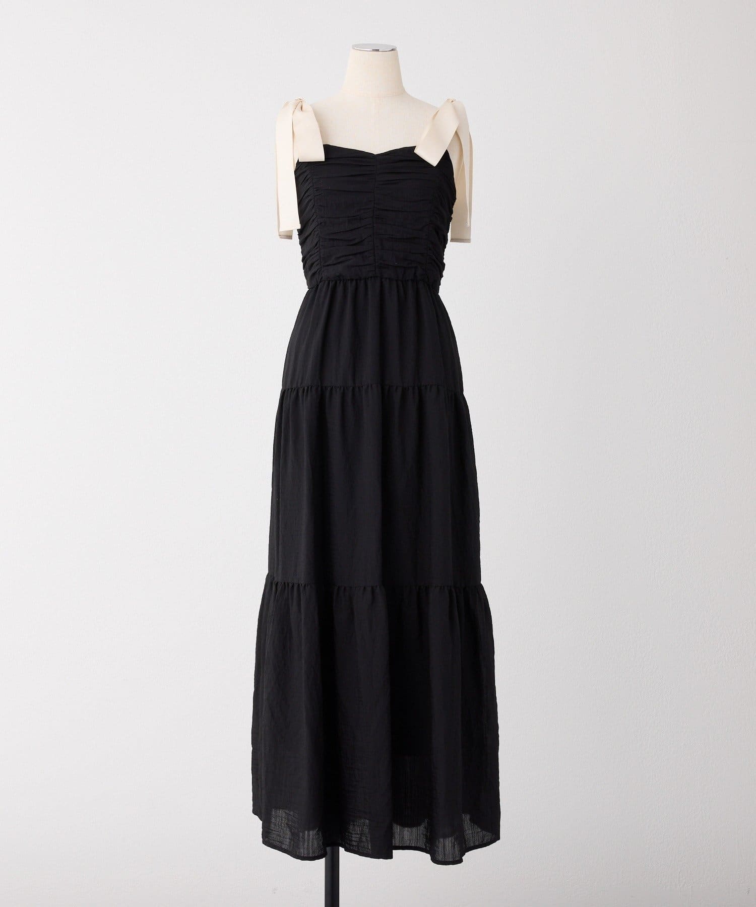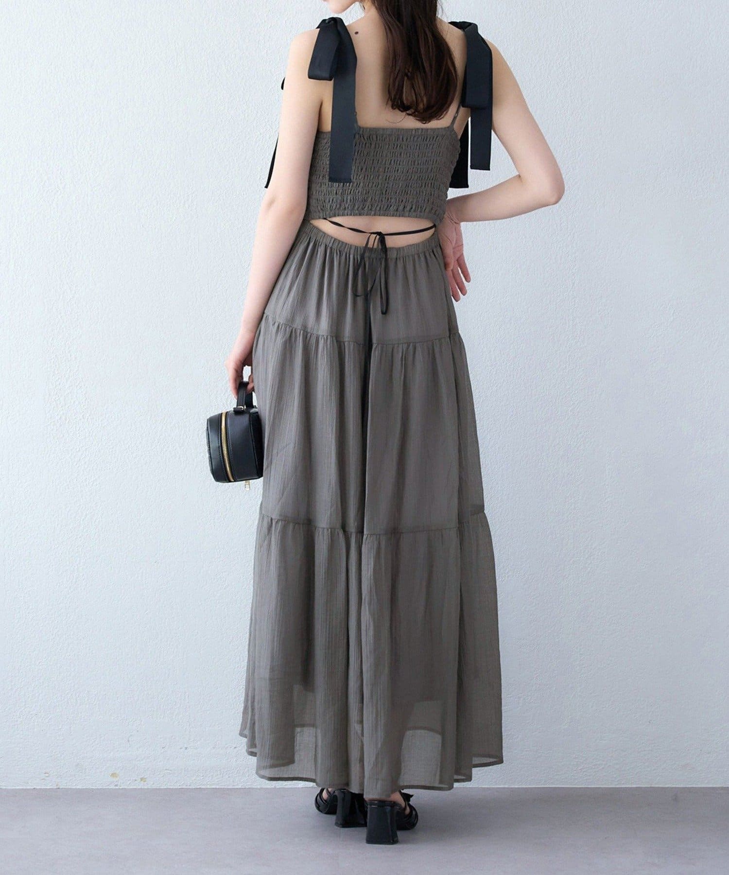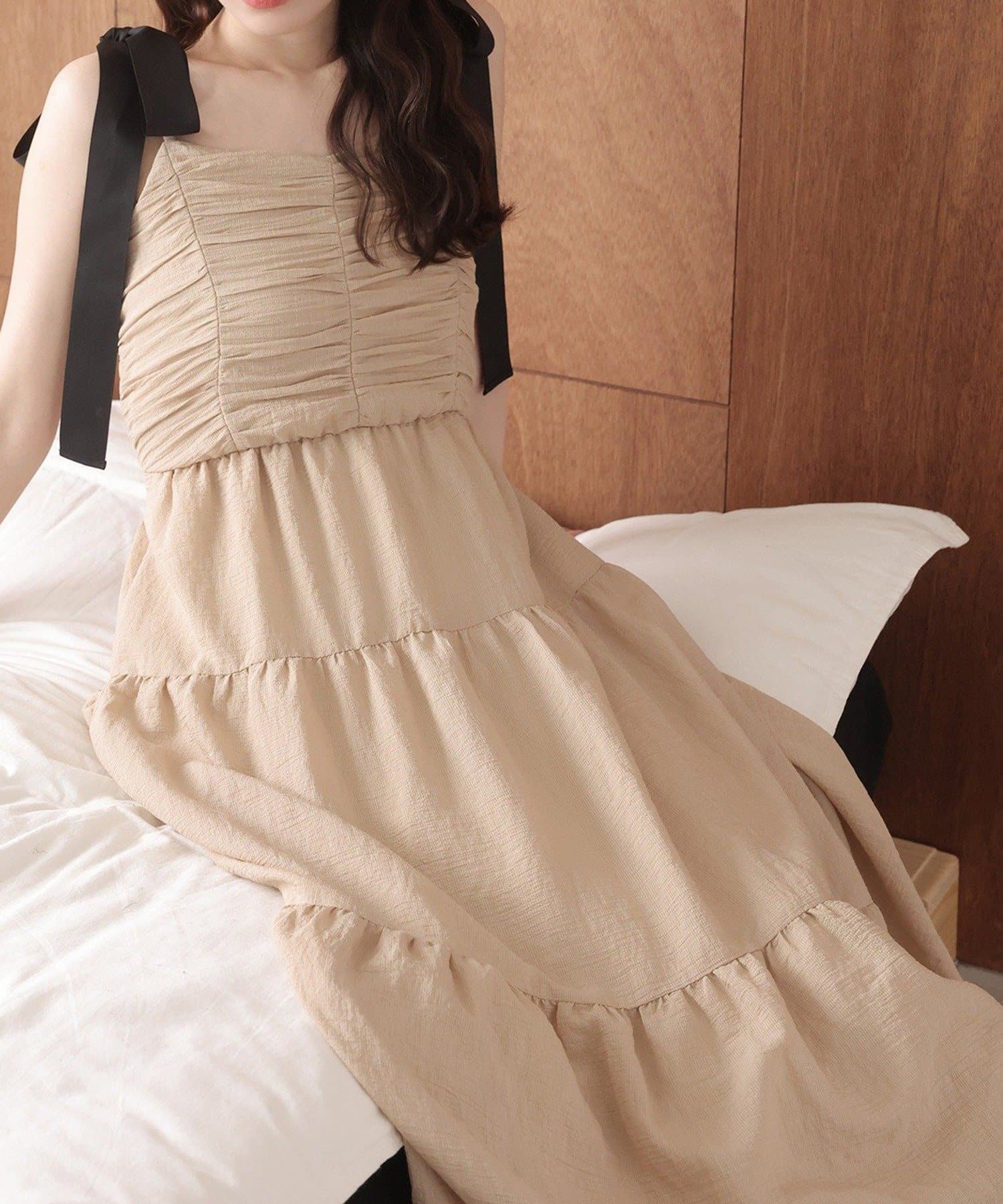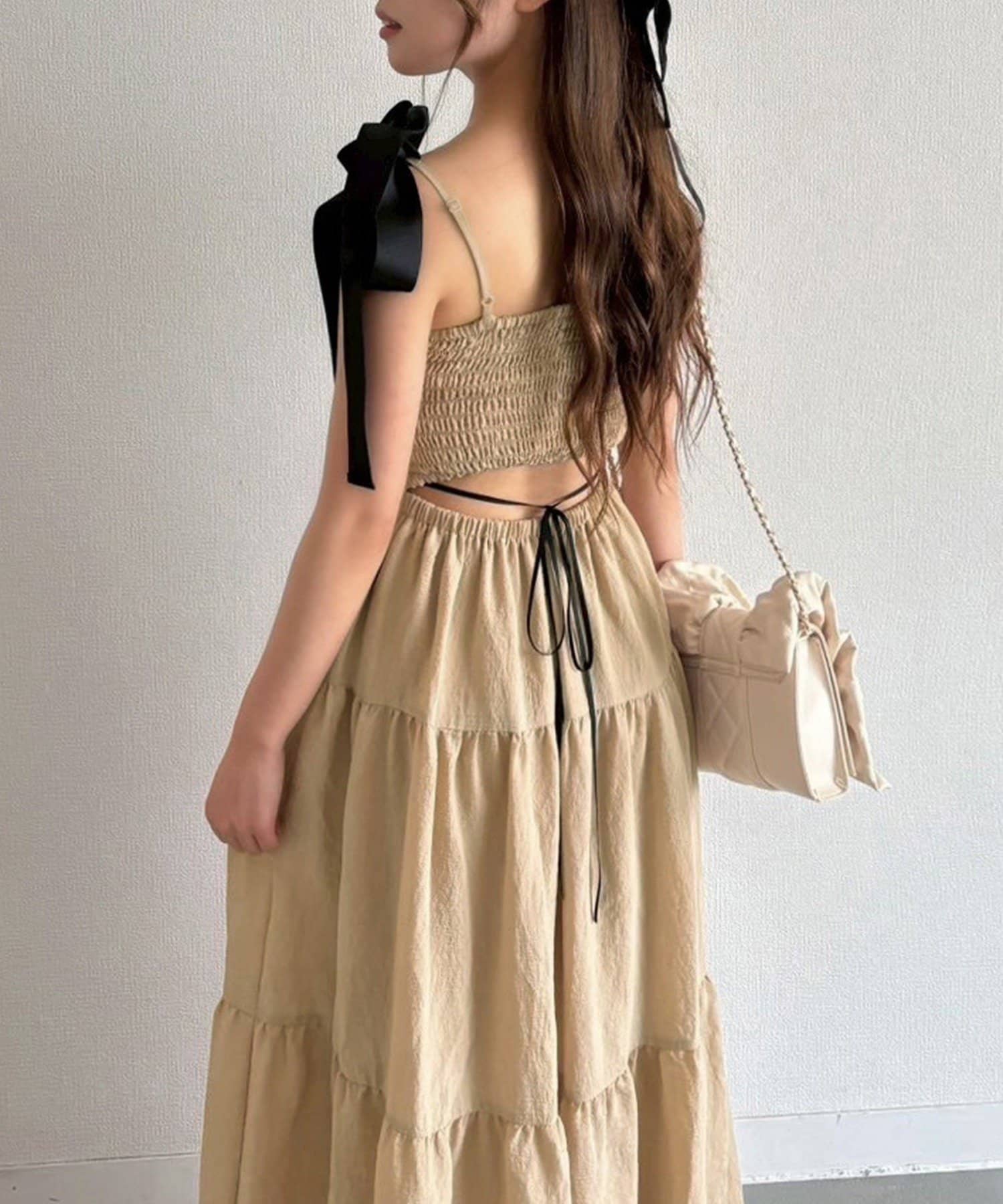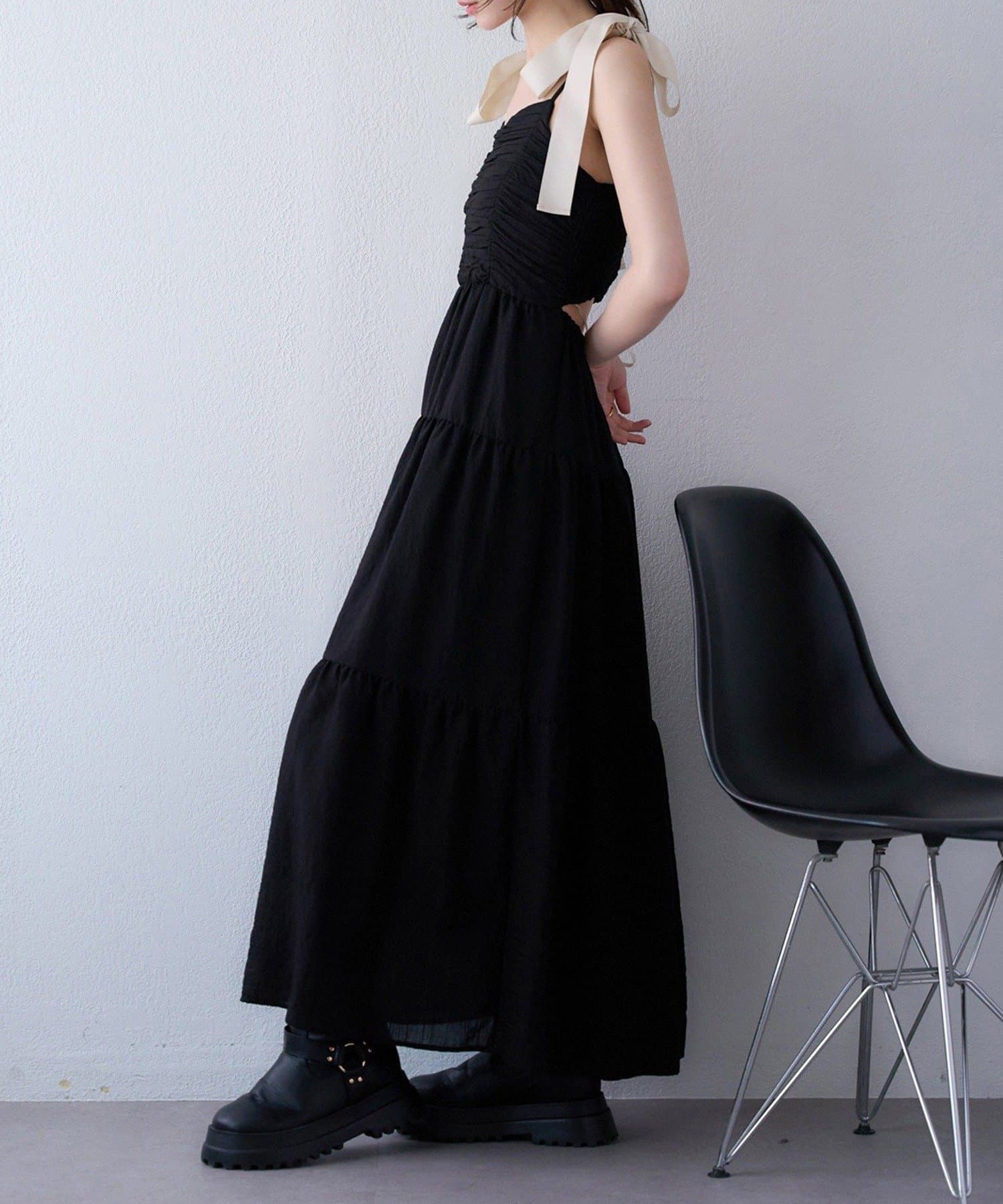 肩のリボンデザインがポイントのティアードロングワンピース。