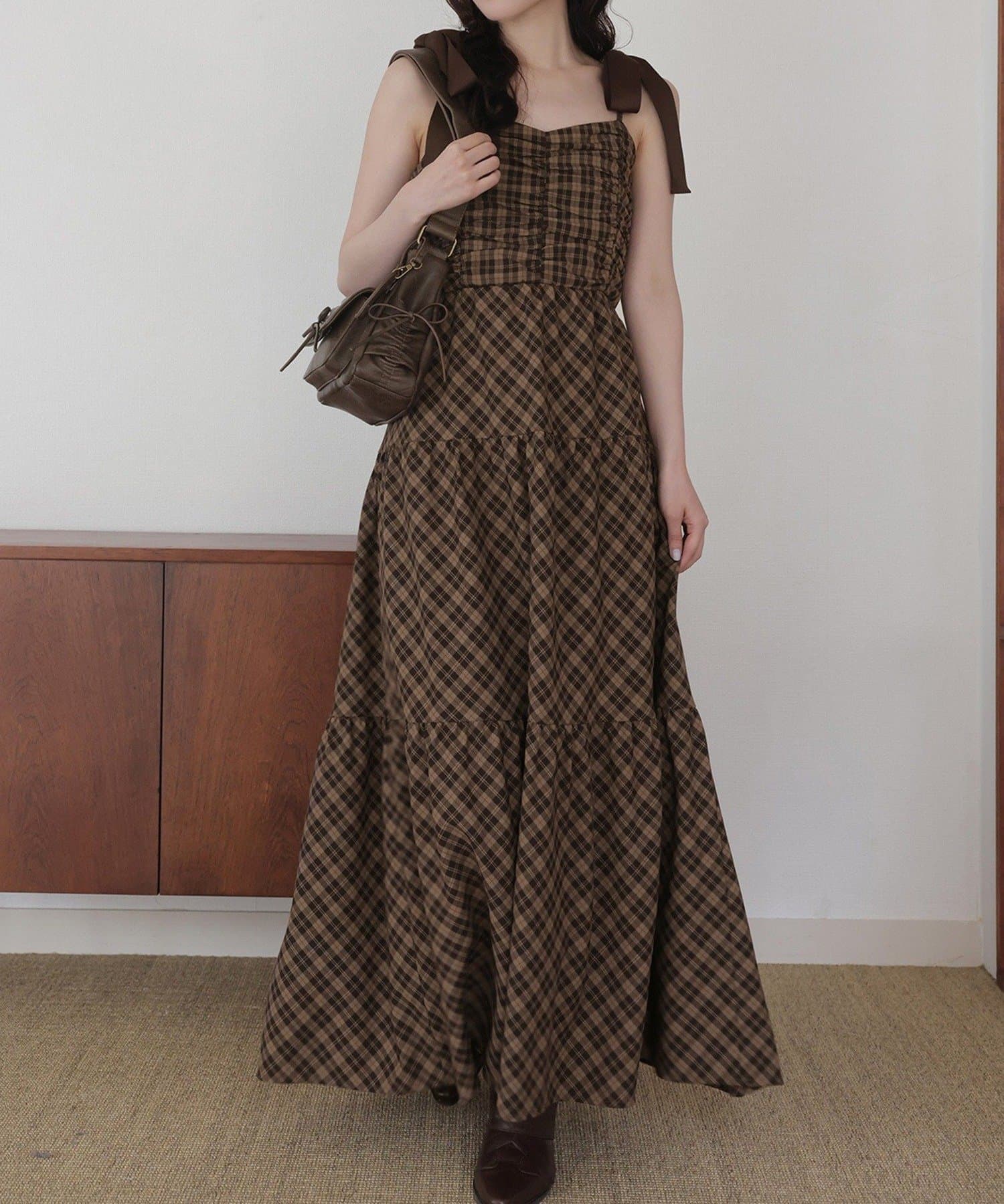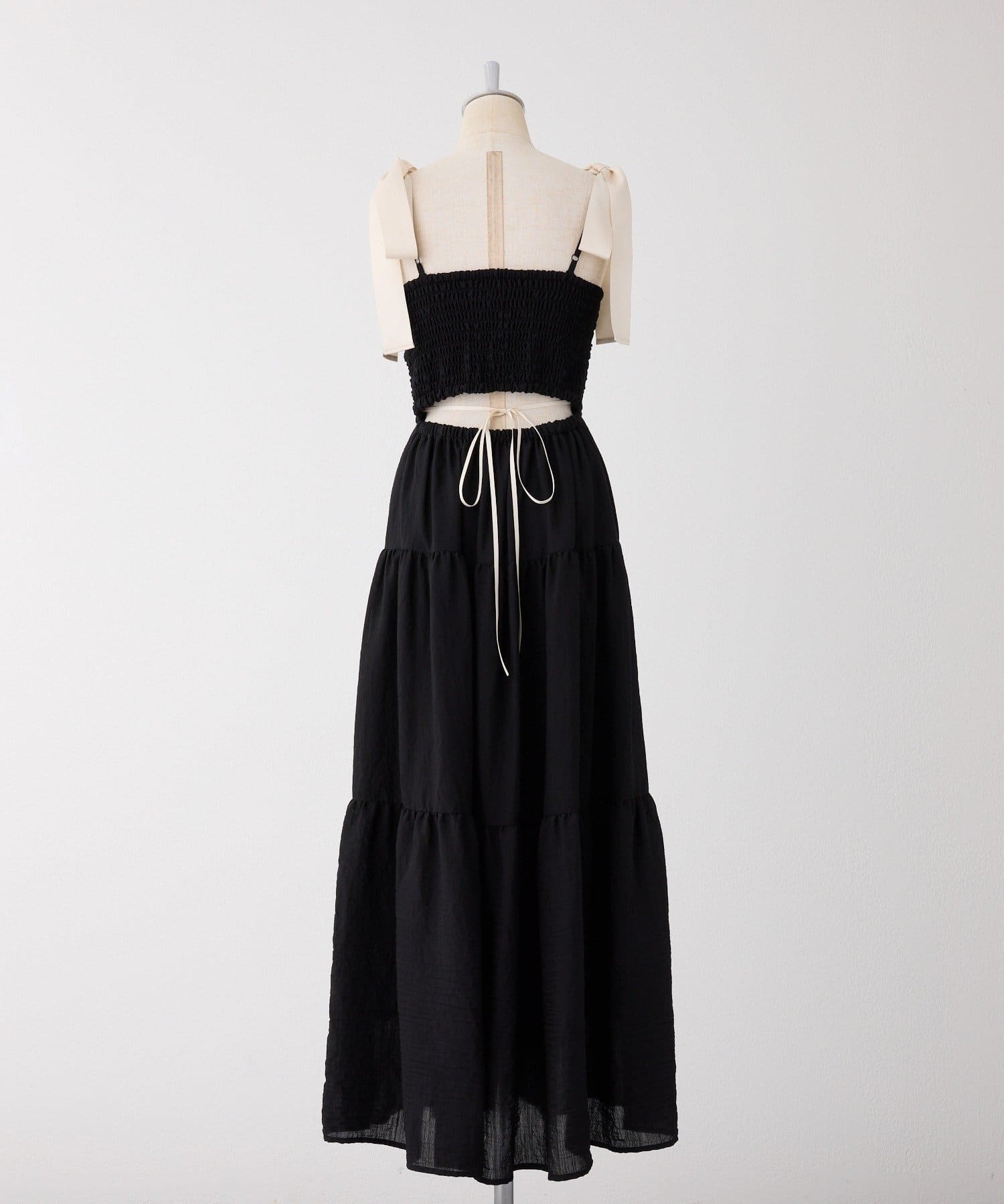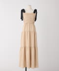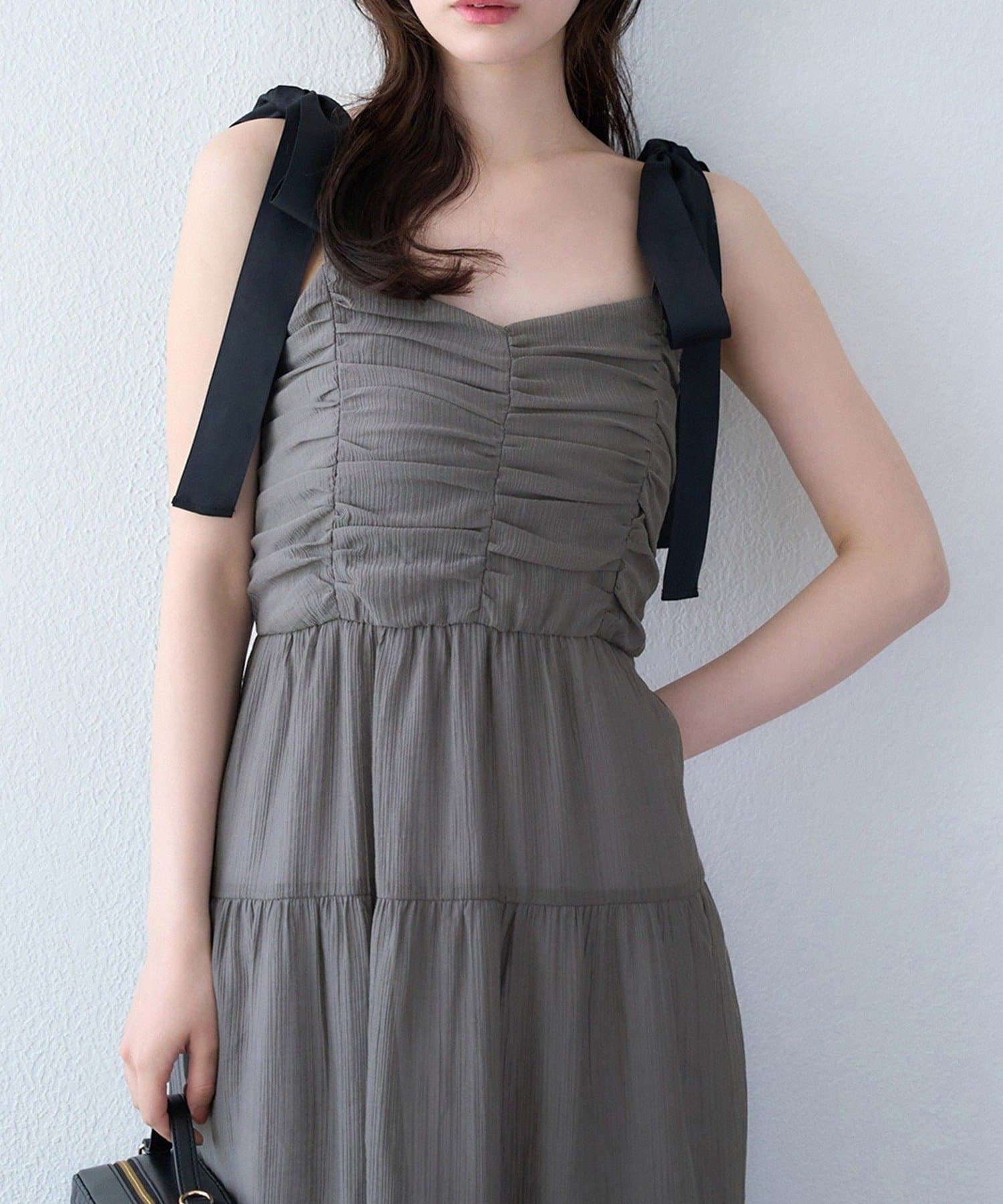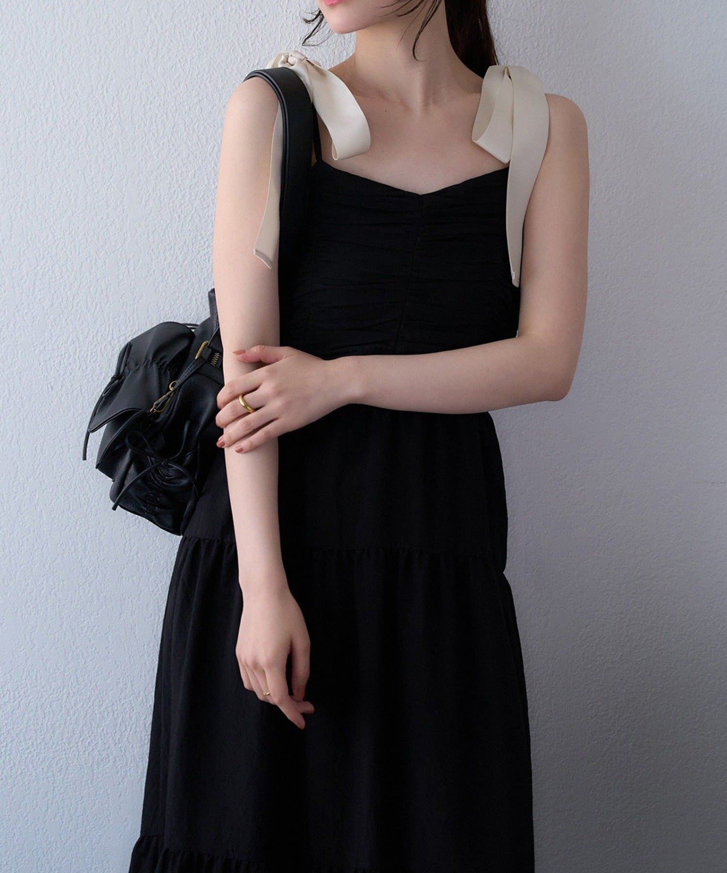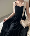 肩のリボンデザインがポイントのティアードロングワンピース。