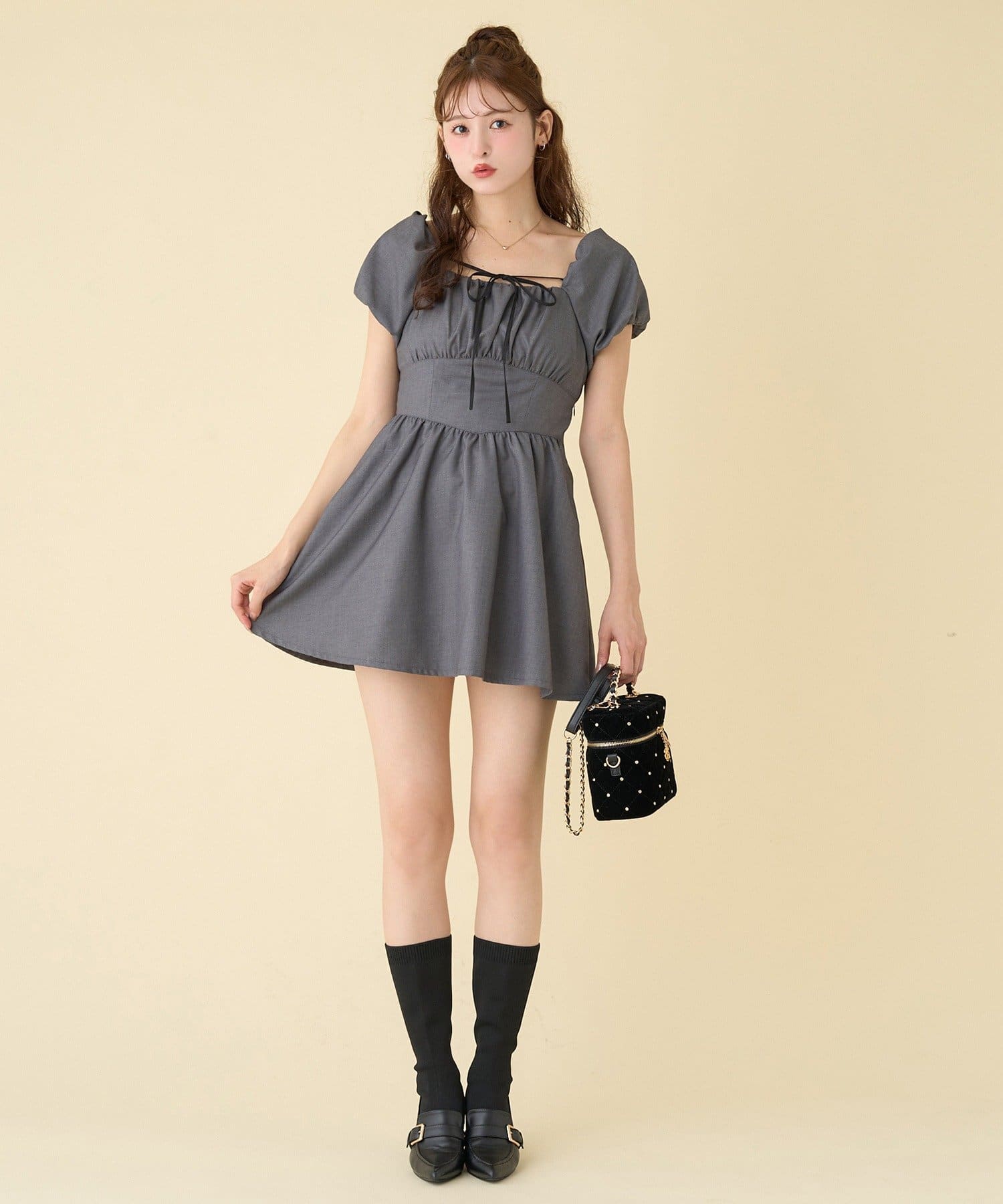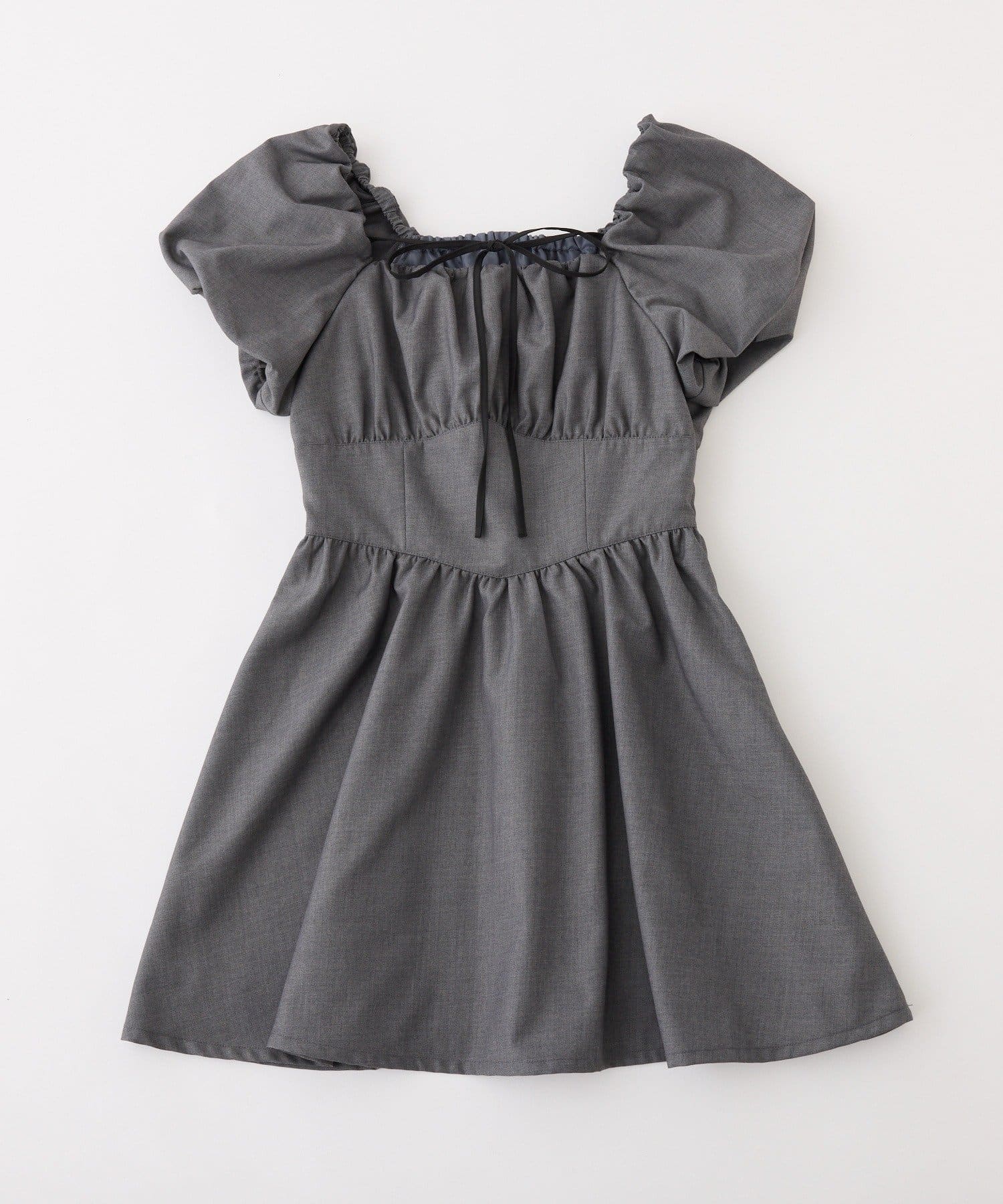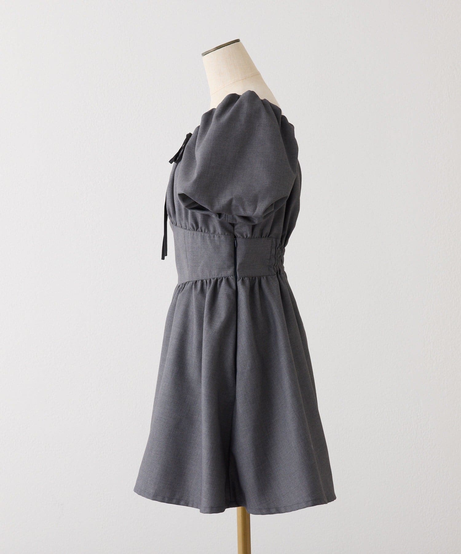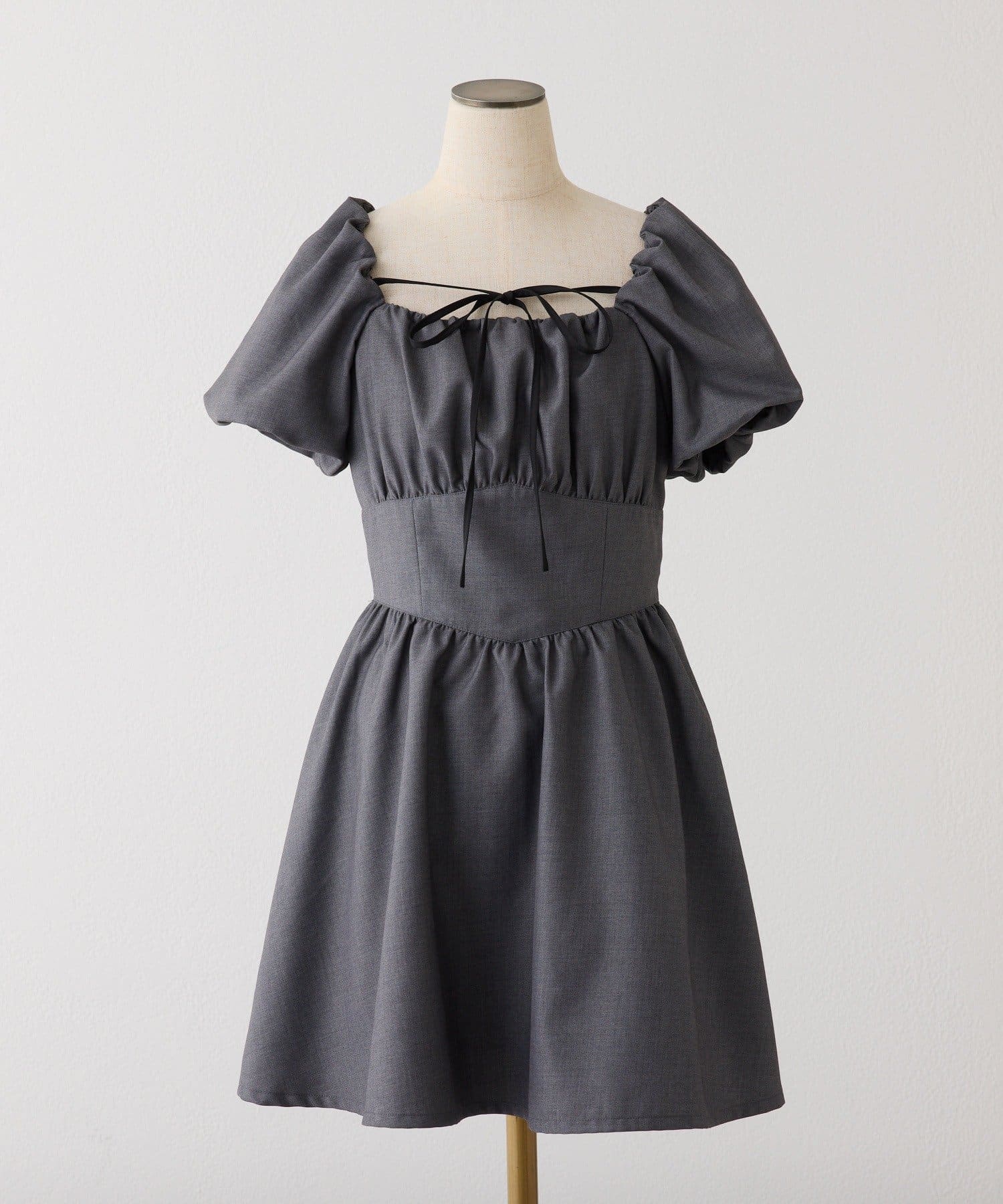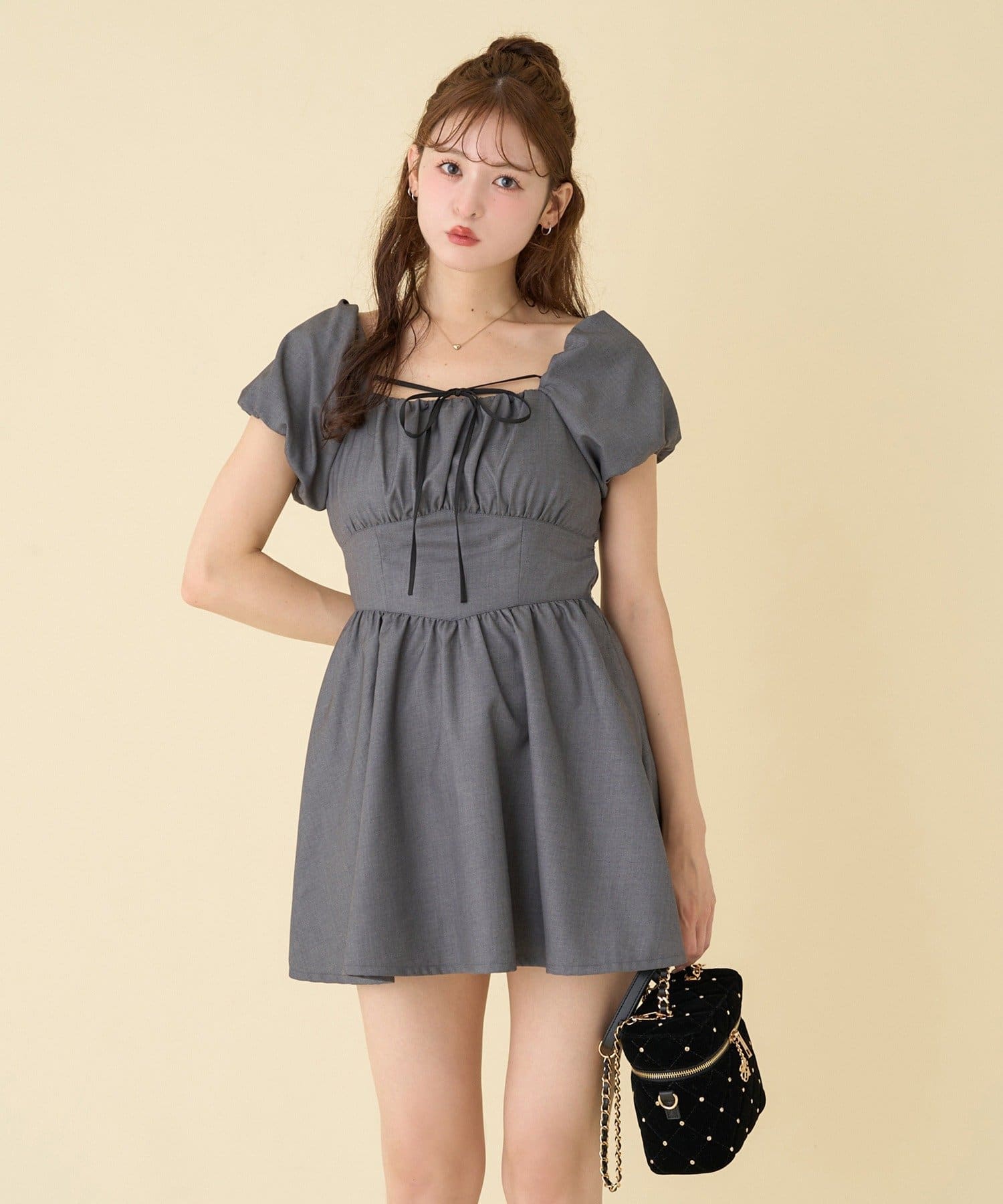 ふんわりとしたパフスリーブに、ウエストのコルセット風デザインを掛け合わせたミニワンピース。