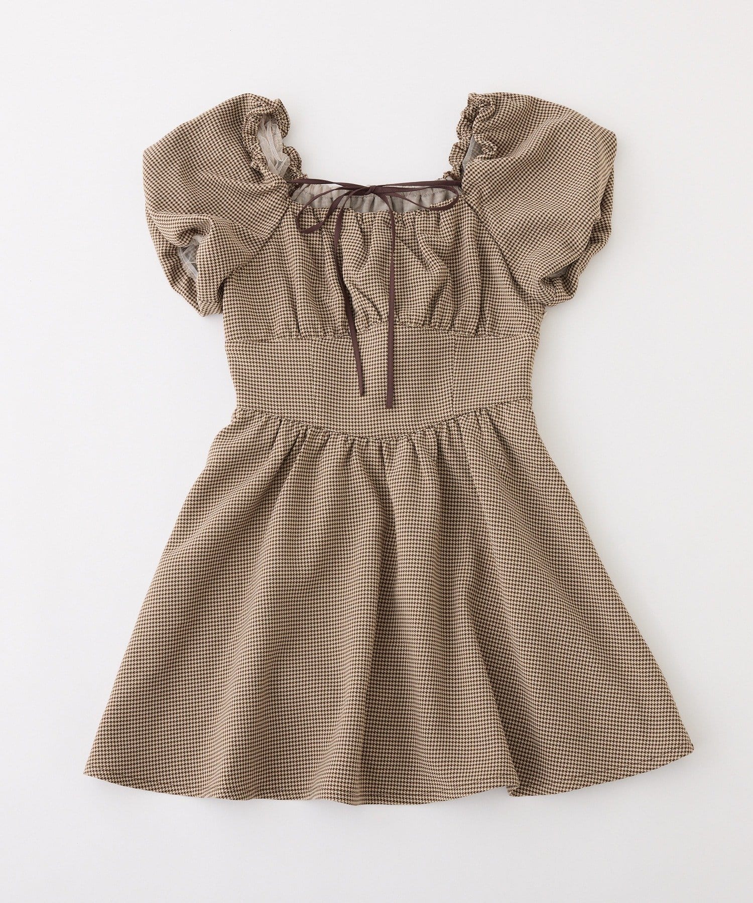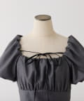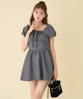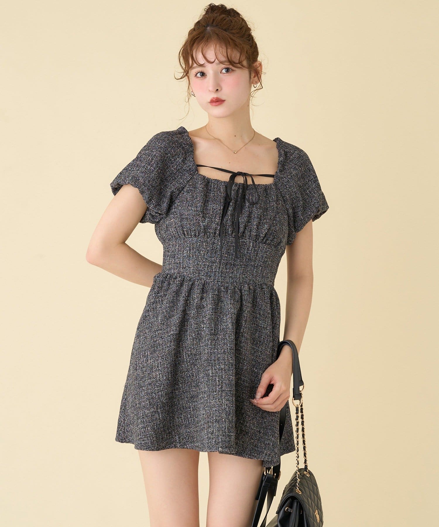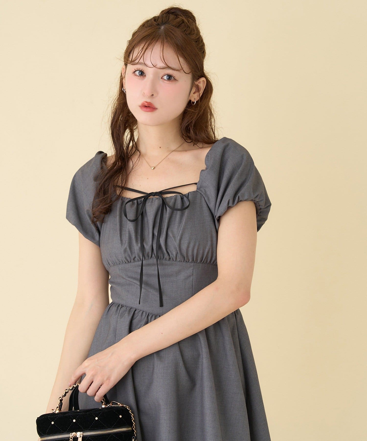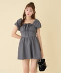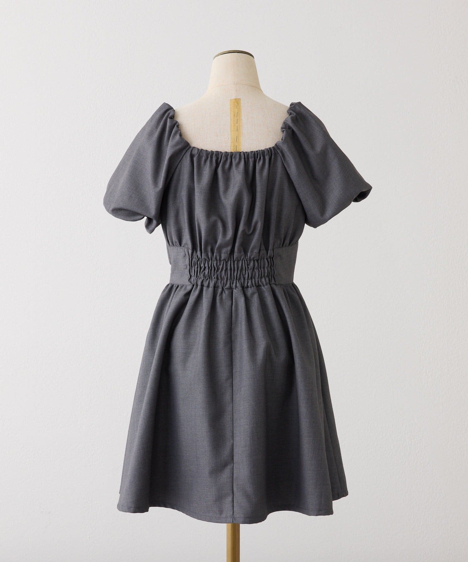 ふんわりとしたパフスリーブに、ウエストのコルセット風デザインを掛け合わせたミニワンピース。