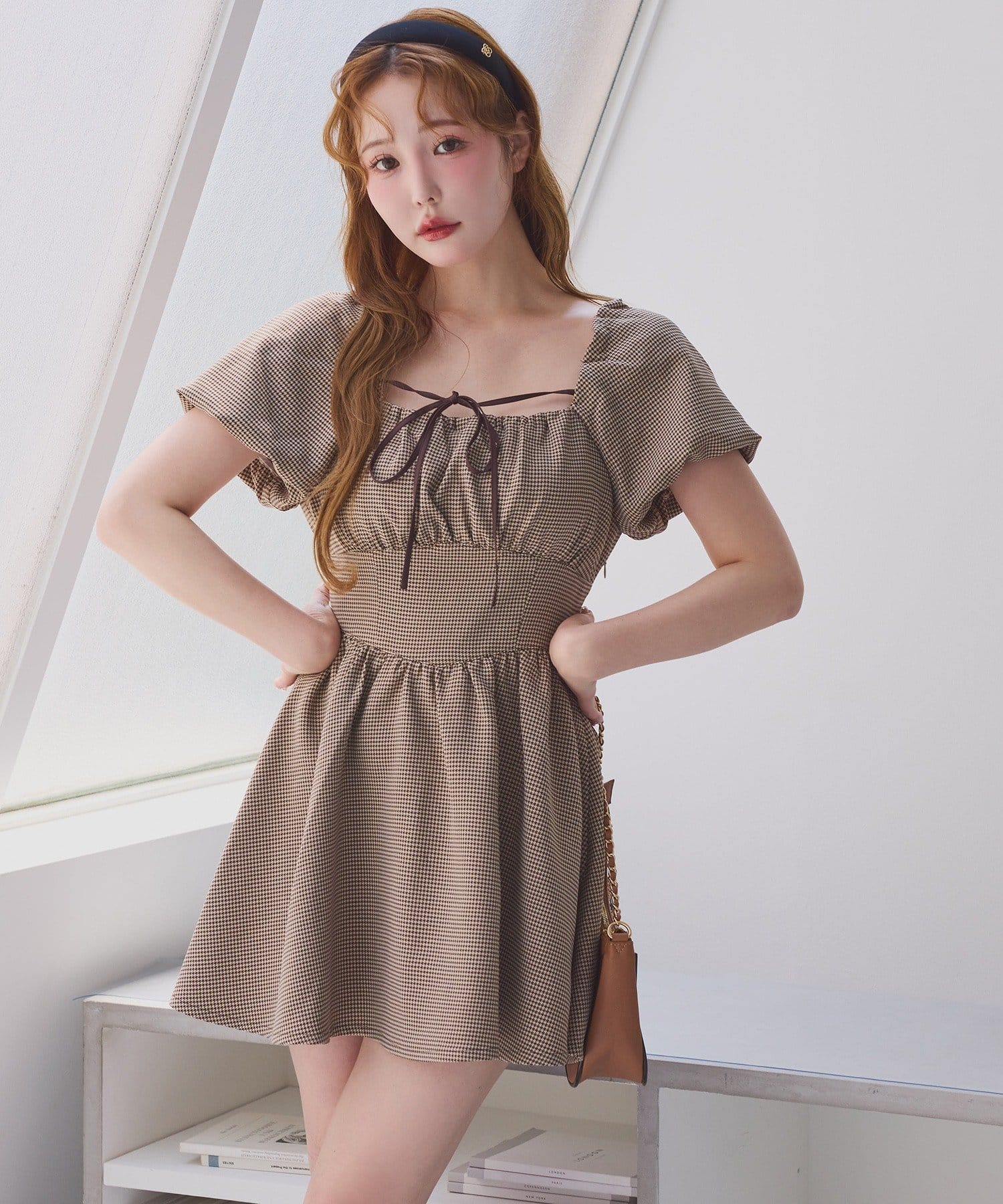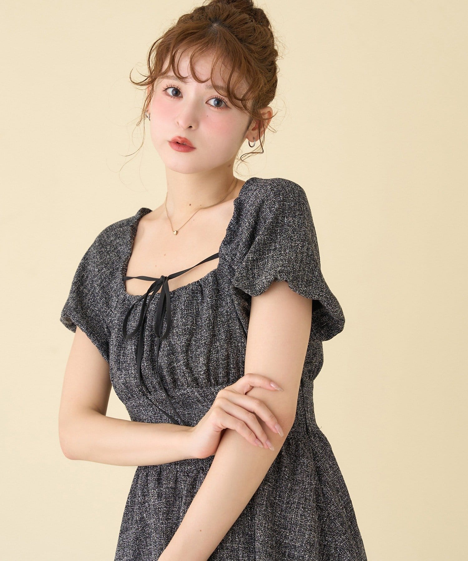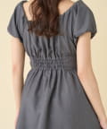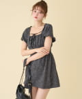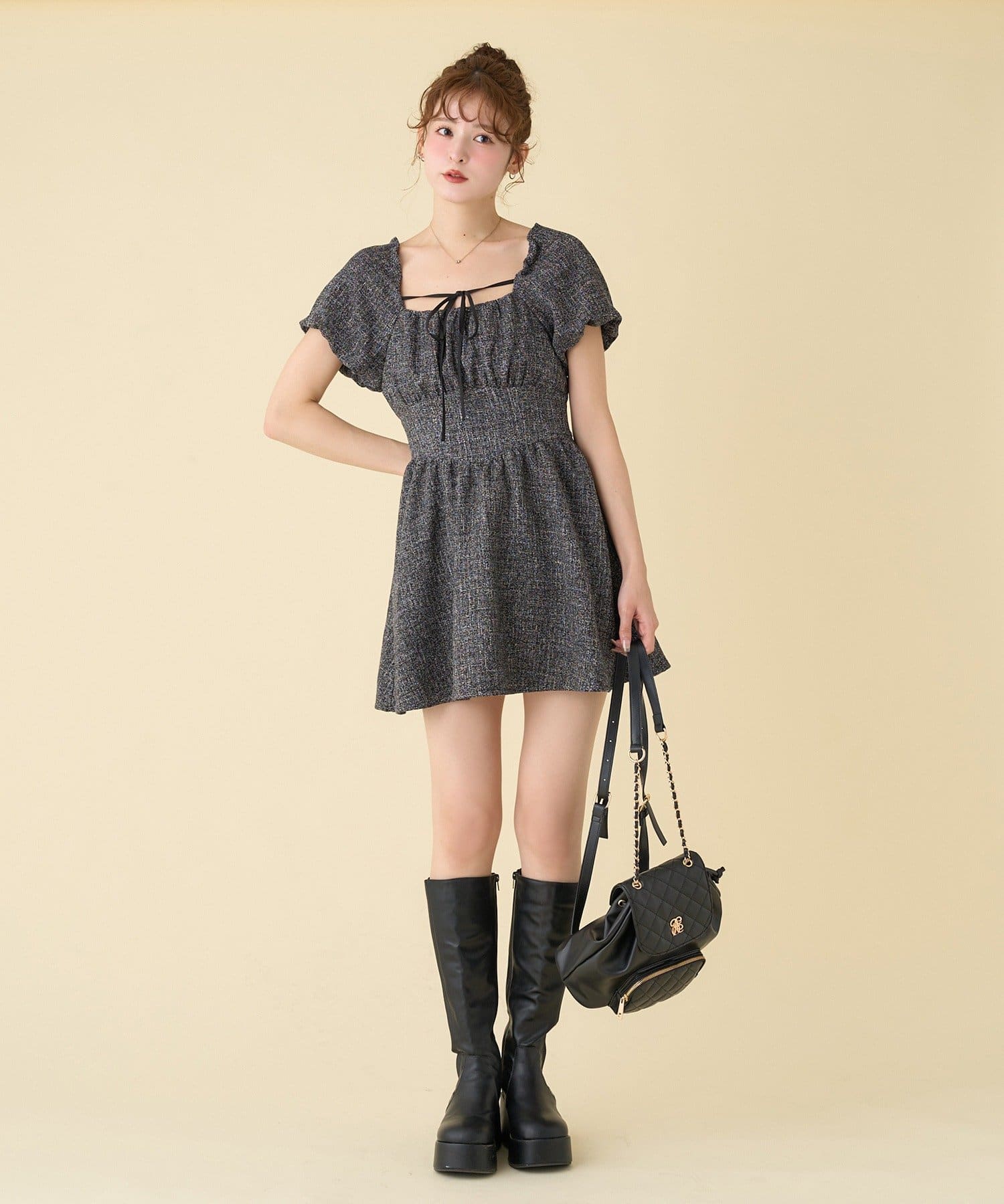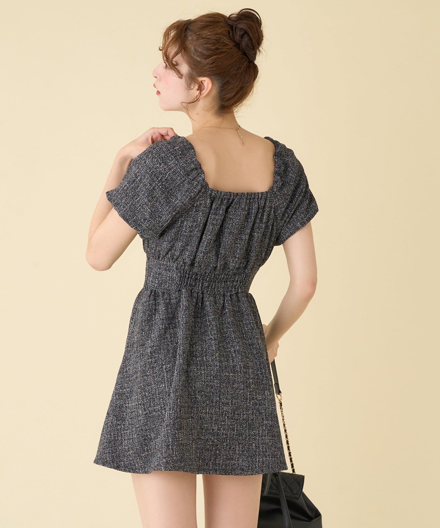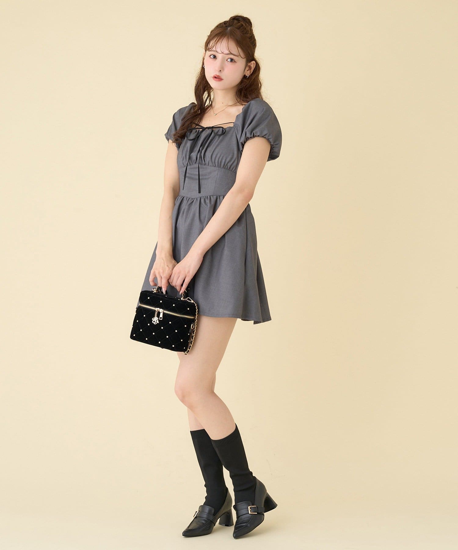 ふんわりとしたパフスリーブに、ウエストのコルセット風デザインを掛け合わせたミニワンピース。